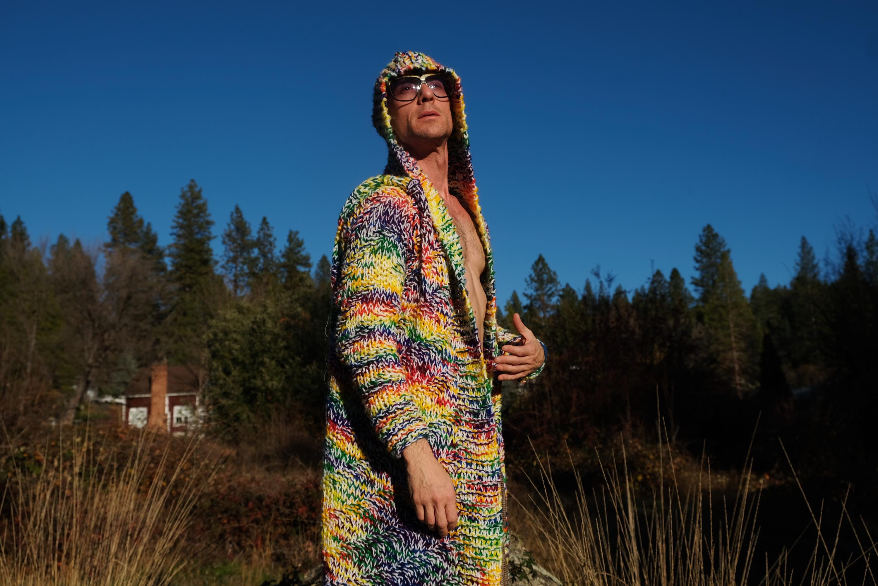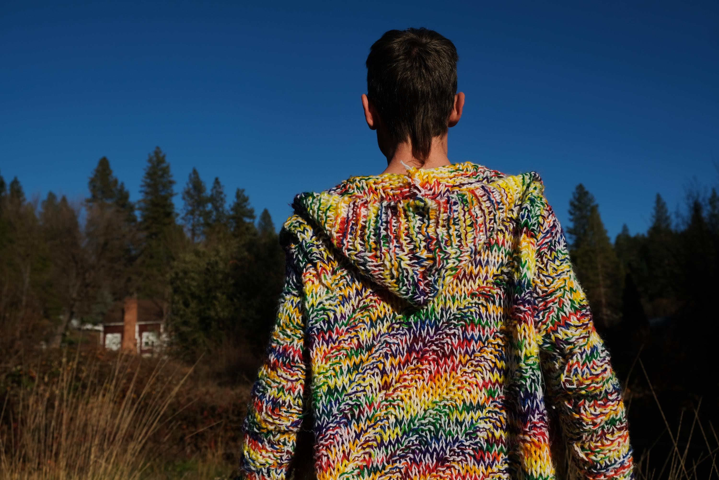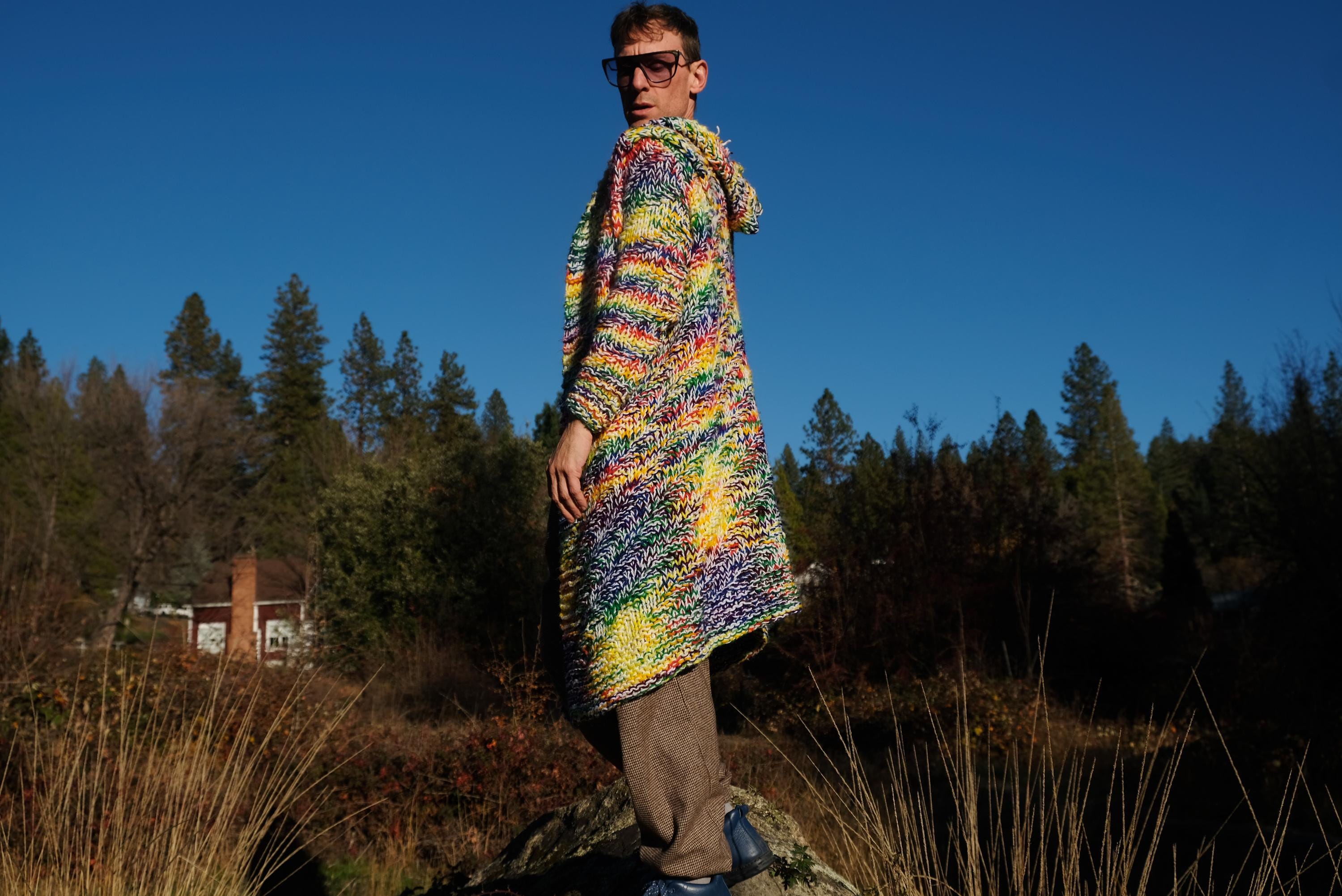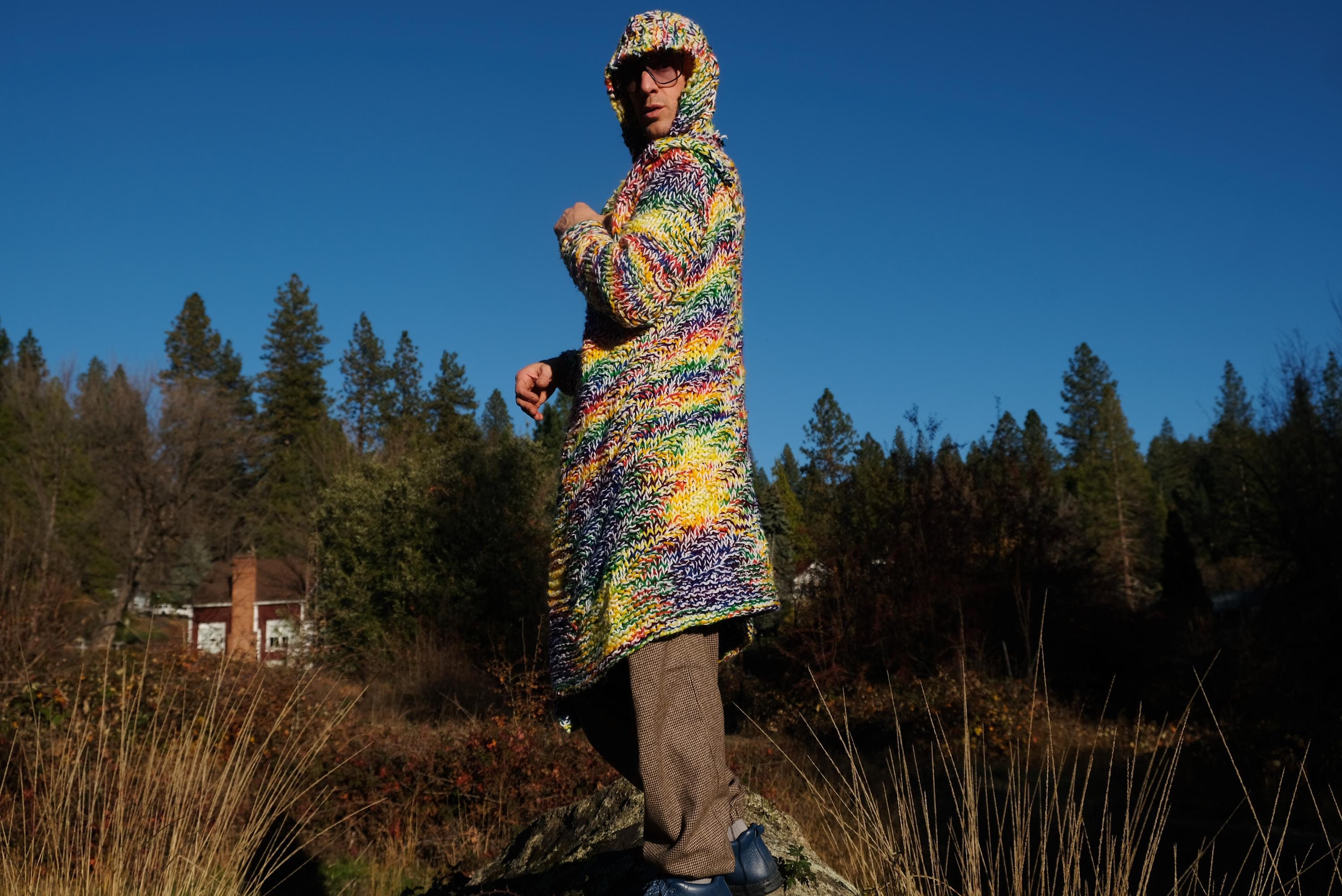 This is a chunky knit robe with a psychedelic wash of rainbow color. Beautifully up-cycled from an afghan blanket in 100% acrylic yarn, and hand tailored by yours truly, Lord von Schmitt.