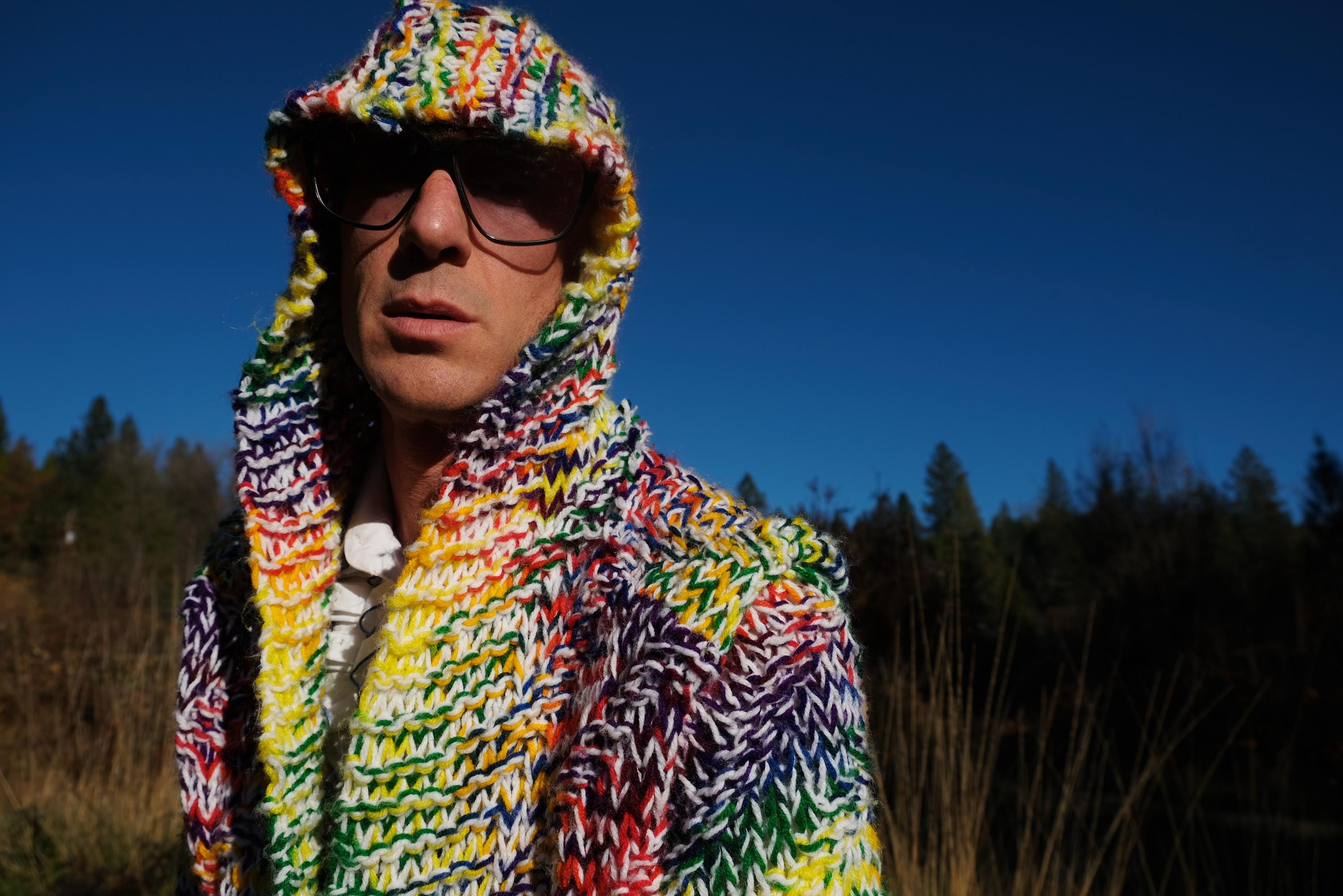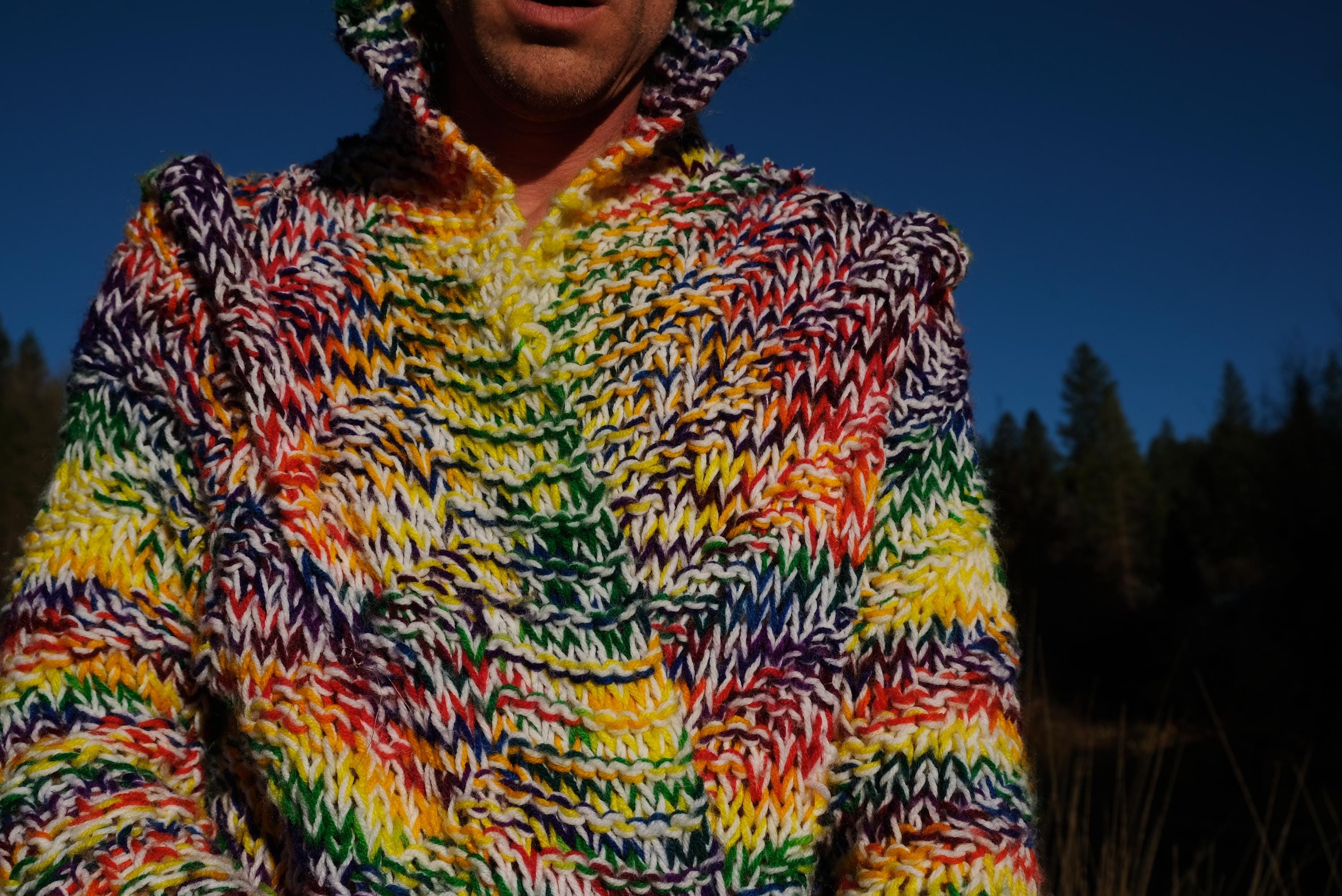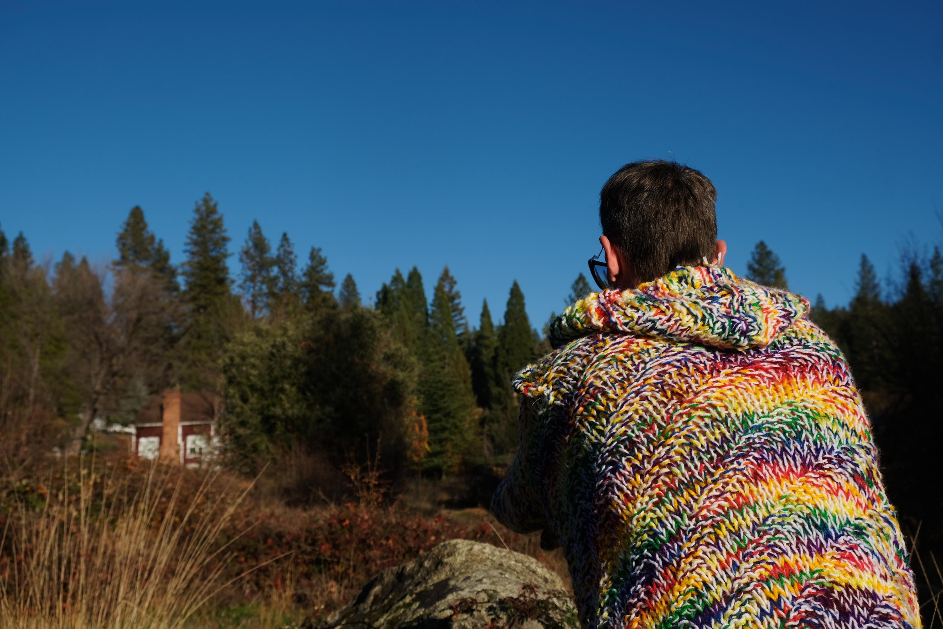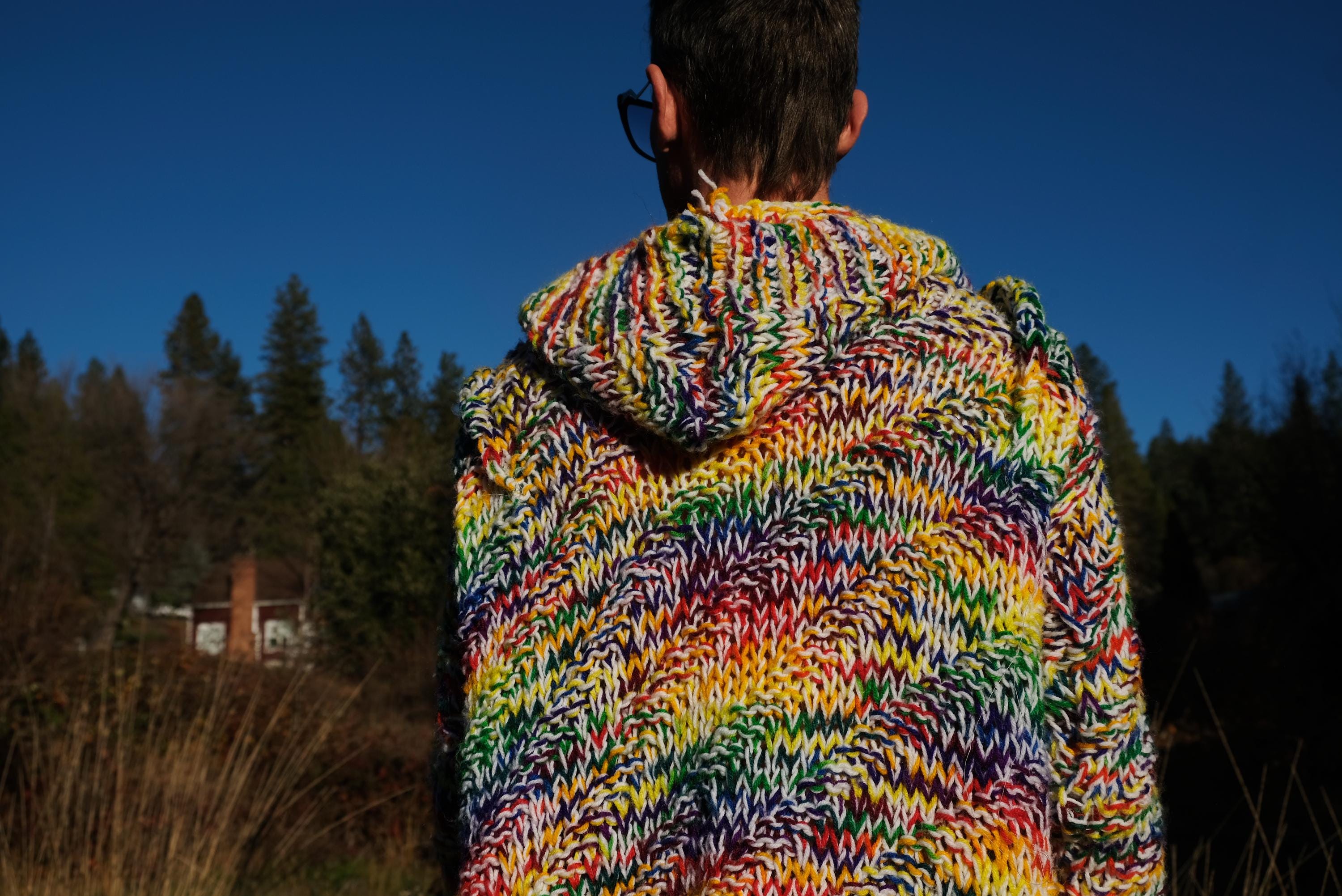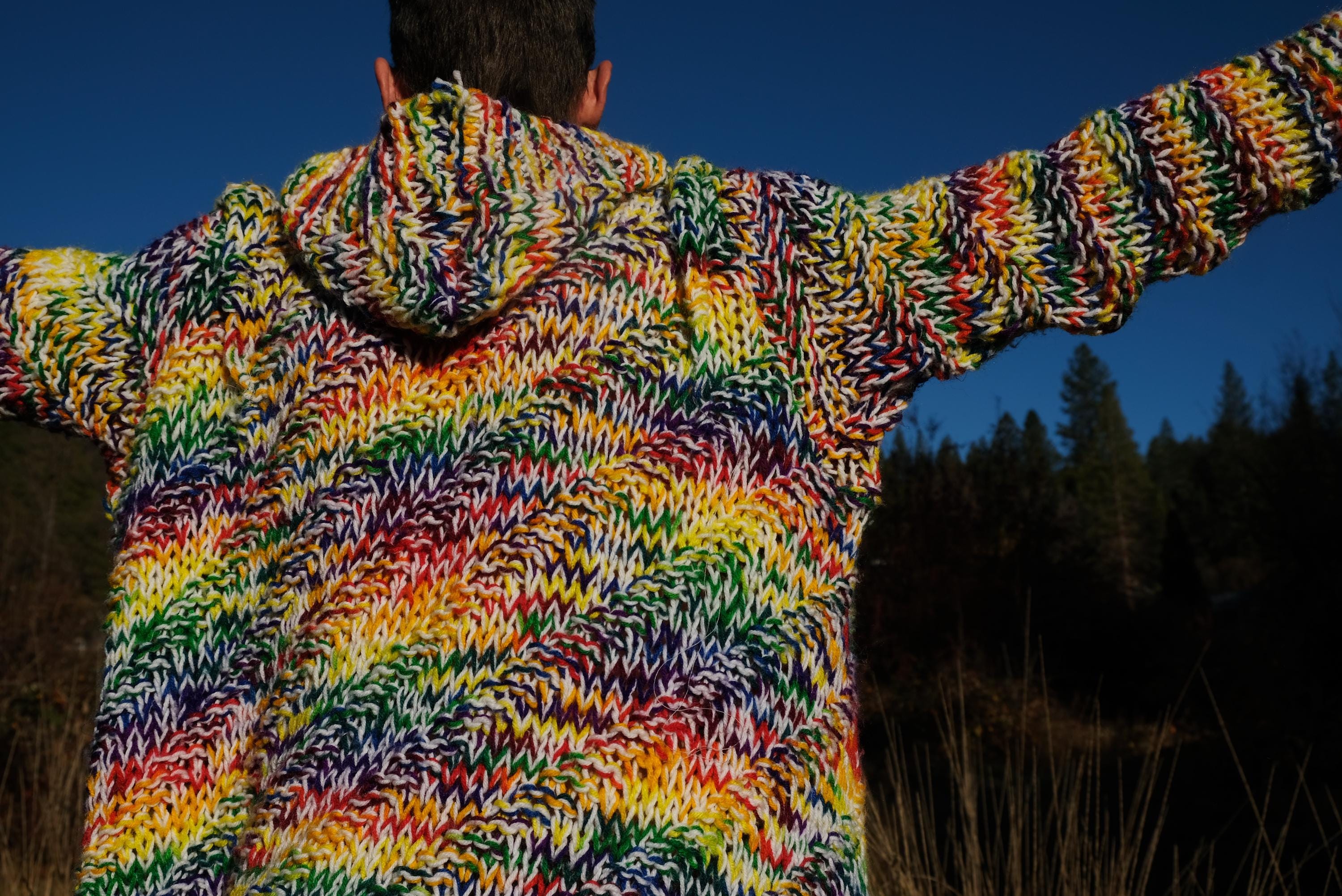 This is a chunky knit robe with a psychedelic wash of rainbow color. Beautifully up-cycled from an afghan blanket in 100% acrylic yarn, and hand tailored by yours truly, Lord von Schmitt.