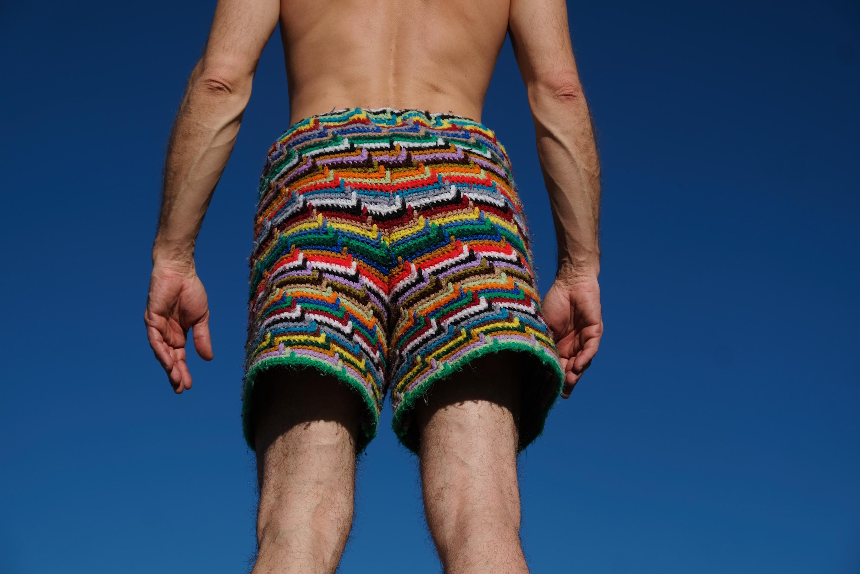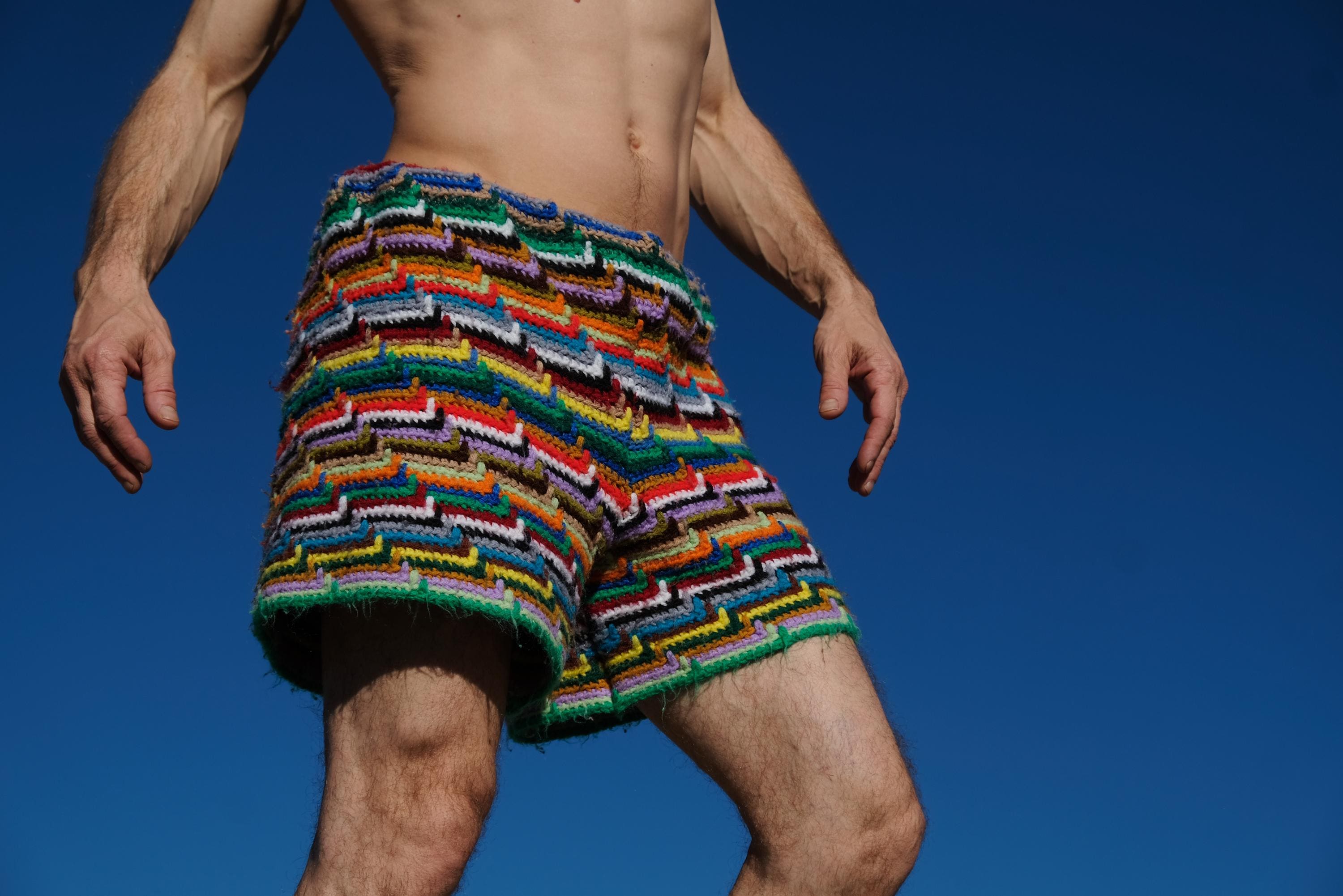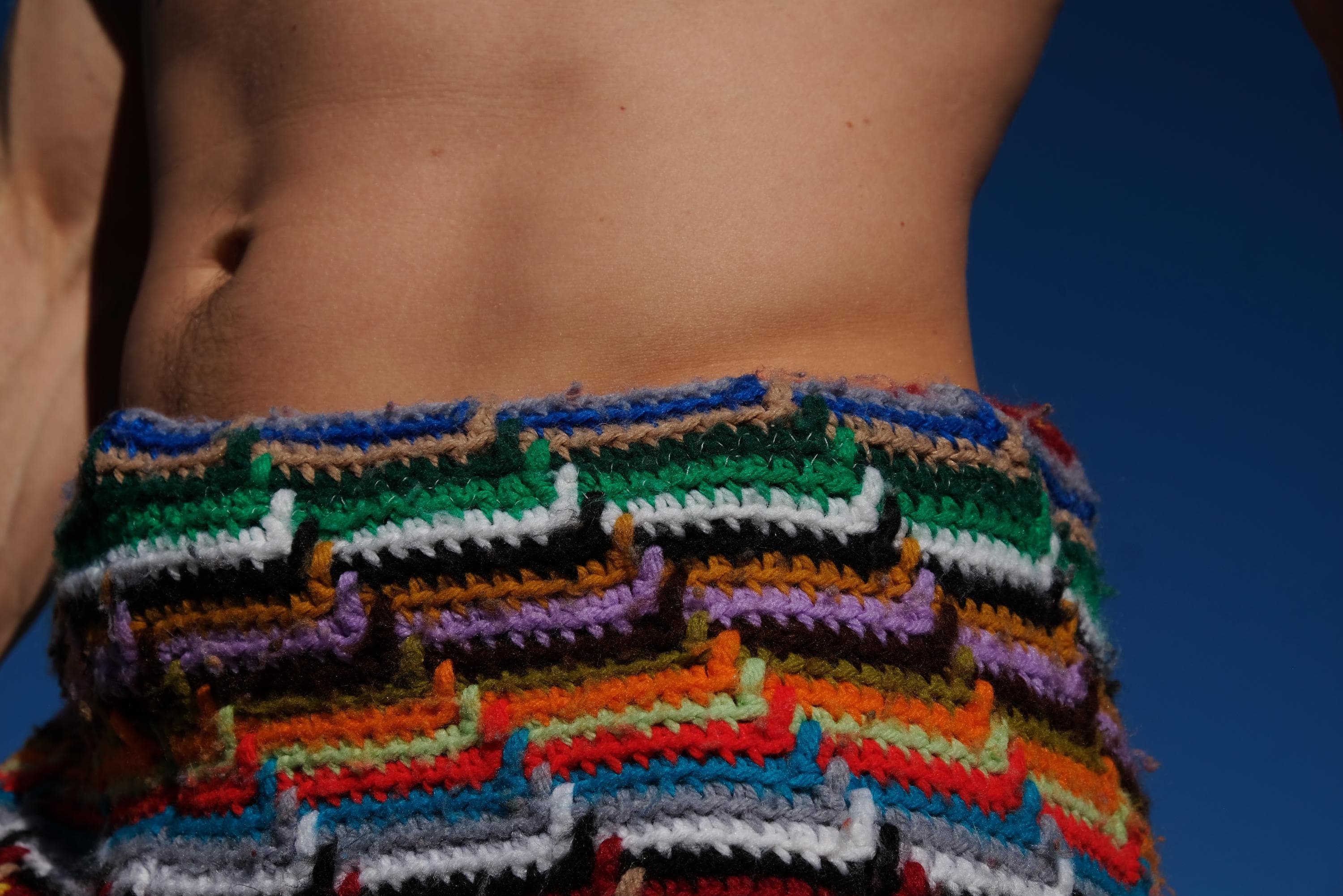 These are crochet shorts in multicolored stripes. Repurposed from a vintage afghan blanket crocheted in 100% acrylic yarn.