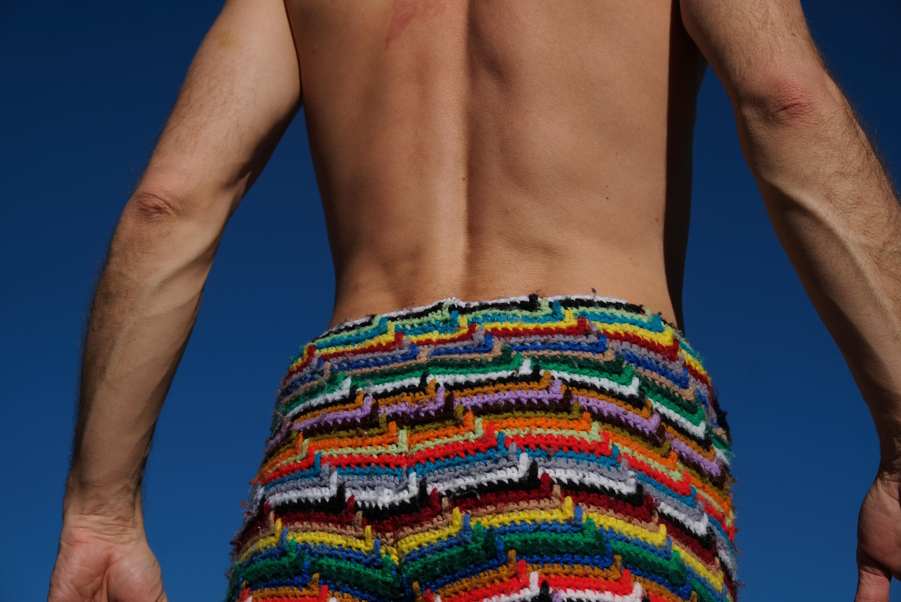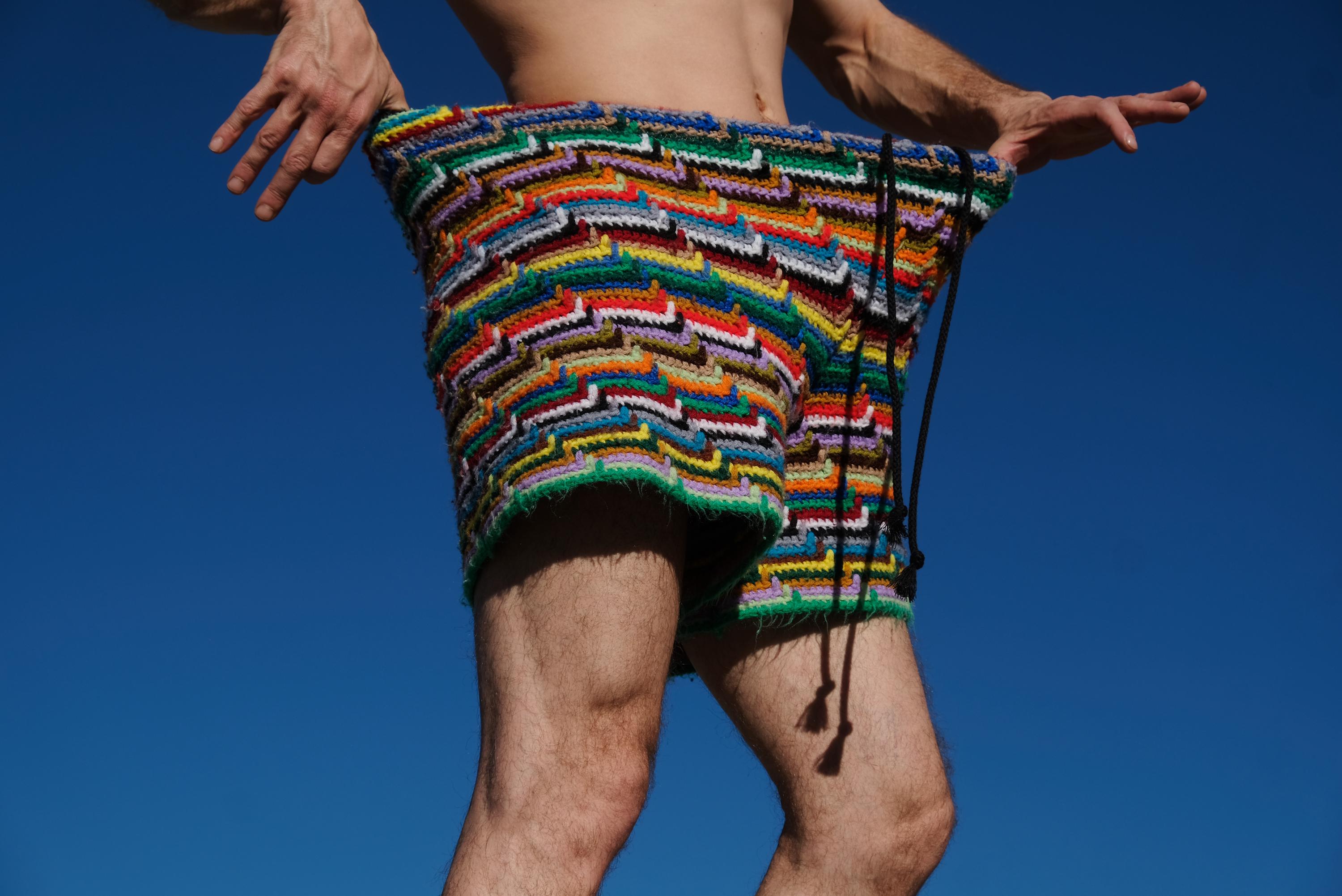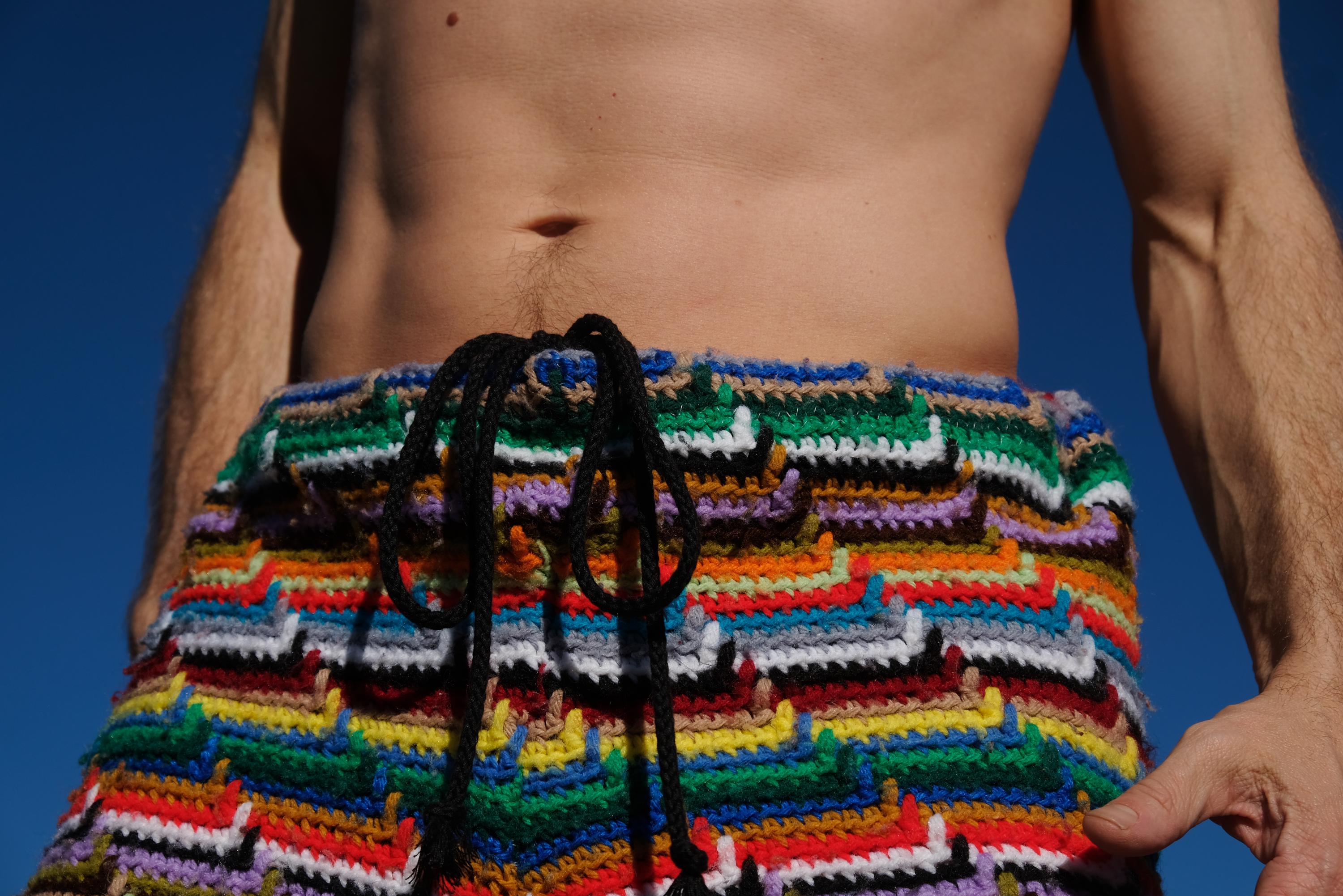 These are crochet shorts in multicolored stripes. Repurposed from a vintage afghan blanket crocheted in 100% acrylic yarn.