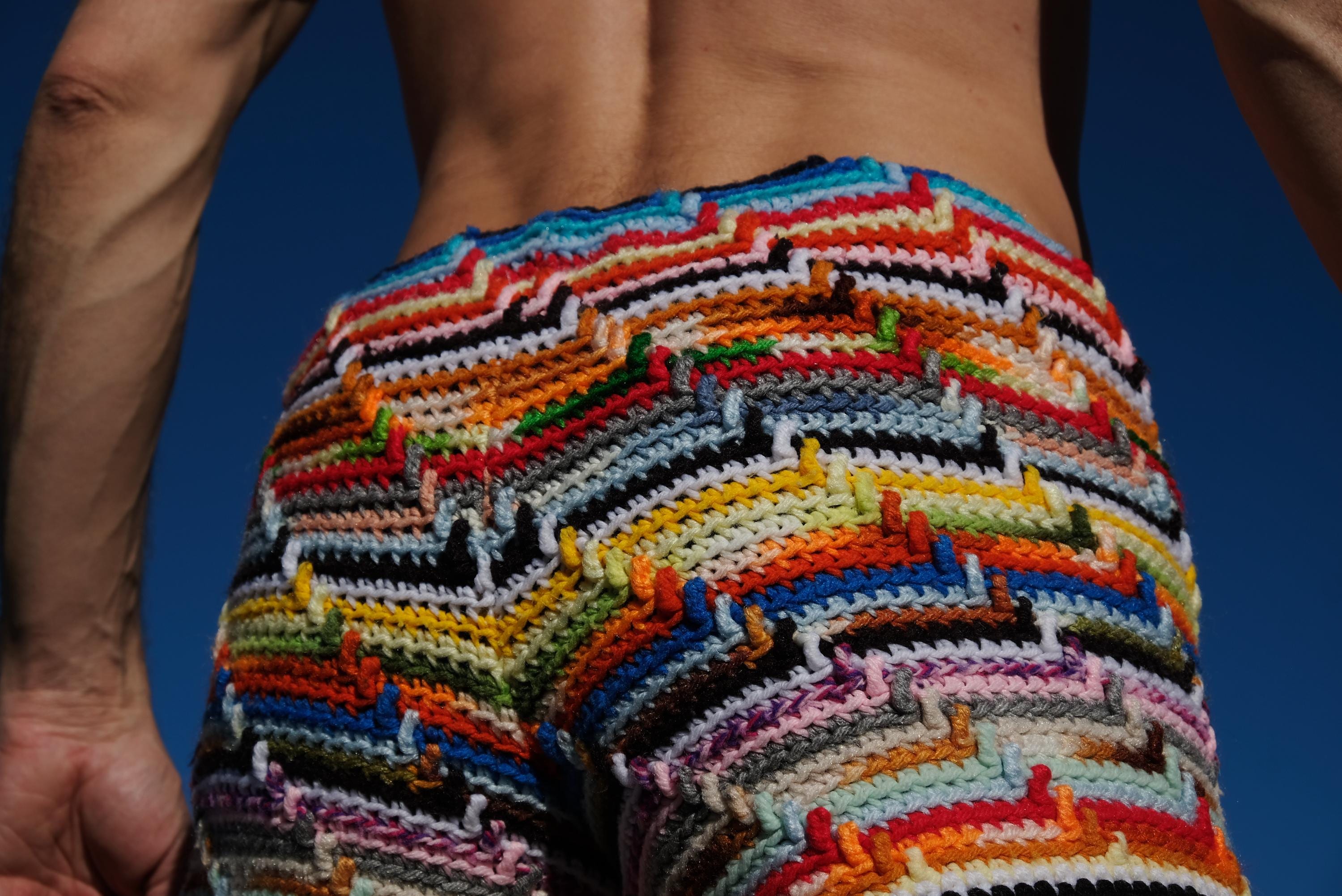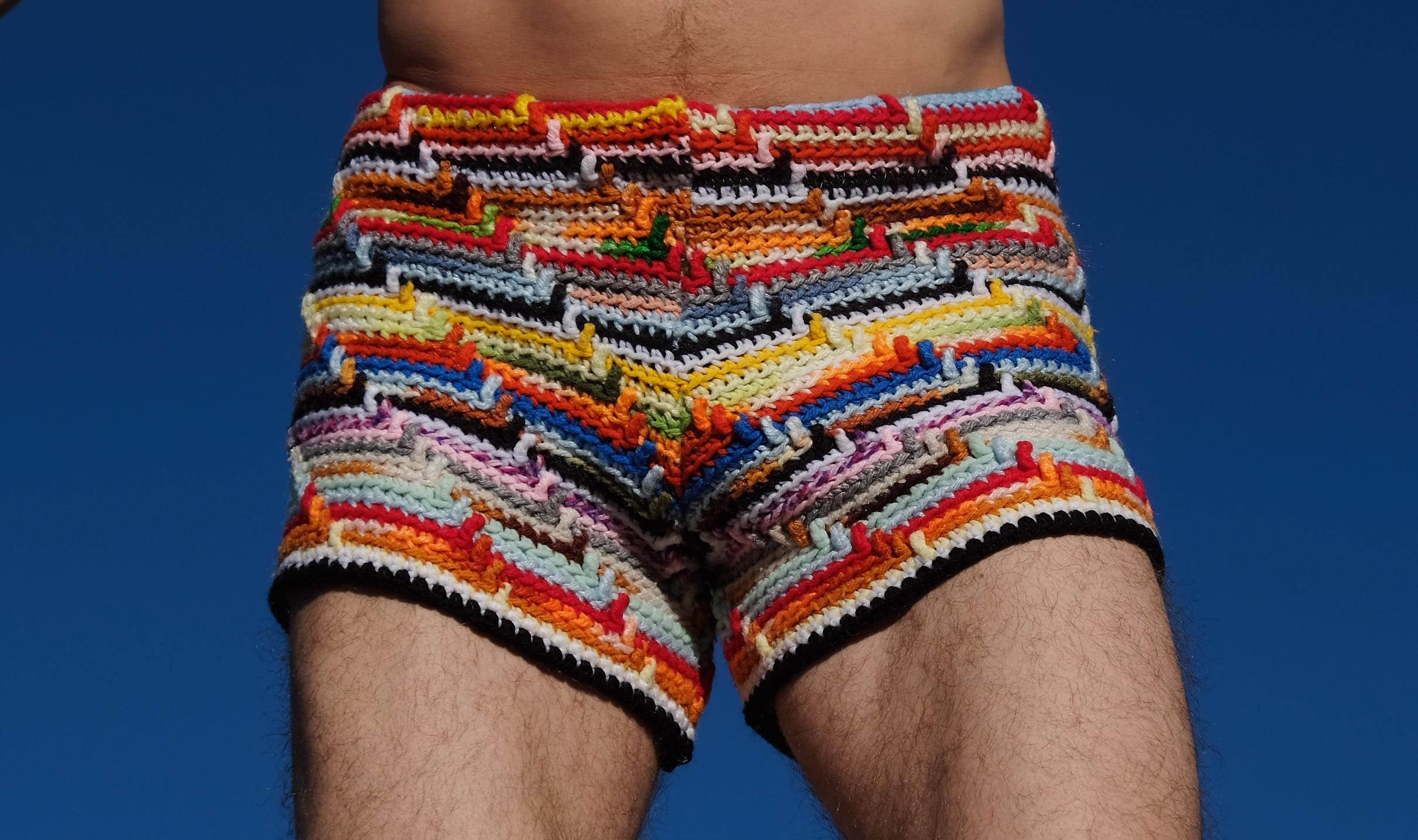 These are crochet shorts in multicolored stripes. Repurposed from a vintage afghan blanket crocheted in 100% acrylic yarn.