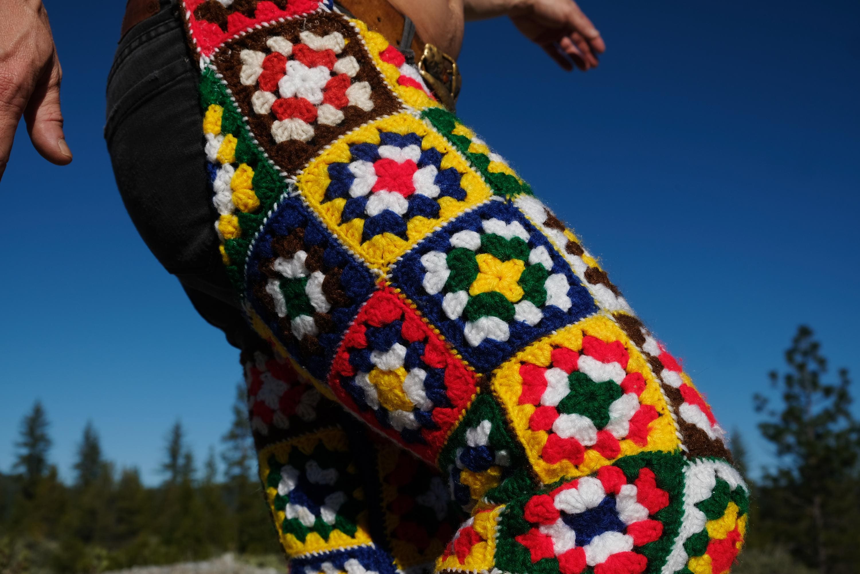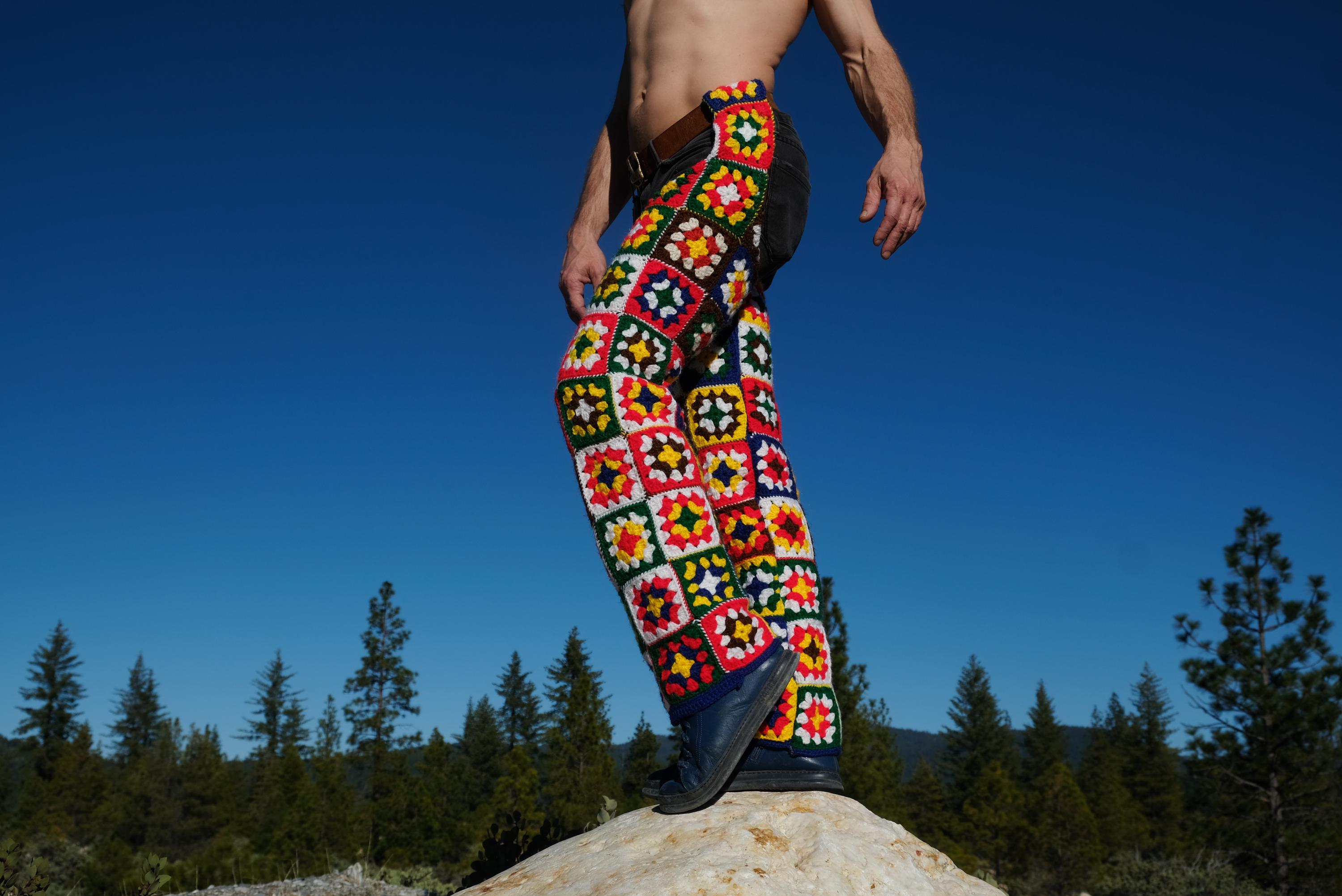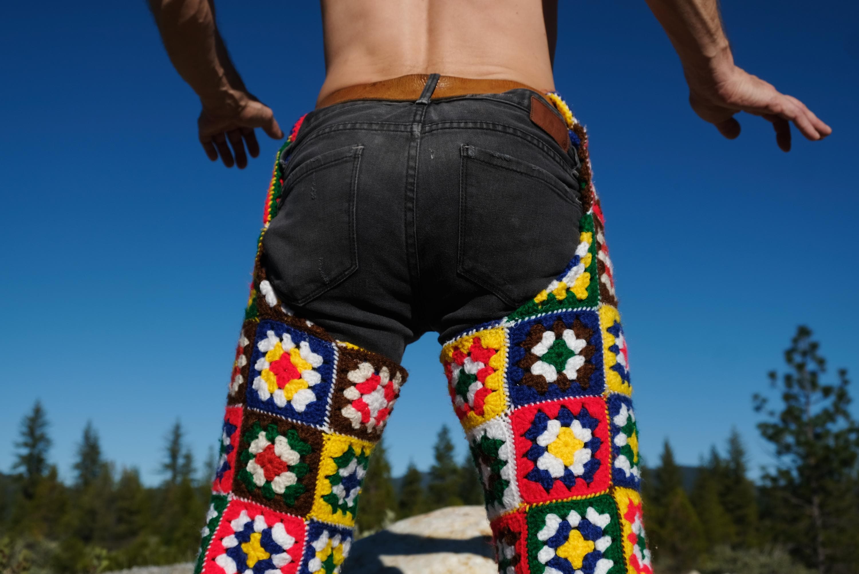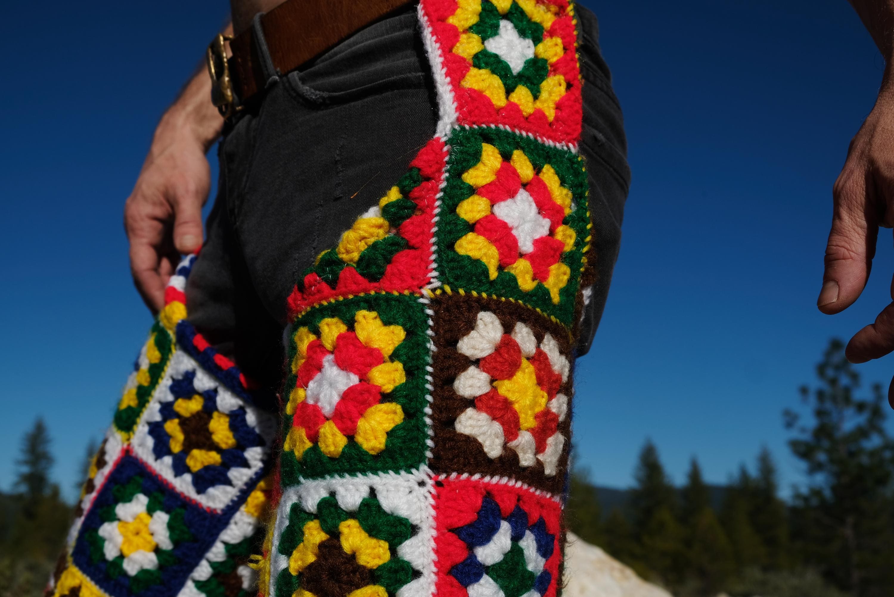 These are crochet chaps with multicolor squares. Fashioned from a vintage afghan blanket crocheted in 100% acrylic yarn.