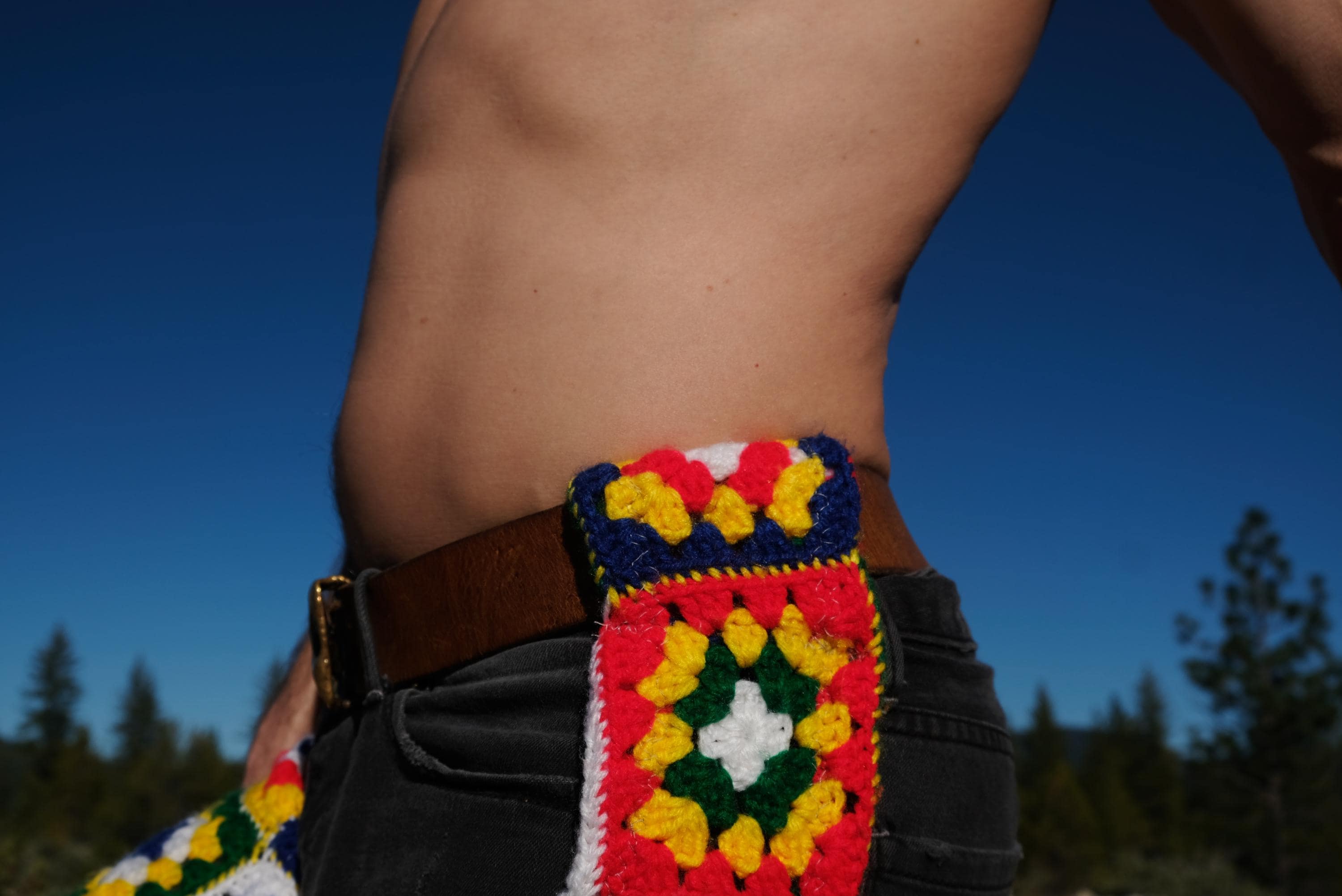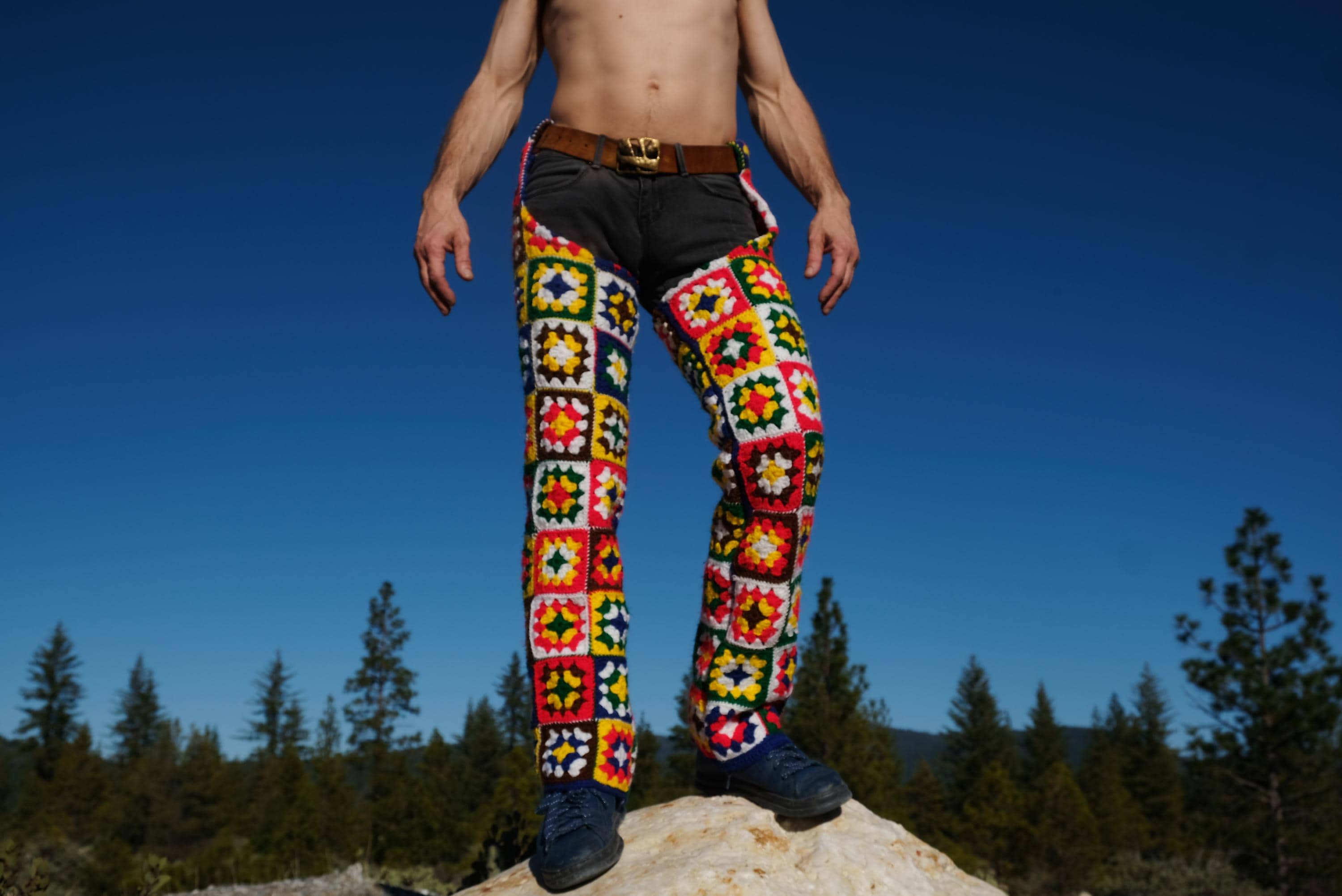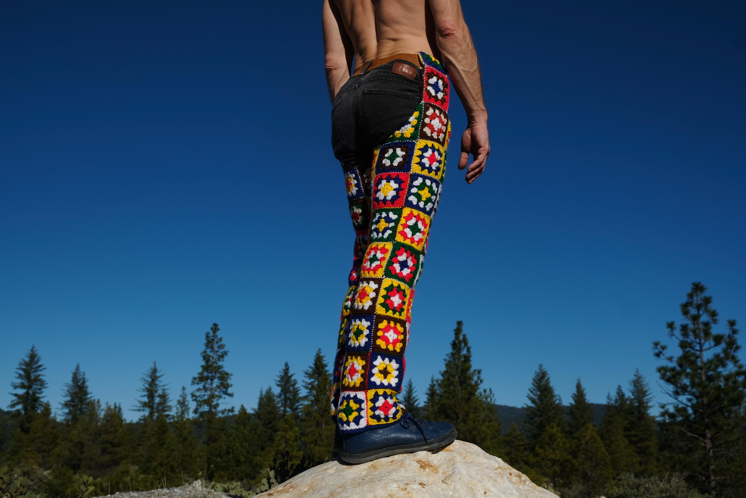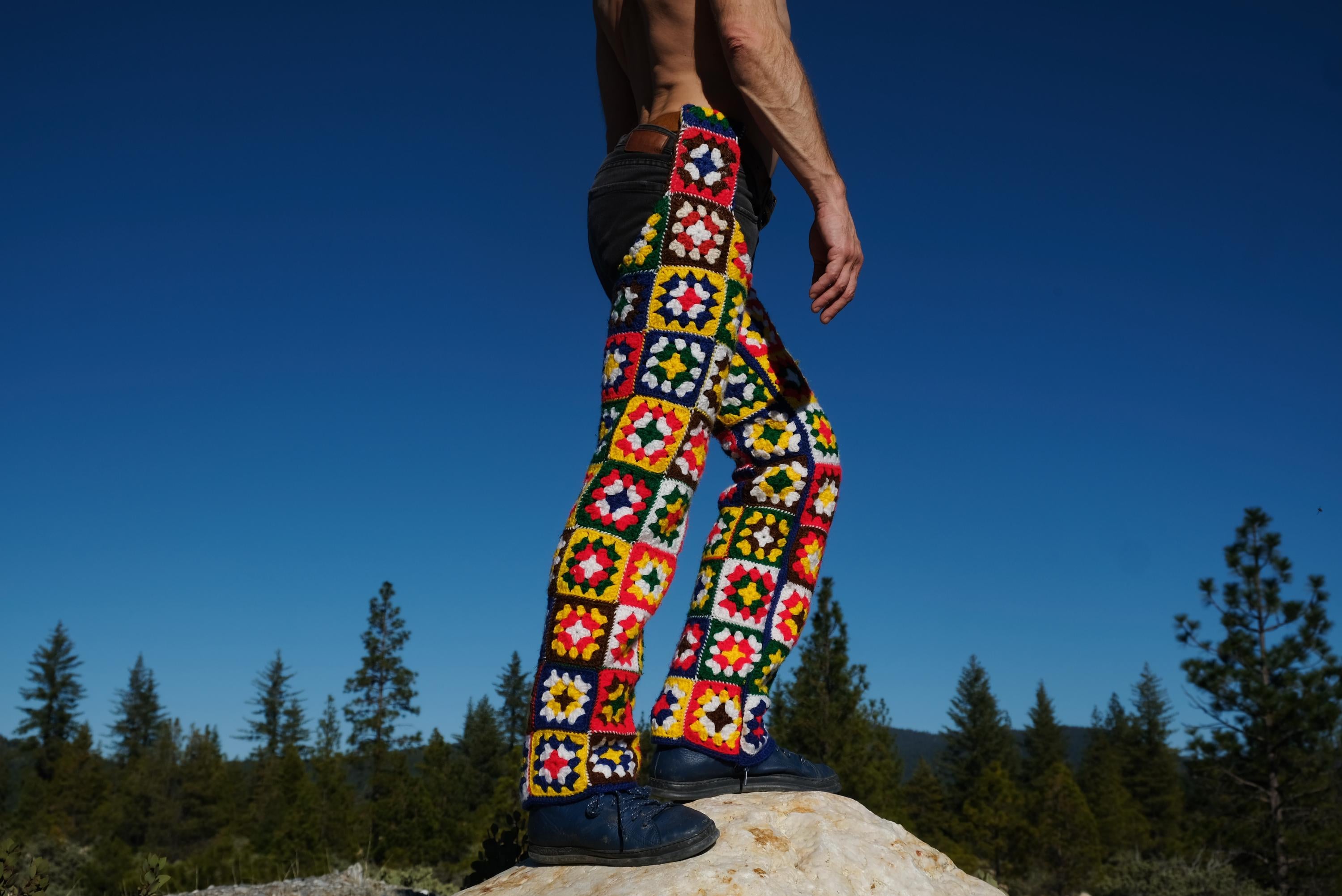 These are crochet chaps with multicolor squares. Fashioned from a vintage afghan blanket crocheted in 100% acrylic yarn.