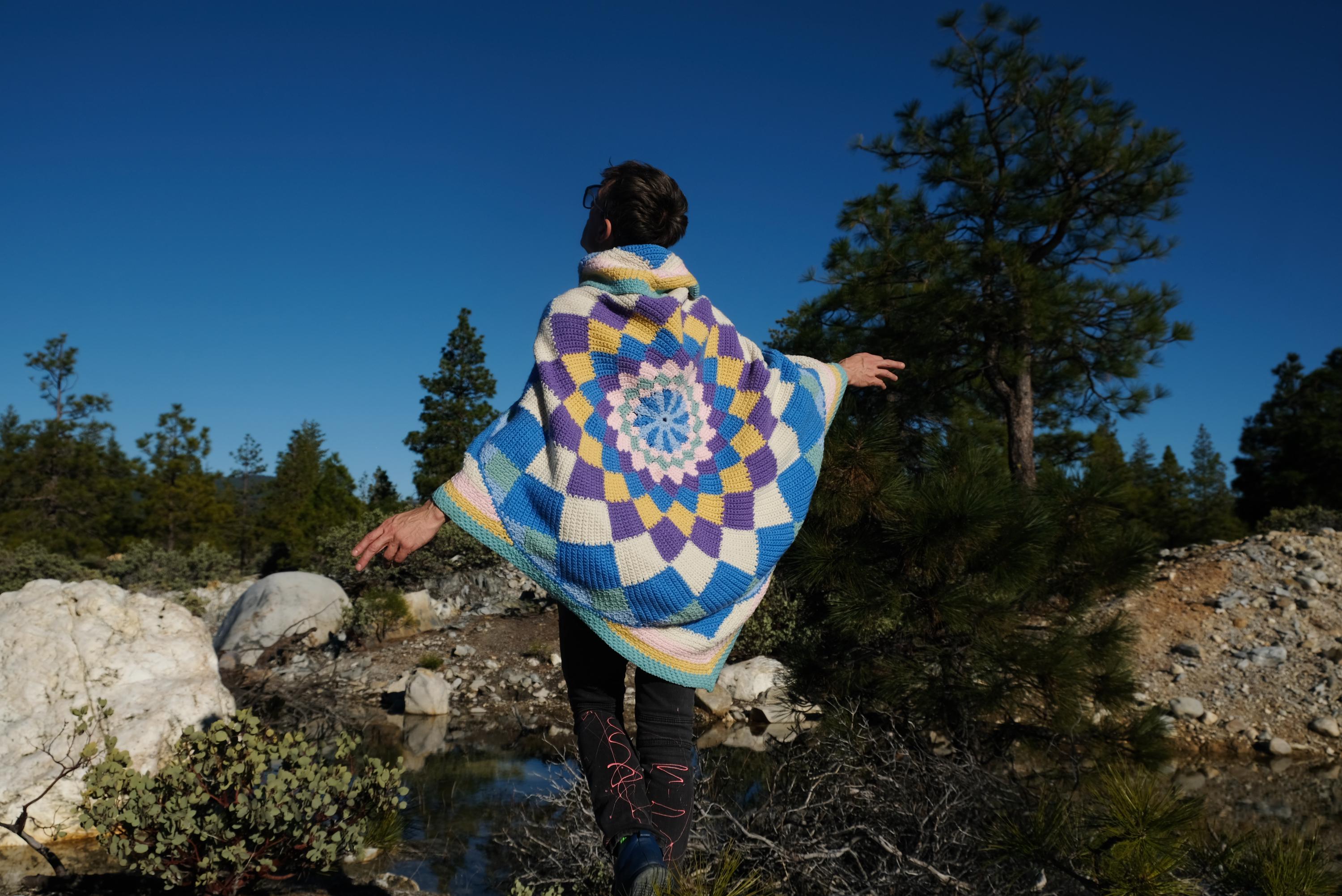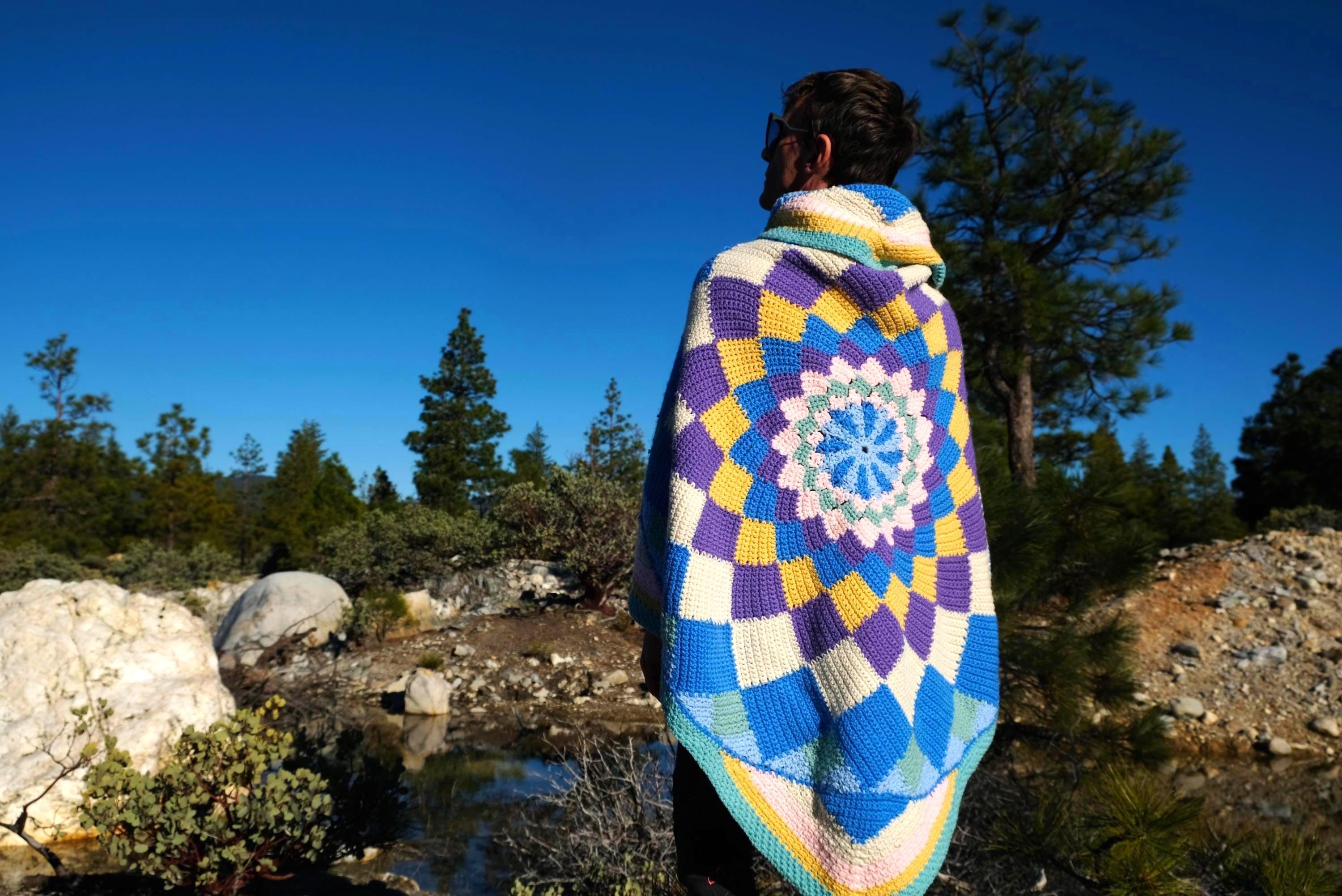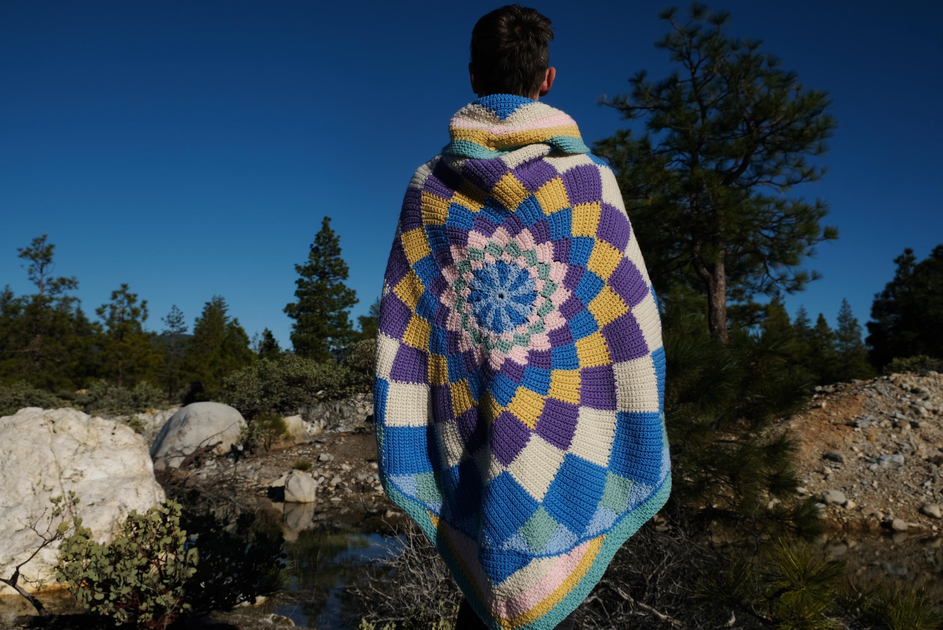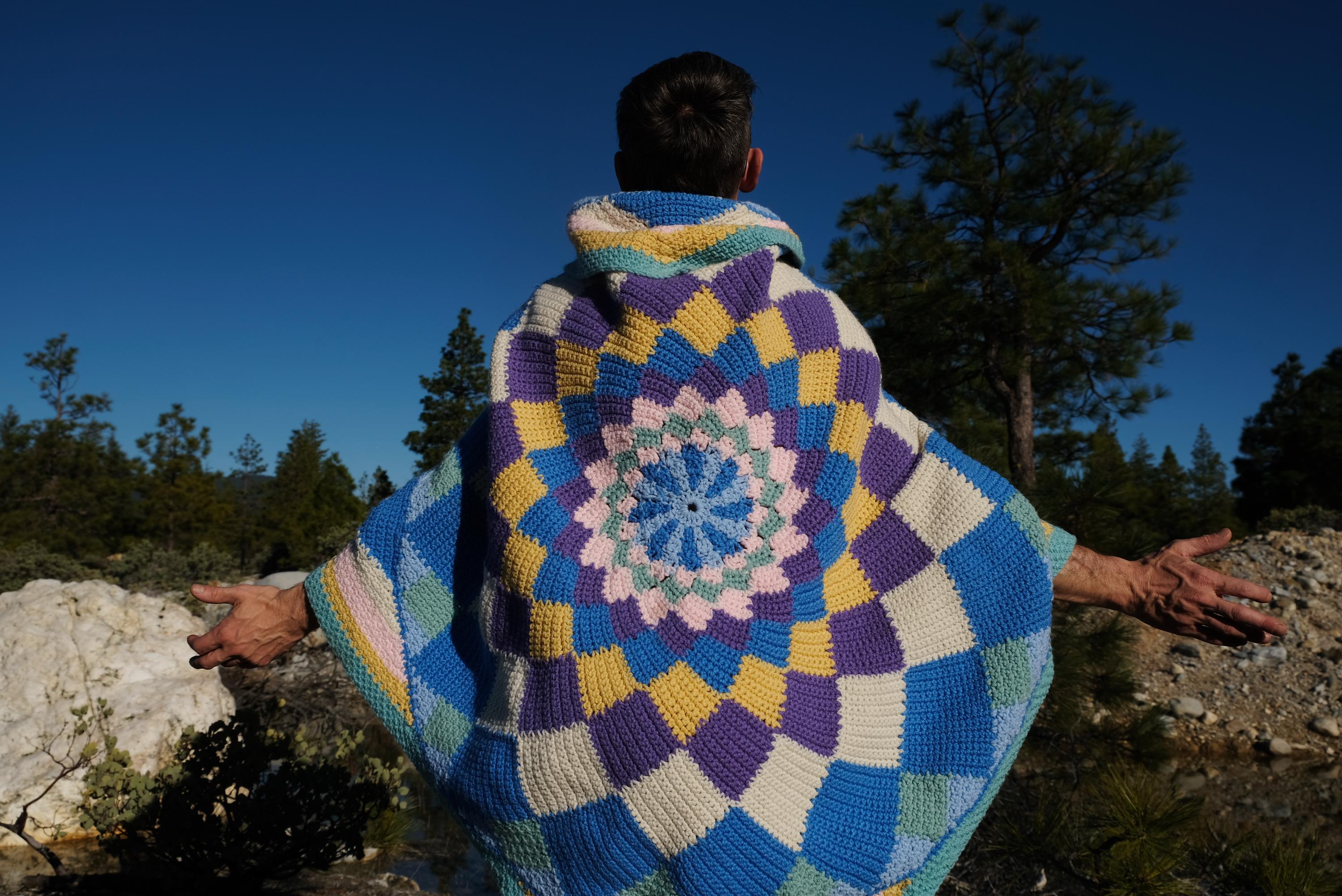 This is a crochet cape with a cosmic kaleidoscope spiral. Beautifully up-cycled from a crocheted afghan blanket in 100% acrylic yarn and exquisitely tailored by yours truly, Lord von Schmitt.