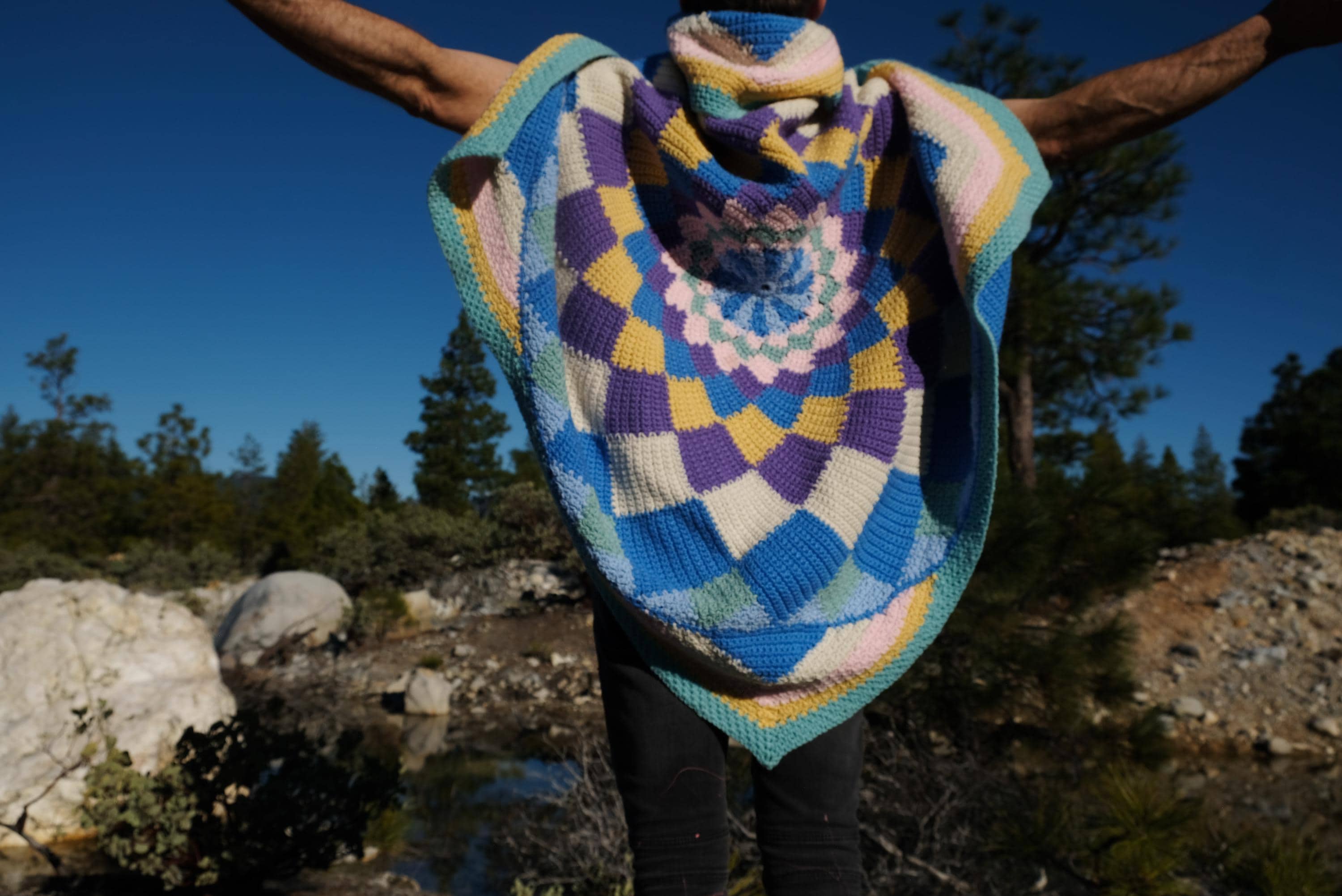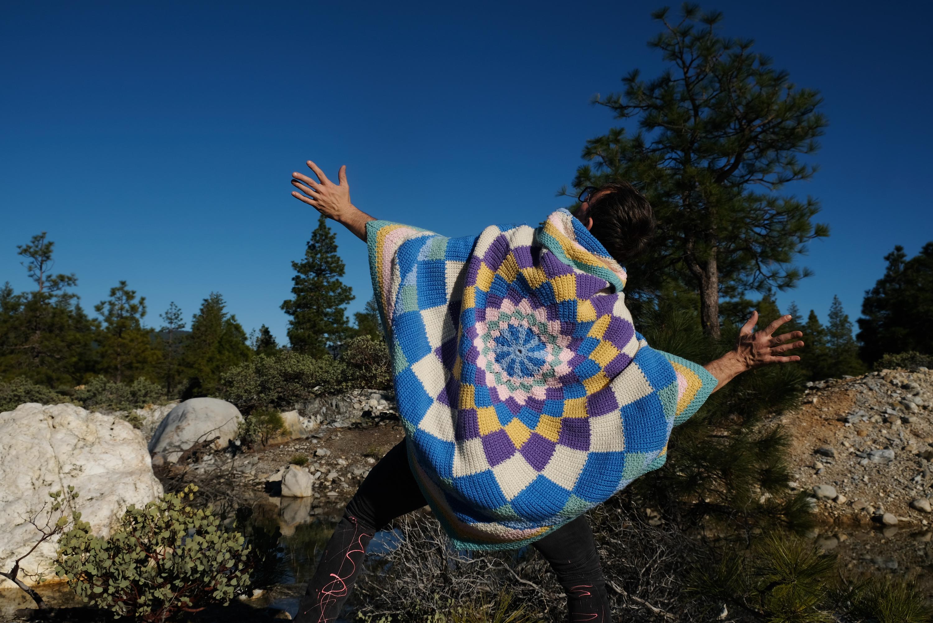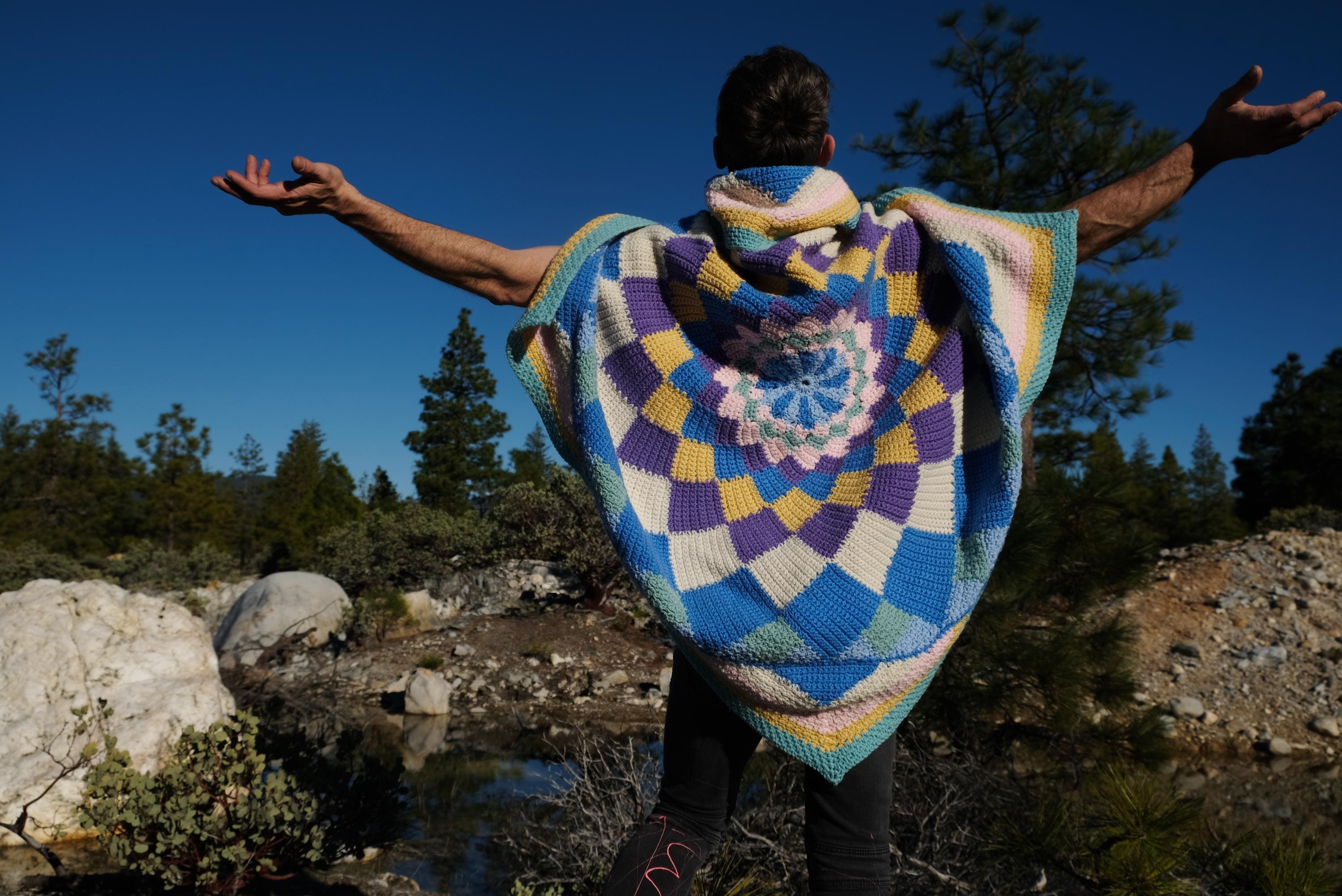 This is a crochet cape with a cosmic kaleidoscope spiral. Beautifully up-cycled from a crocheted afghan blanket in 100% acrylic yarn and exquisitely tailored by yours truly, Lord von Schmitt.