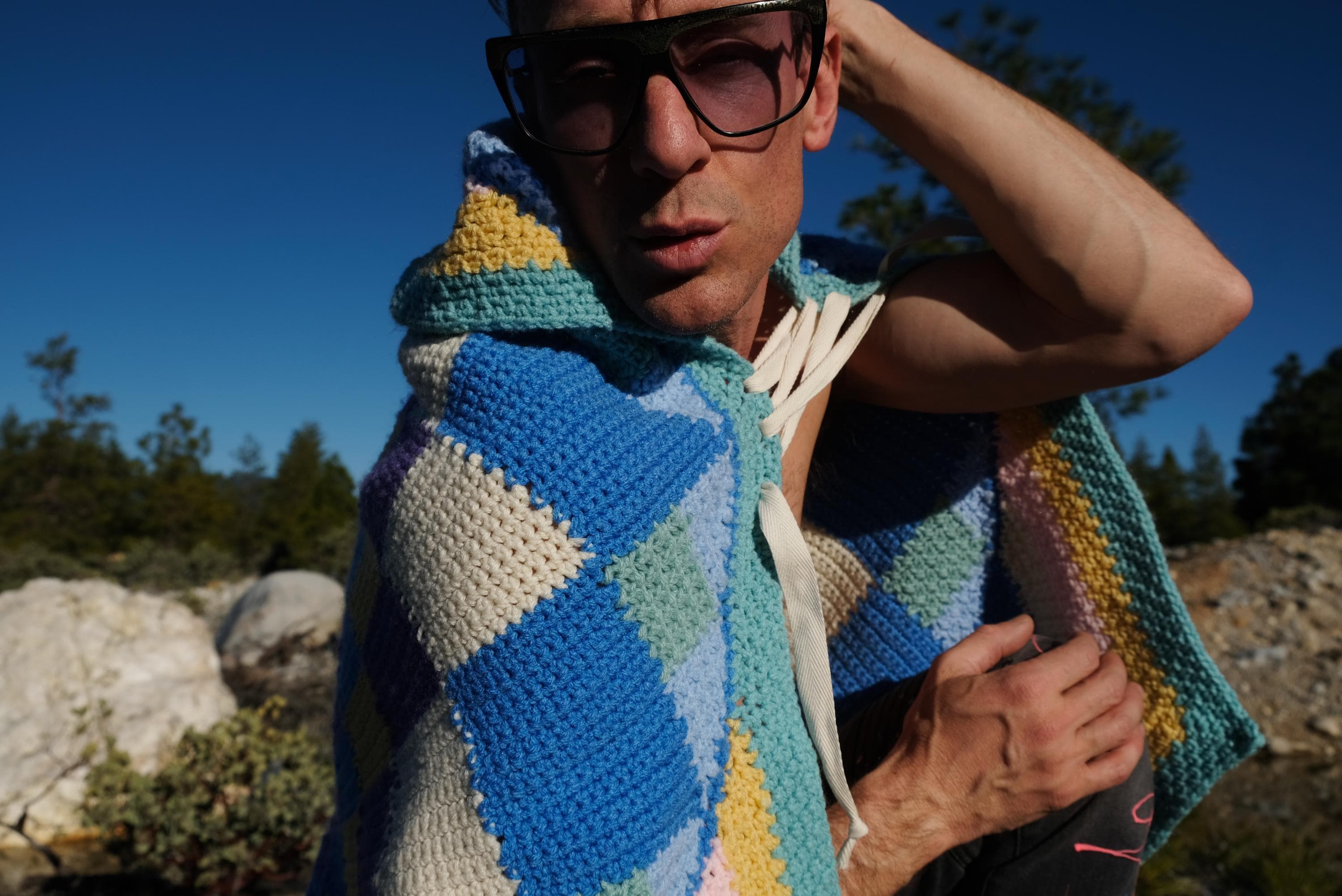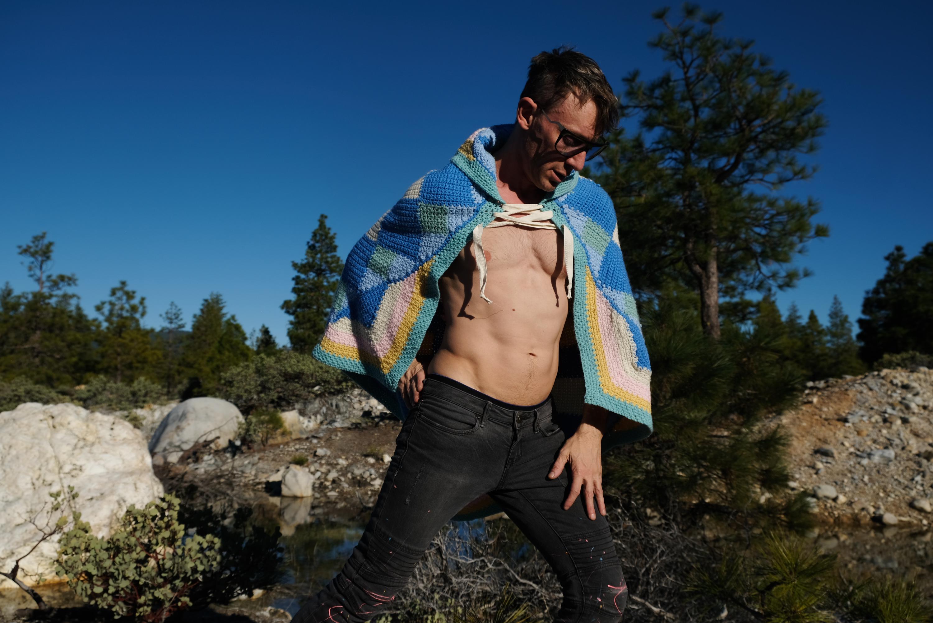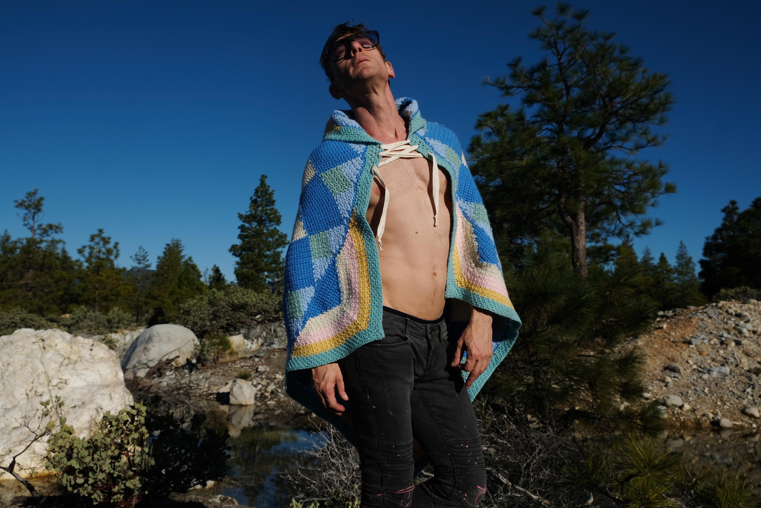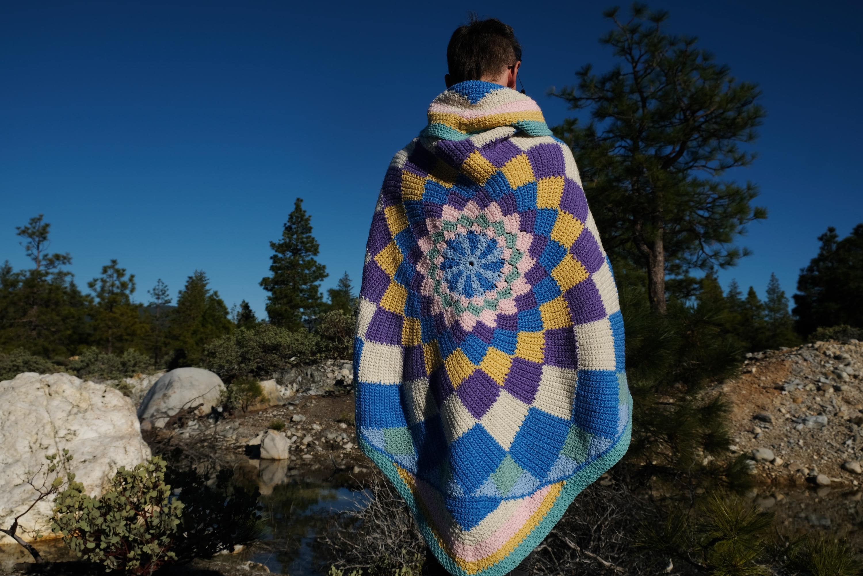 This is a crochet cape with a cosmic kaleidoscope spiral. Beautifully up-cycled from a crocheted afghan blanket in 100% acrylic yarn and exquisitely tailored by yours truly, Lord von Schmitt.