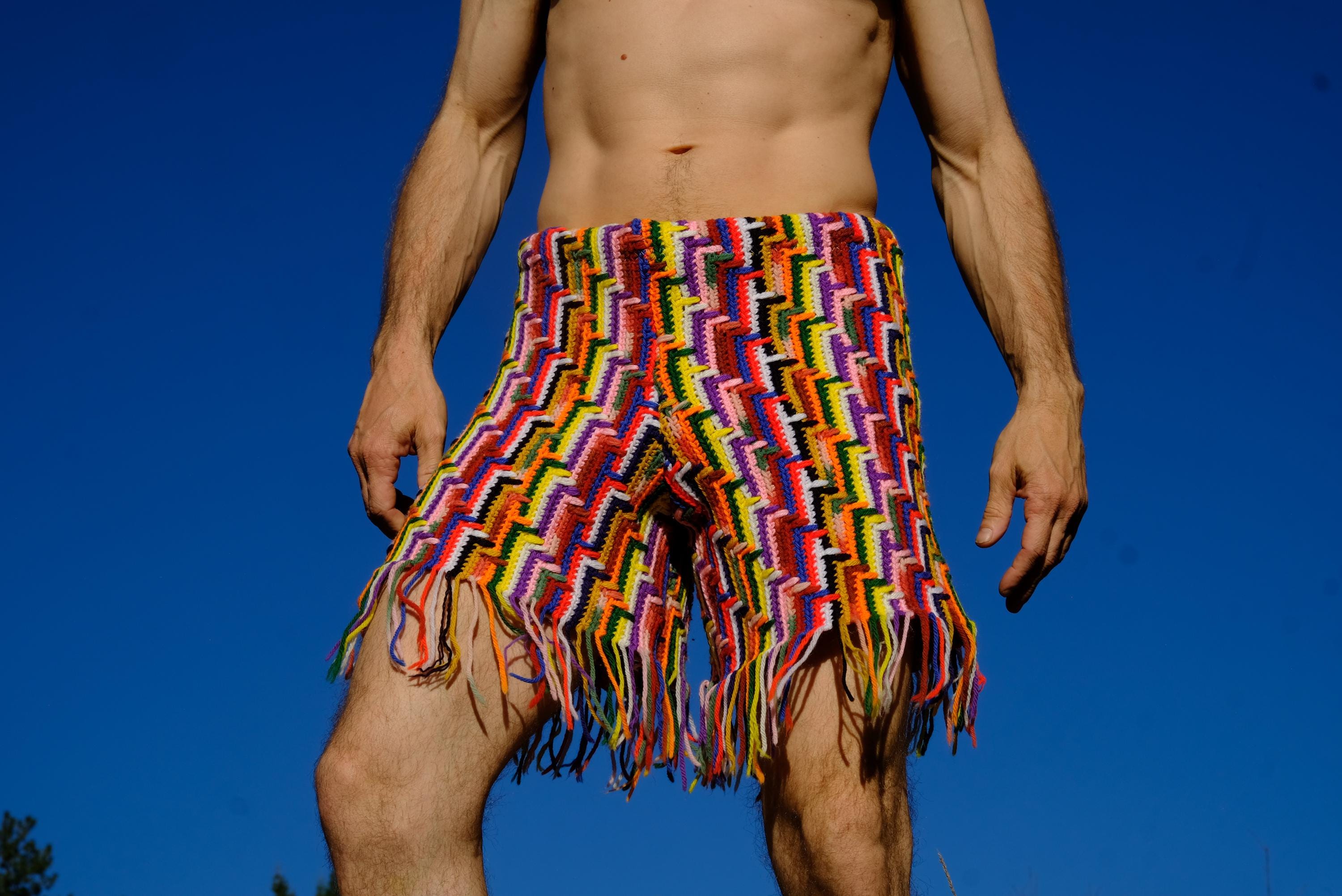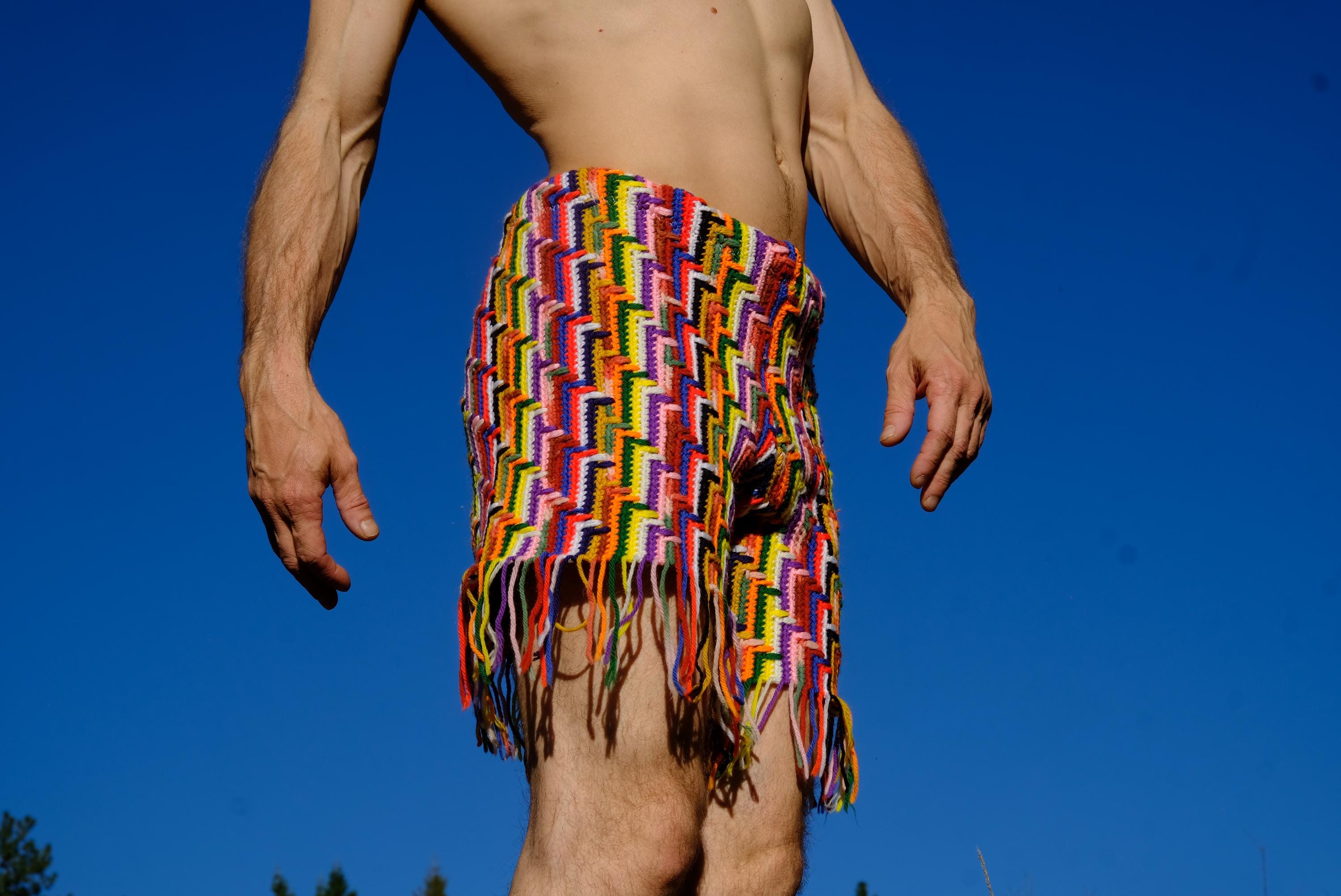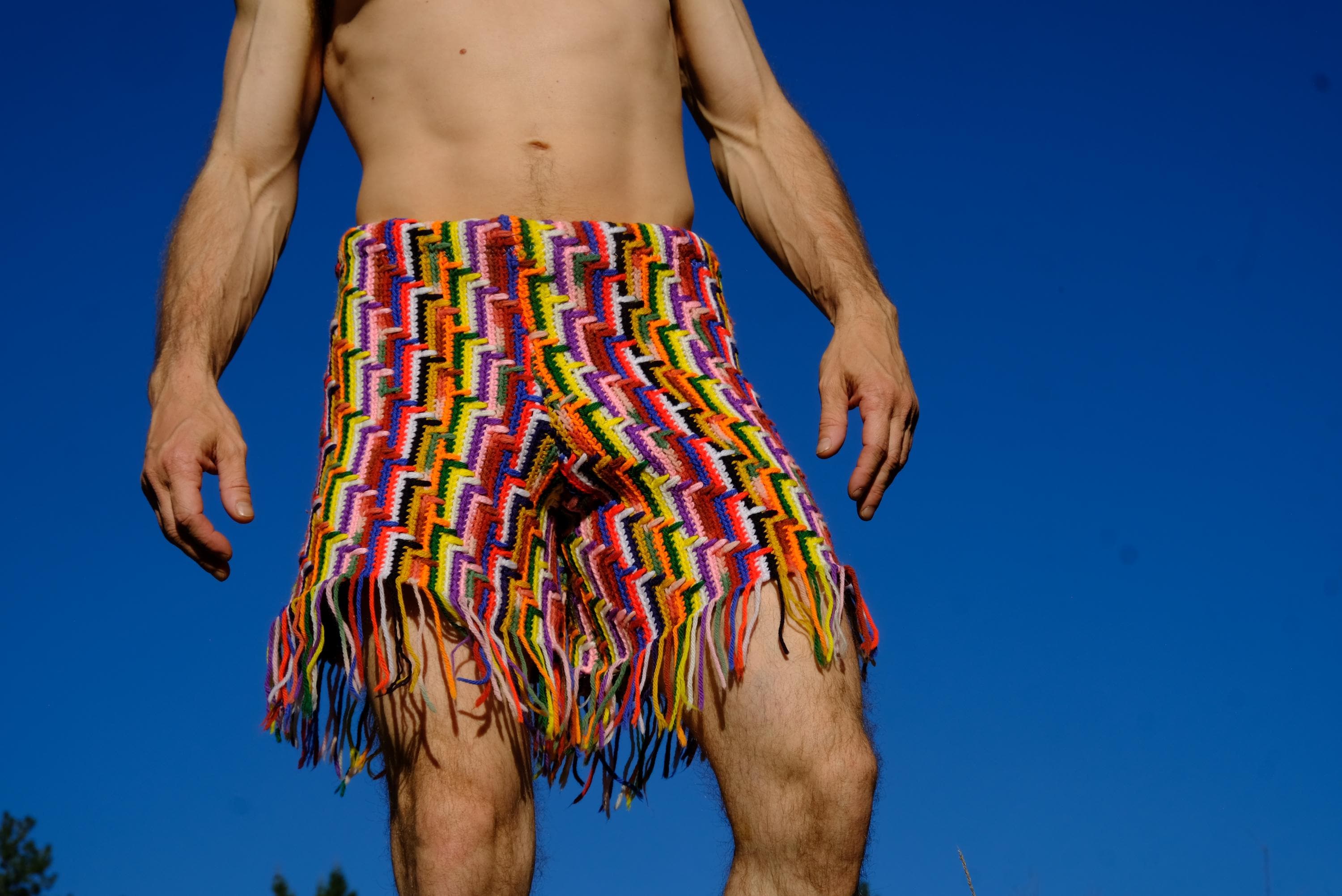 These are crochet shorts in bright colored tetris stripes. Repurposed from a vintage afghan blanket crocheted in 100% acrylic yarn.