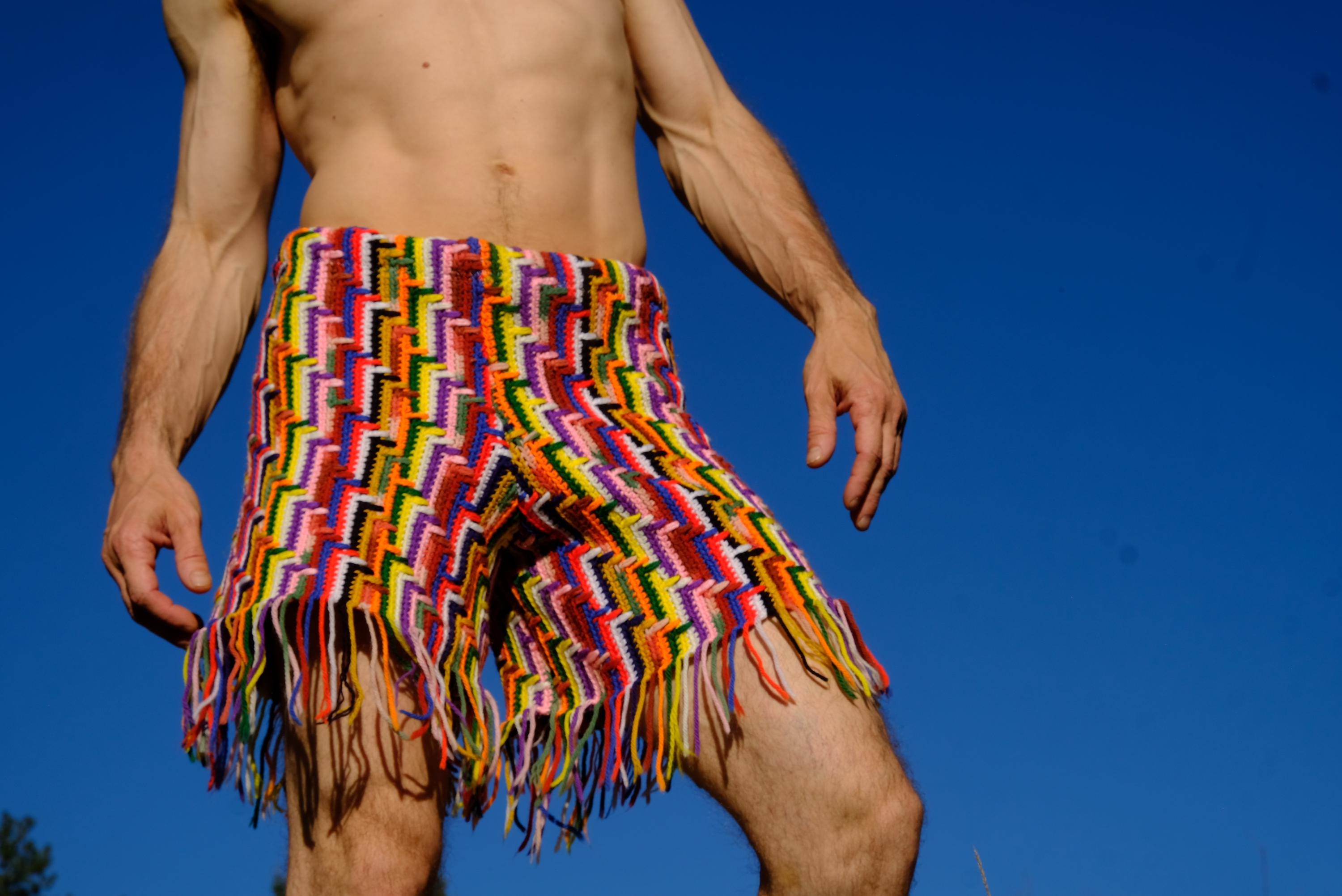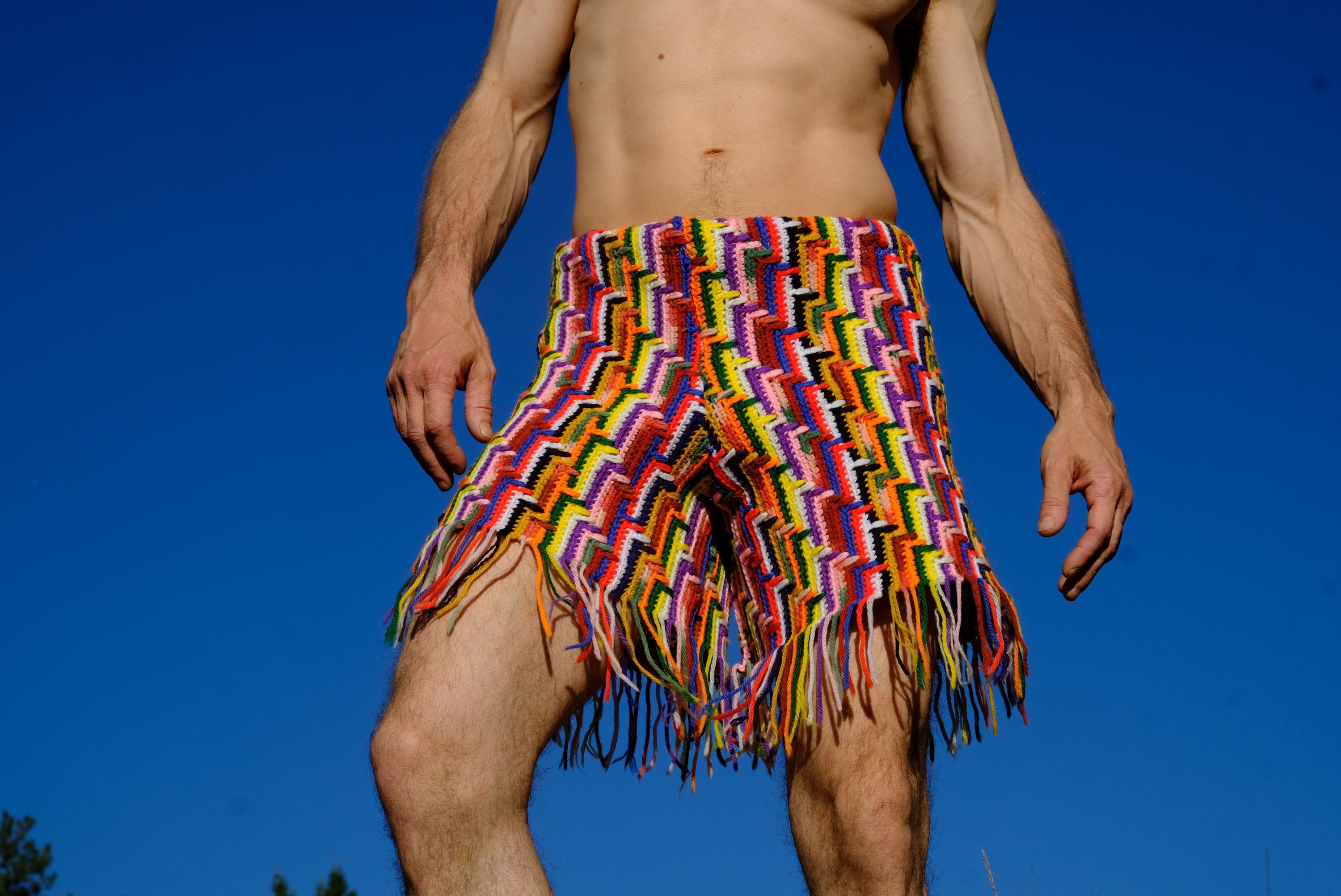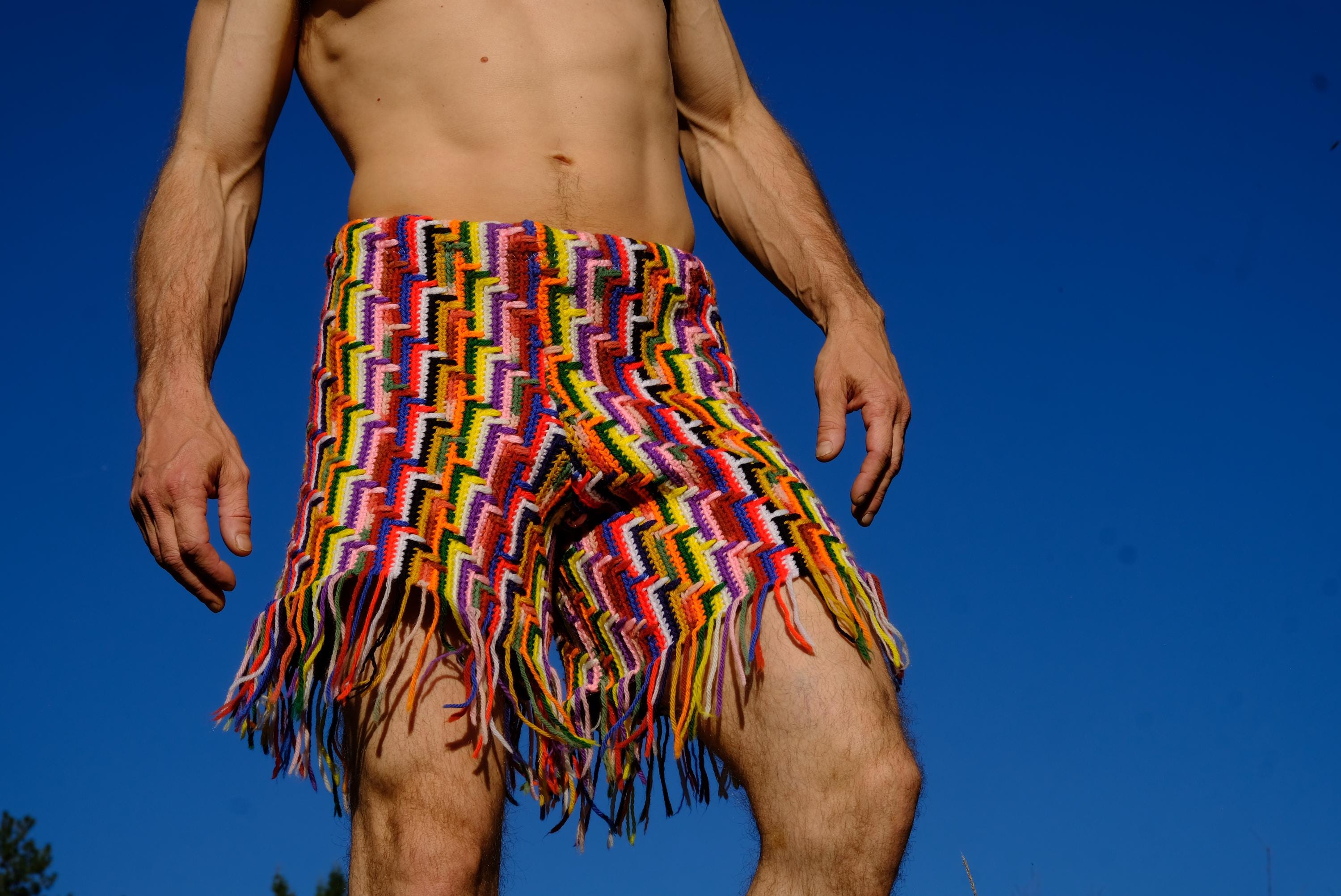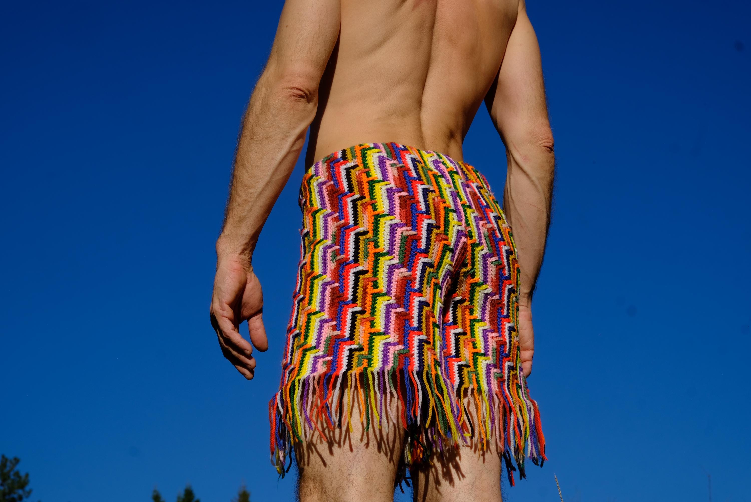 These are crochet shorts in bright colored tetris stripes. Repurposed from a vintage afghan blanket crocheted in 100% acrylic yarn.