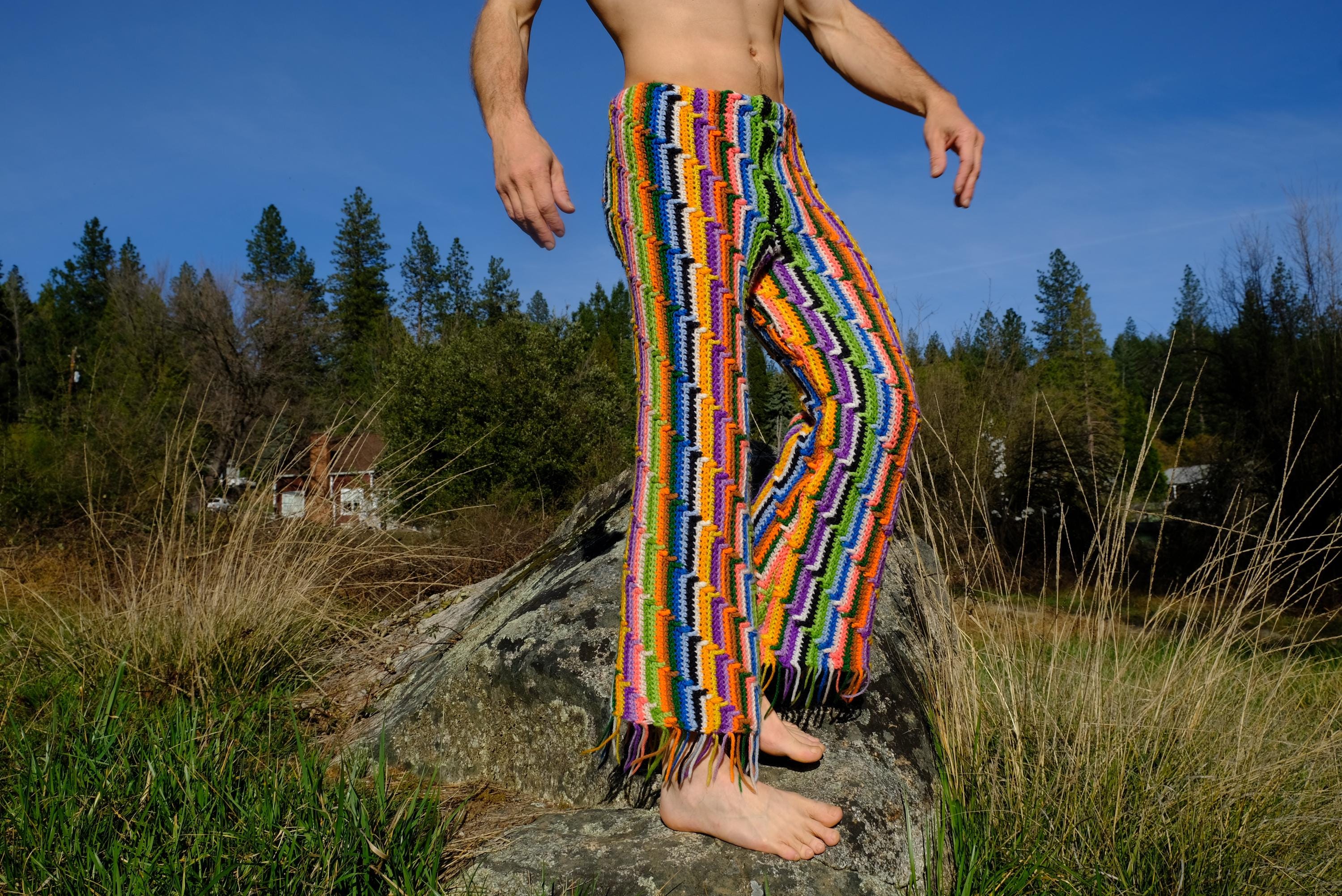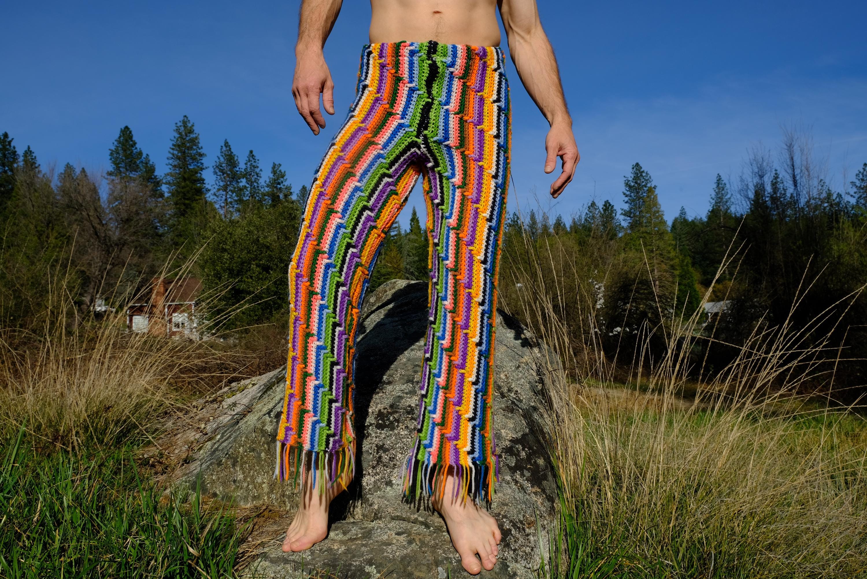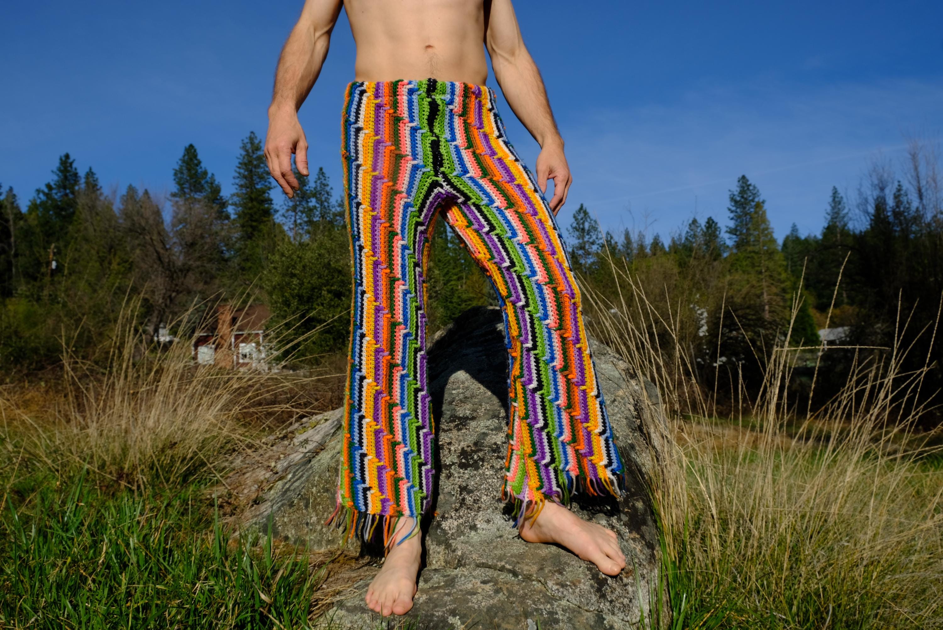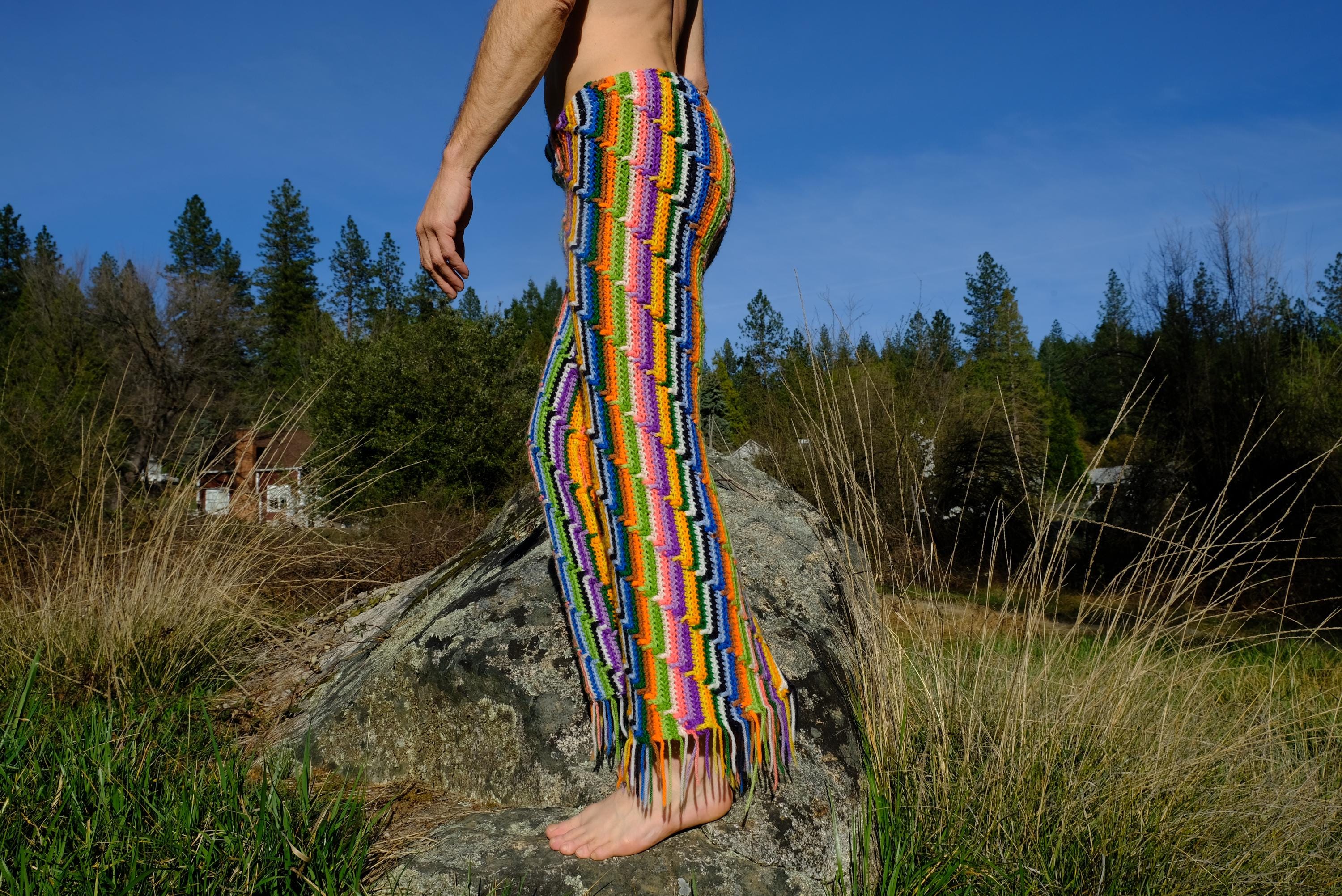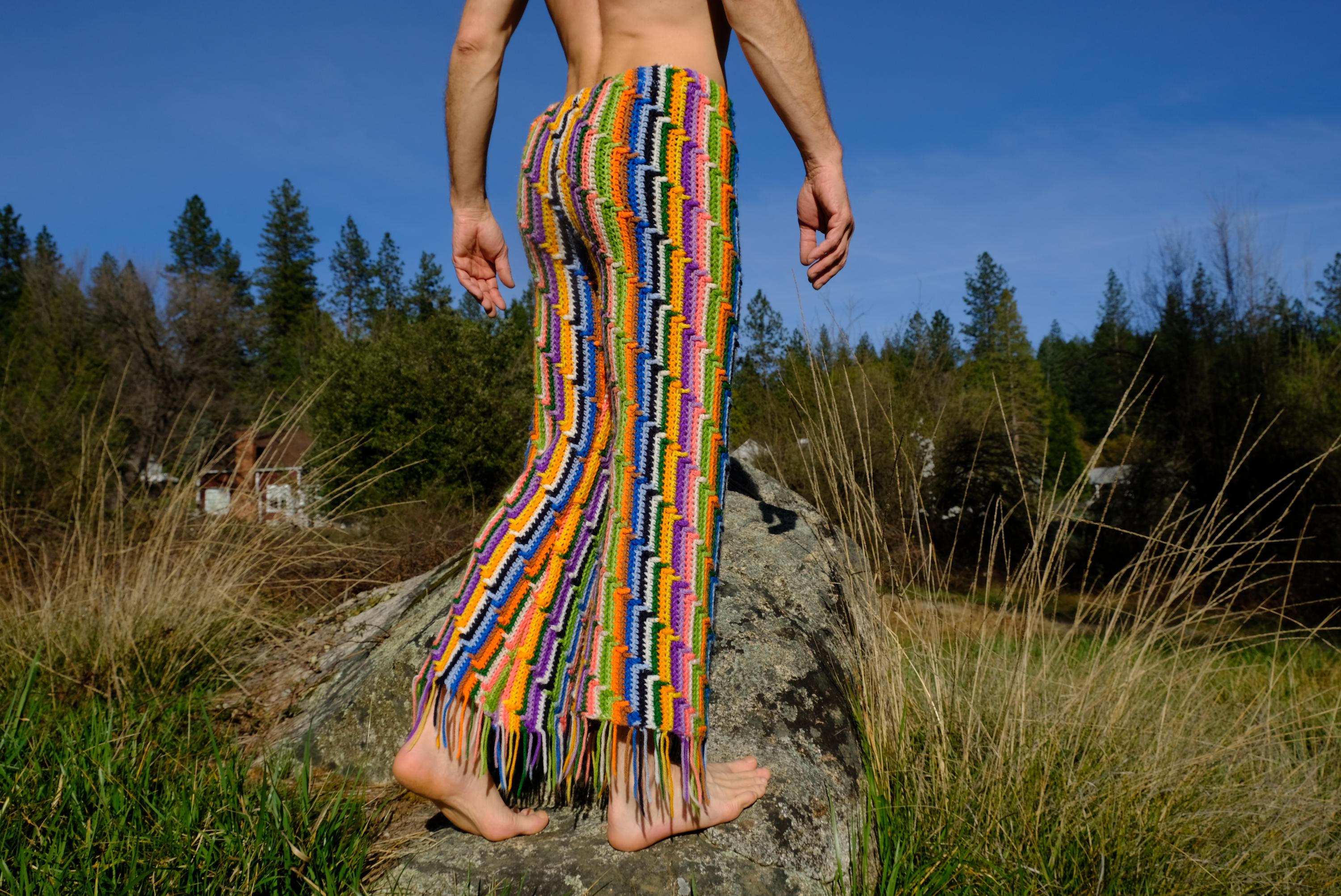 These are crochet pant in vibrant lightning bolt rainbow stripes. Fashioned from a vintage afghan blanket crocheted in 100% acrylic yarn.