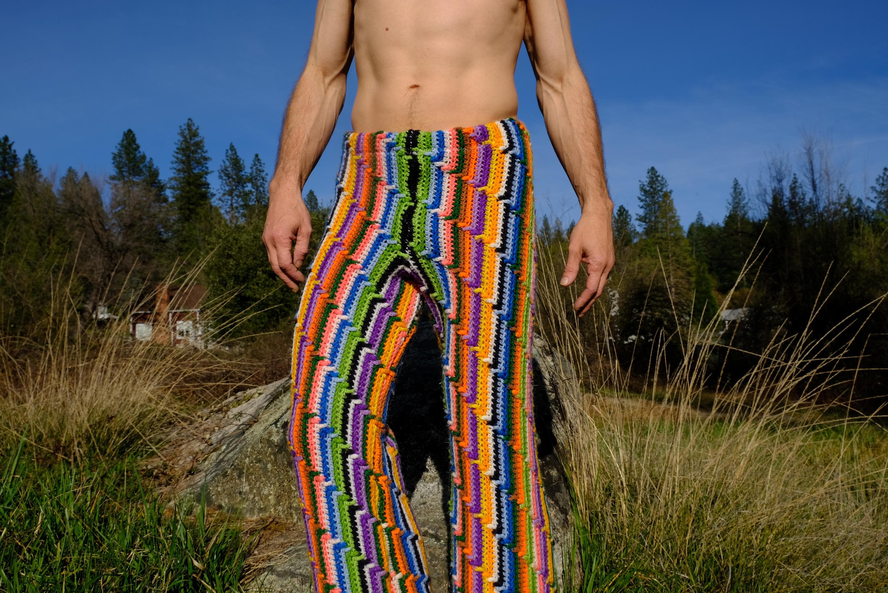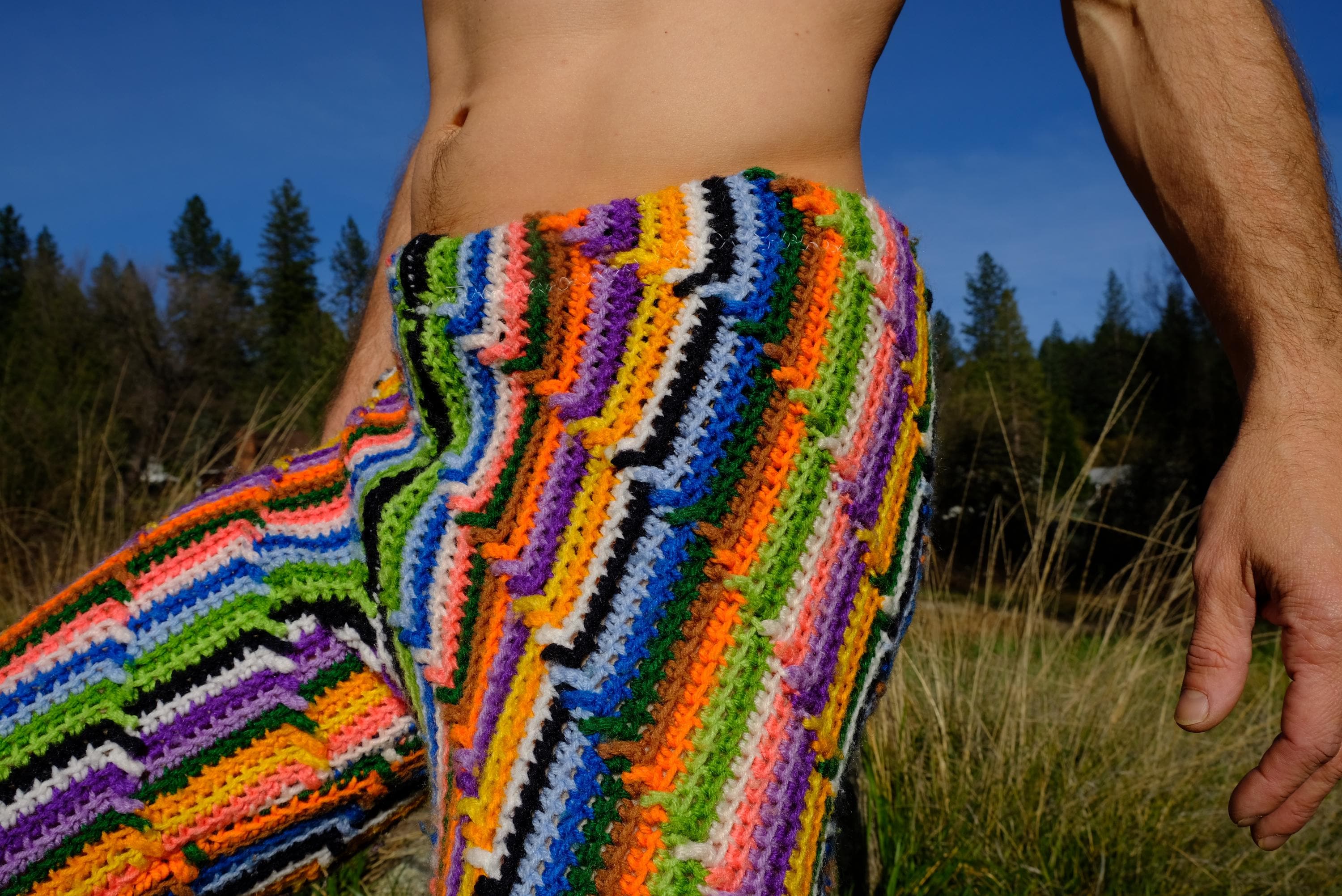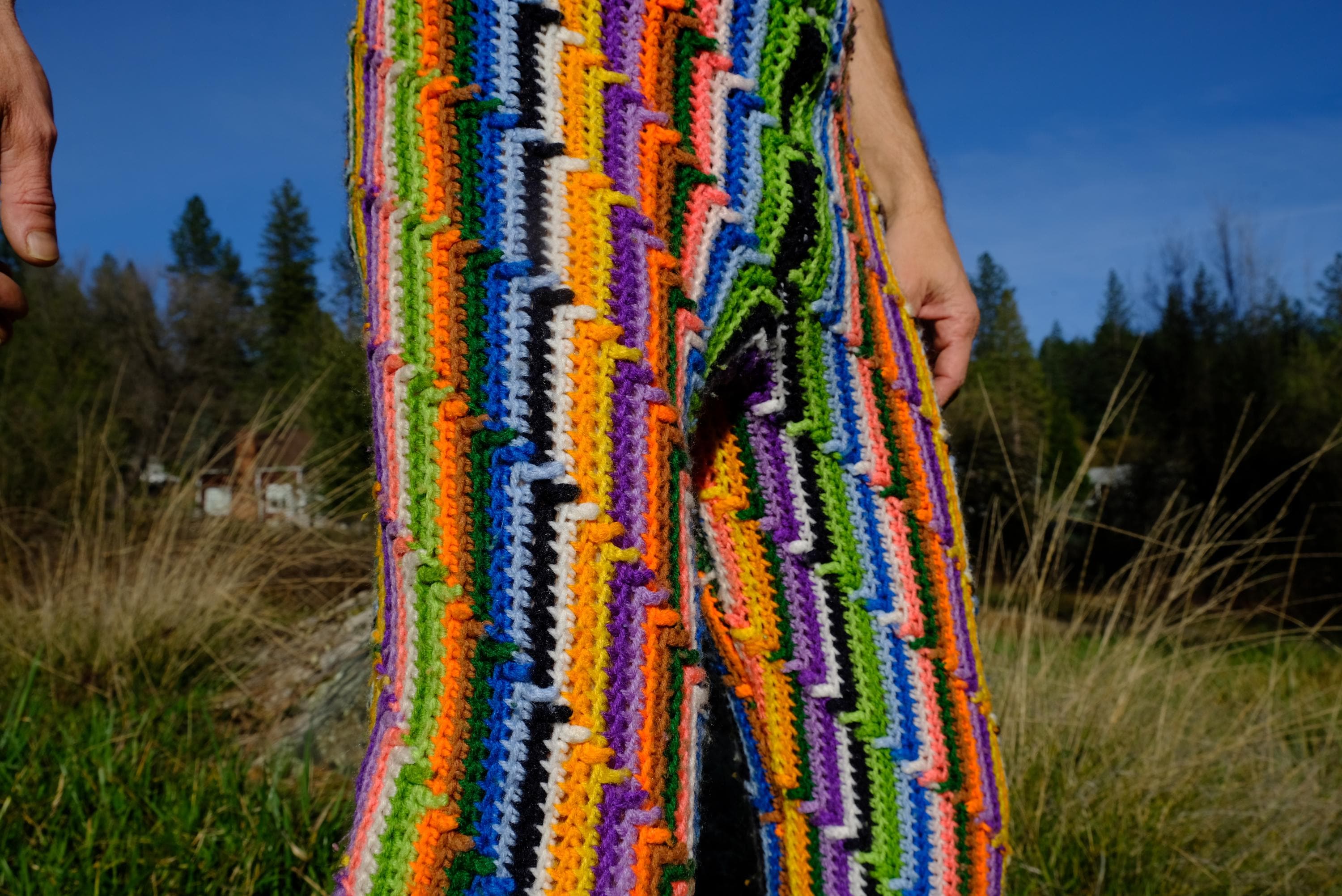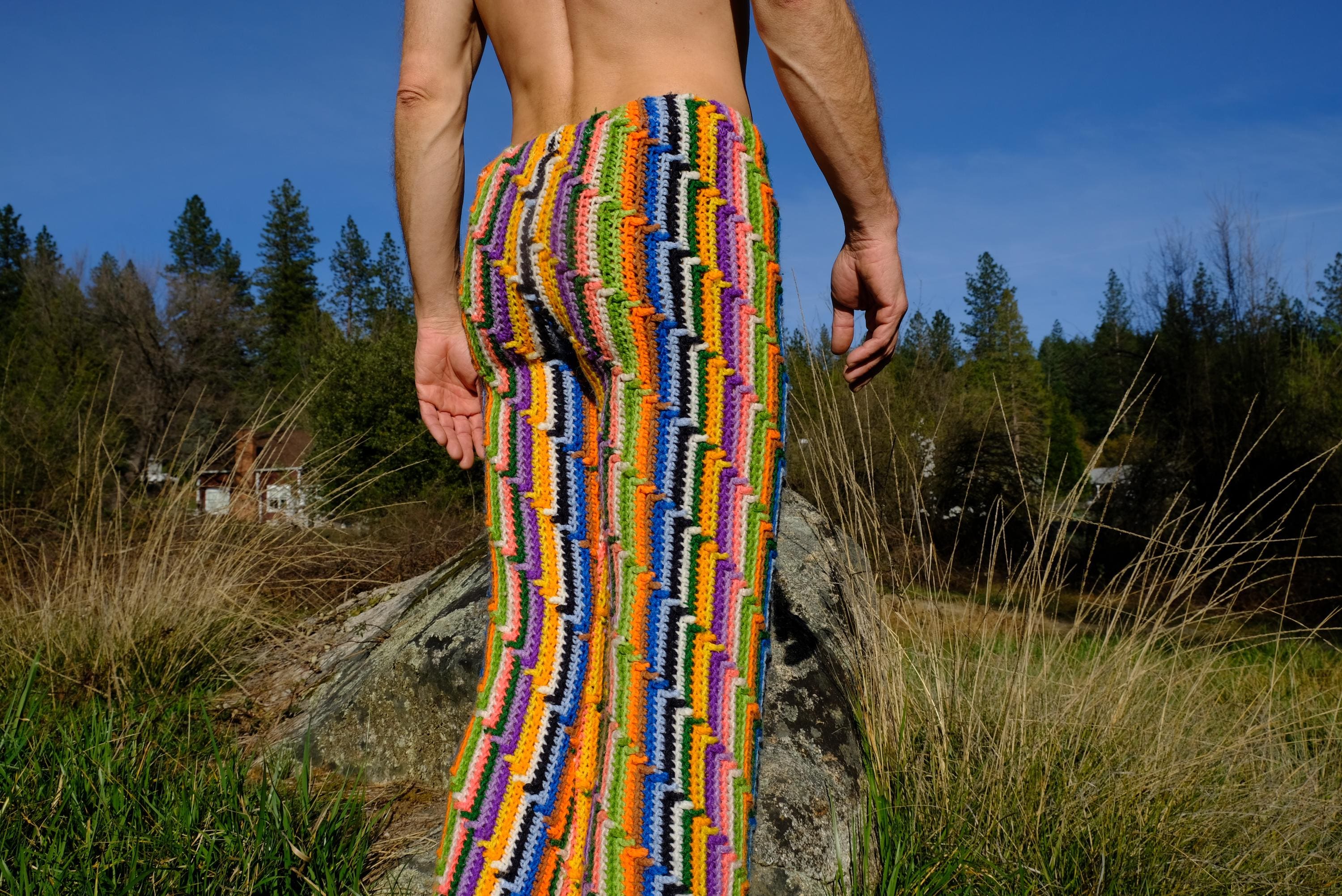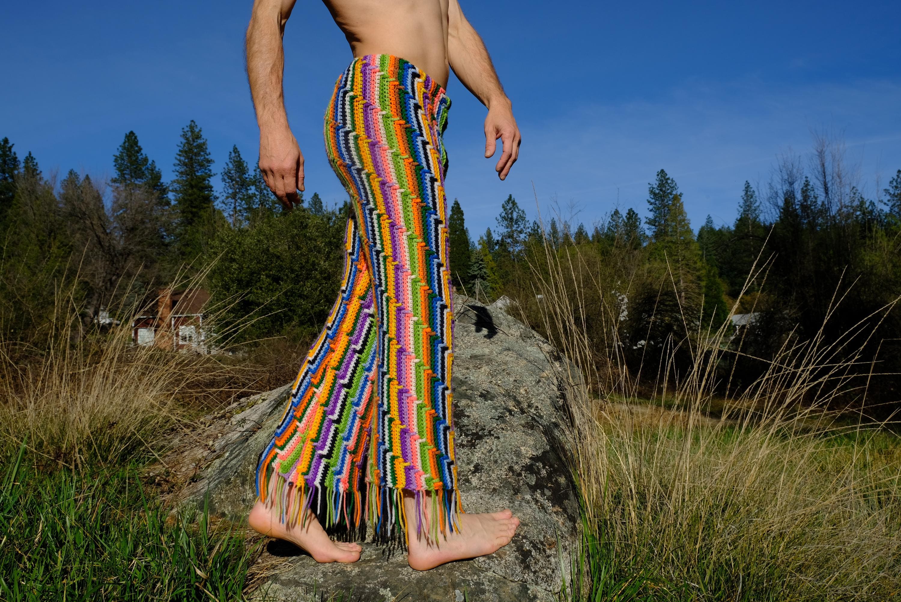 These are crochet pant in vibrant lightning bolt rainbow stripes. Fashioned from a vintage afghan blanket crocheted in 100% acrylic yarn.