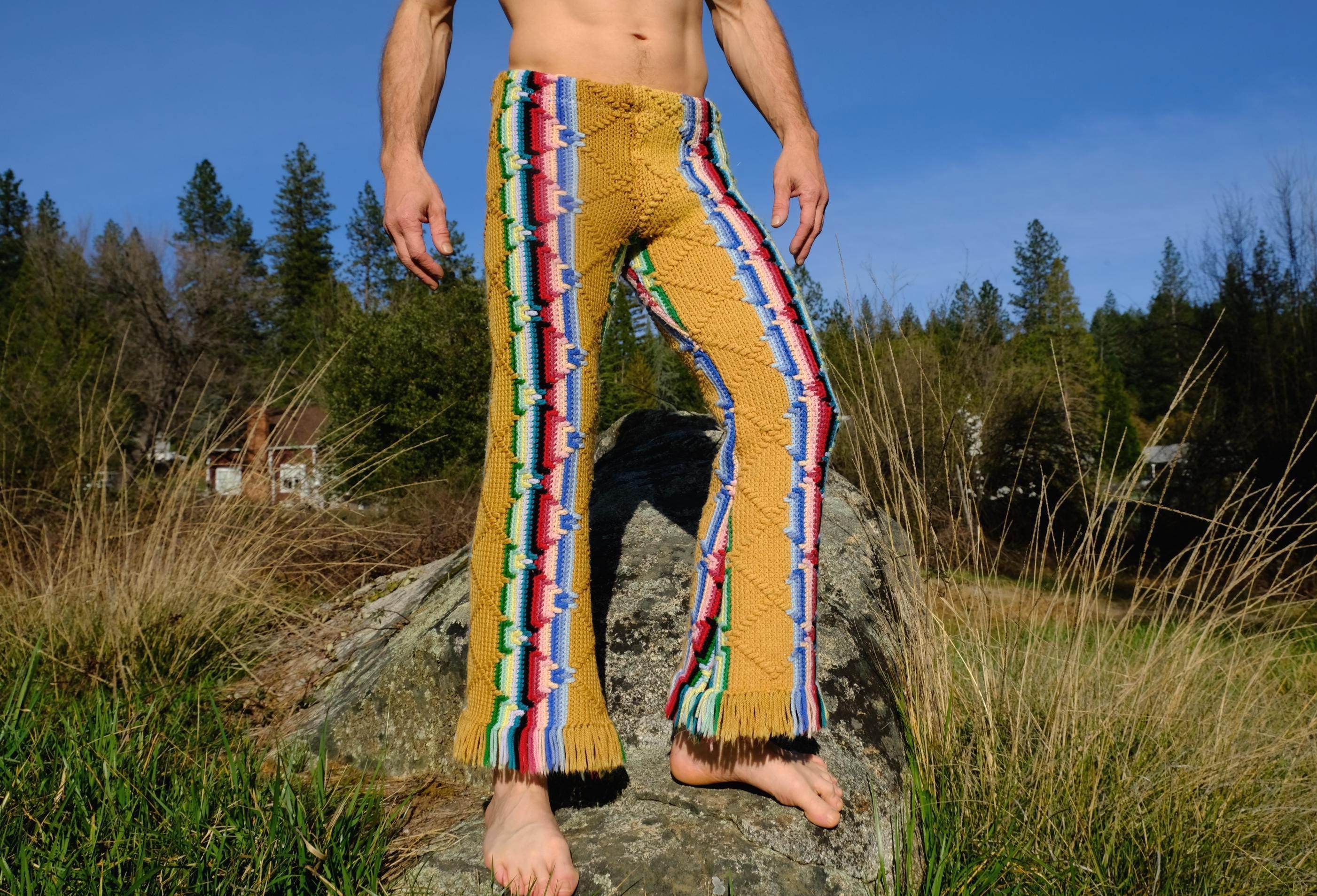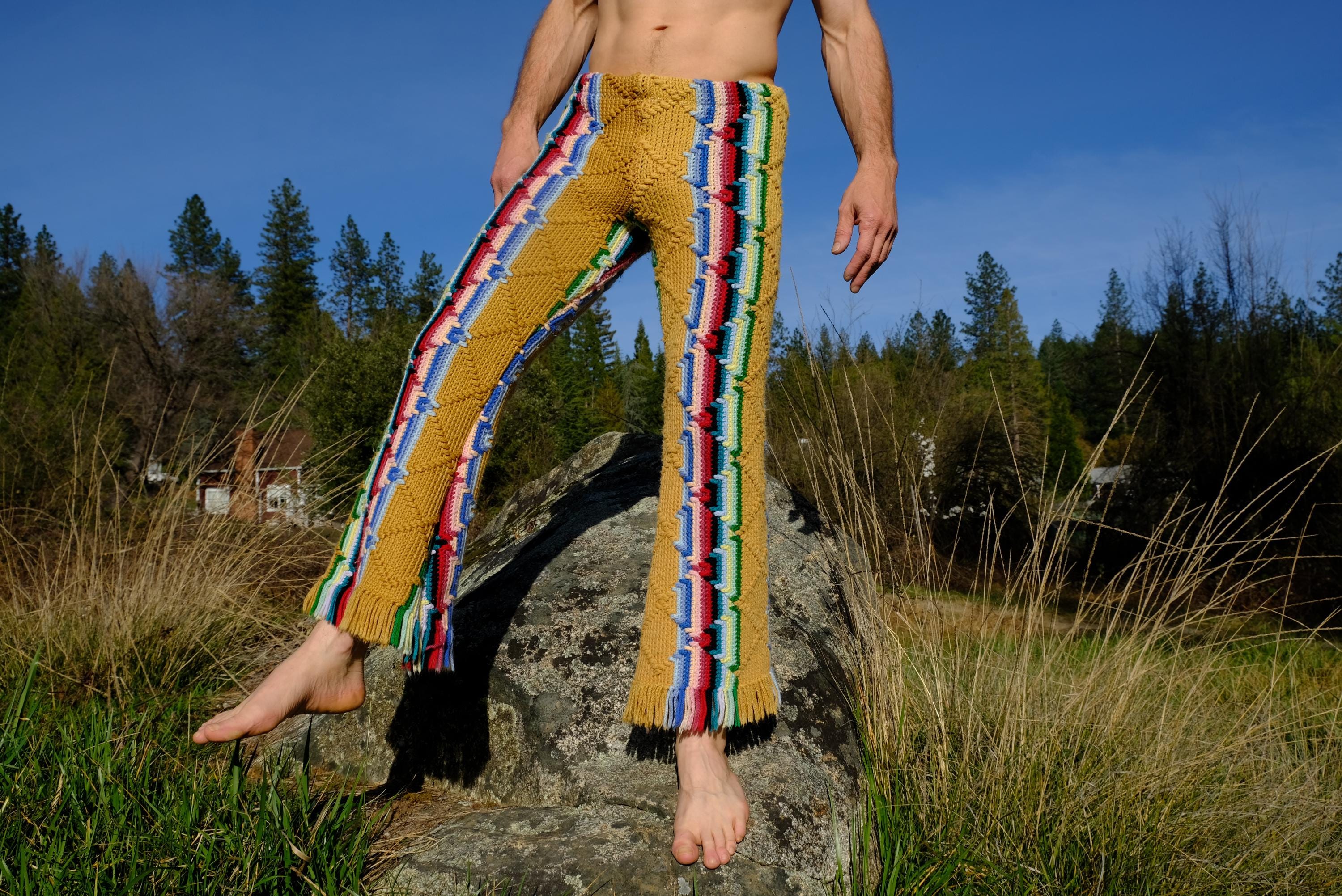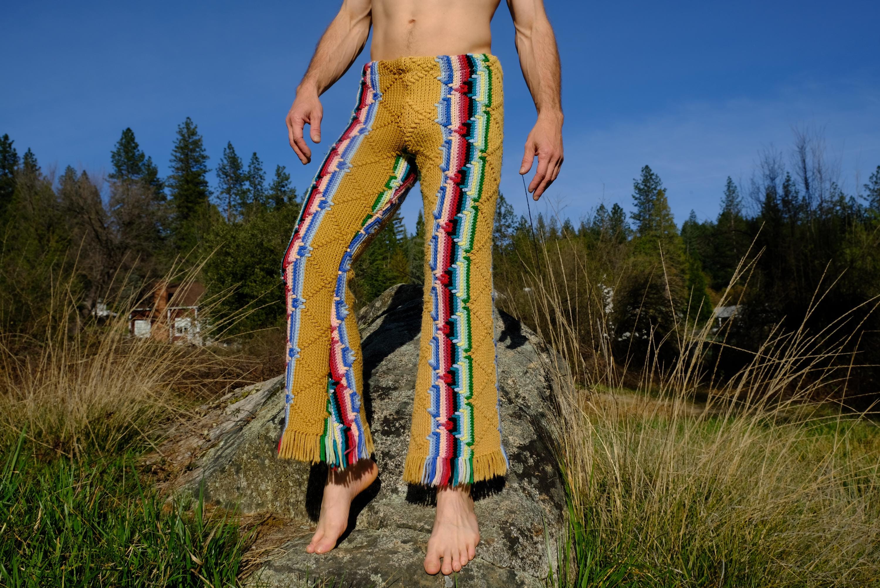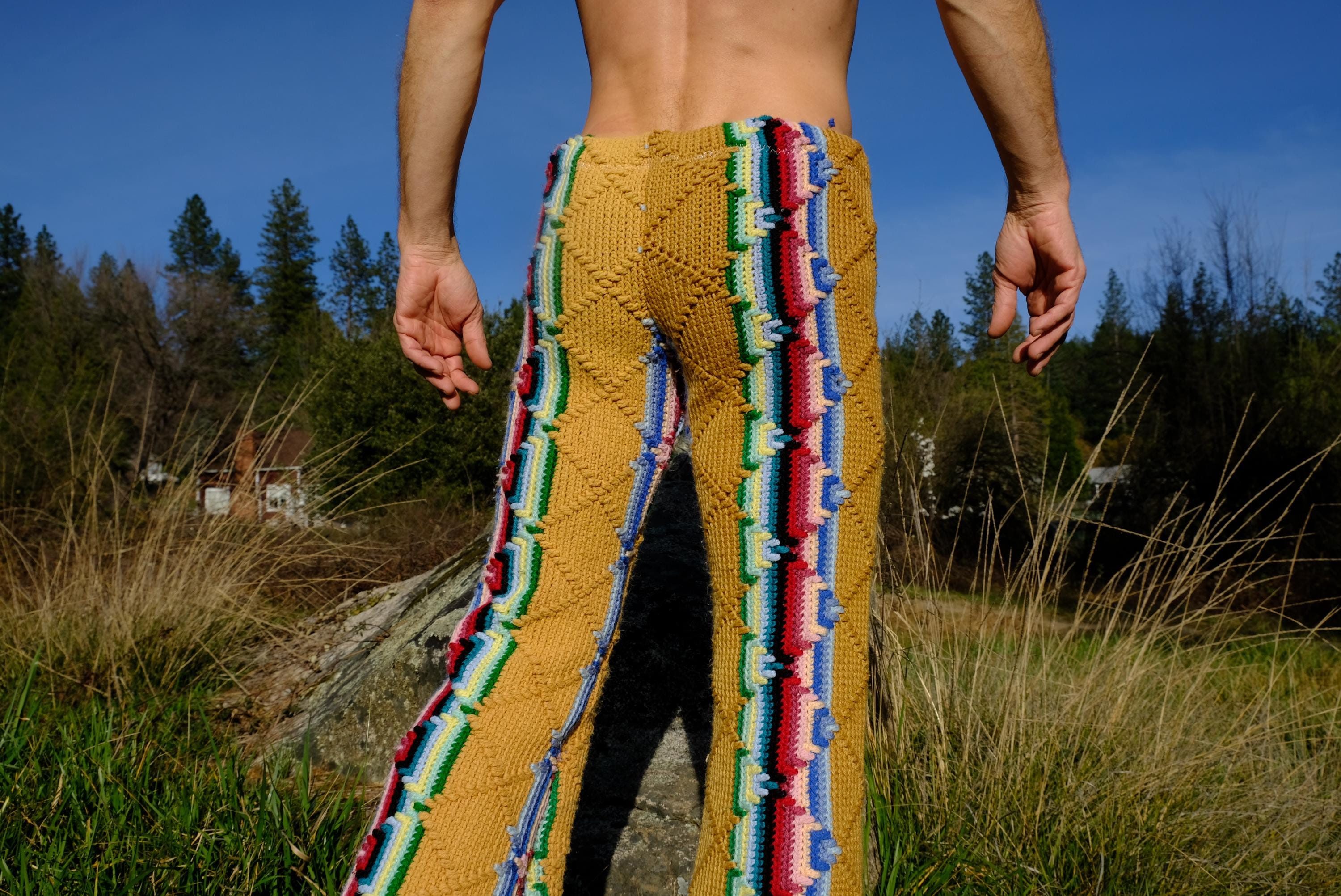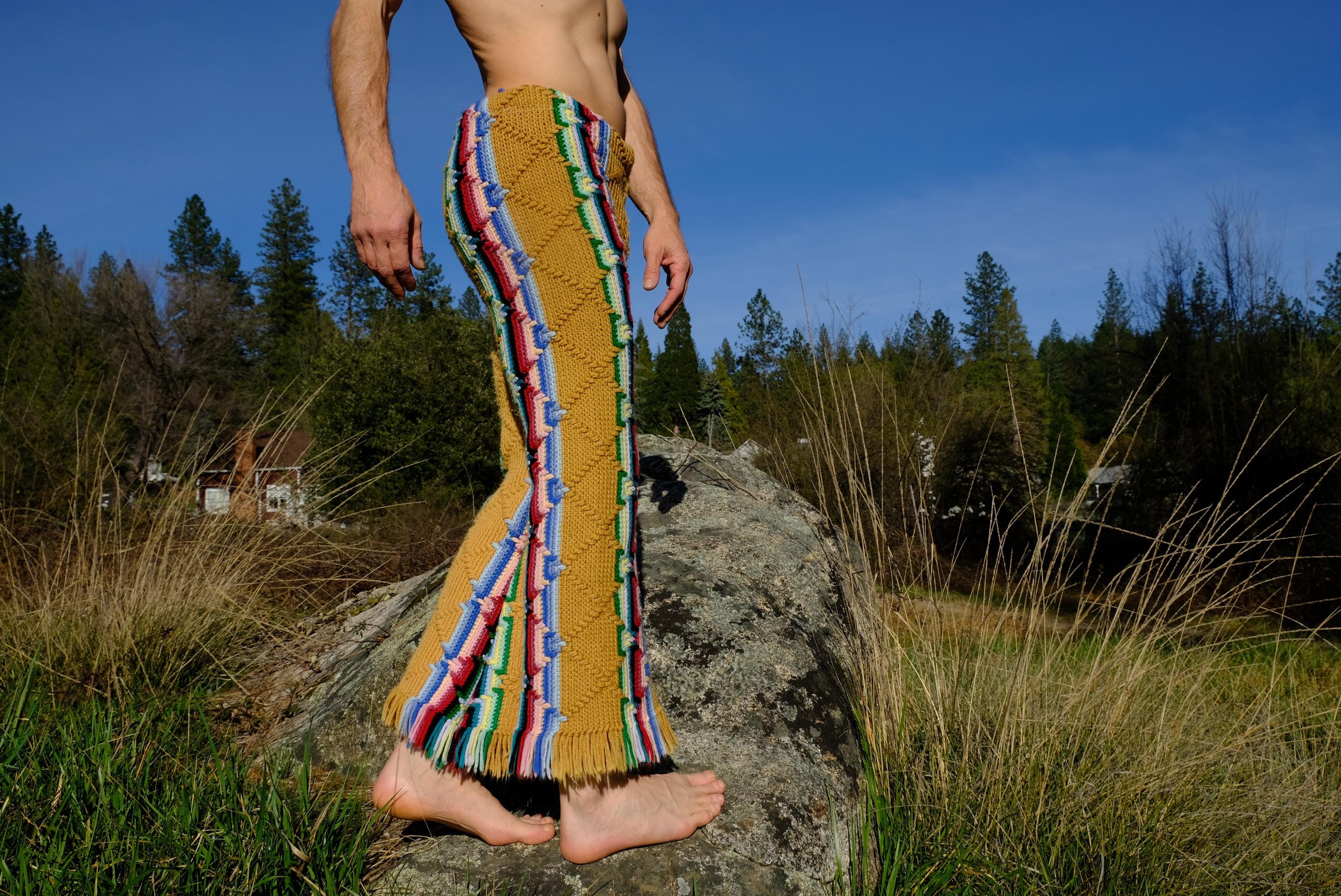 These are crochet pant in multicolor acid stripes. Fashioned from a vintage afghan blanket crocheted in 100% acrylic yarn.