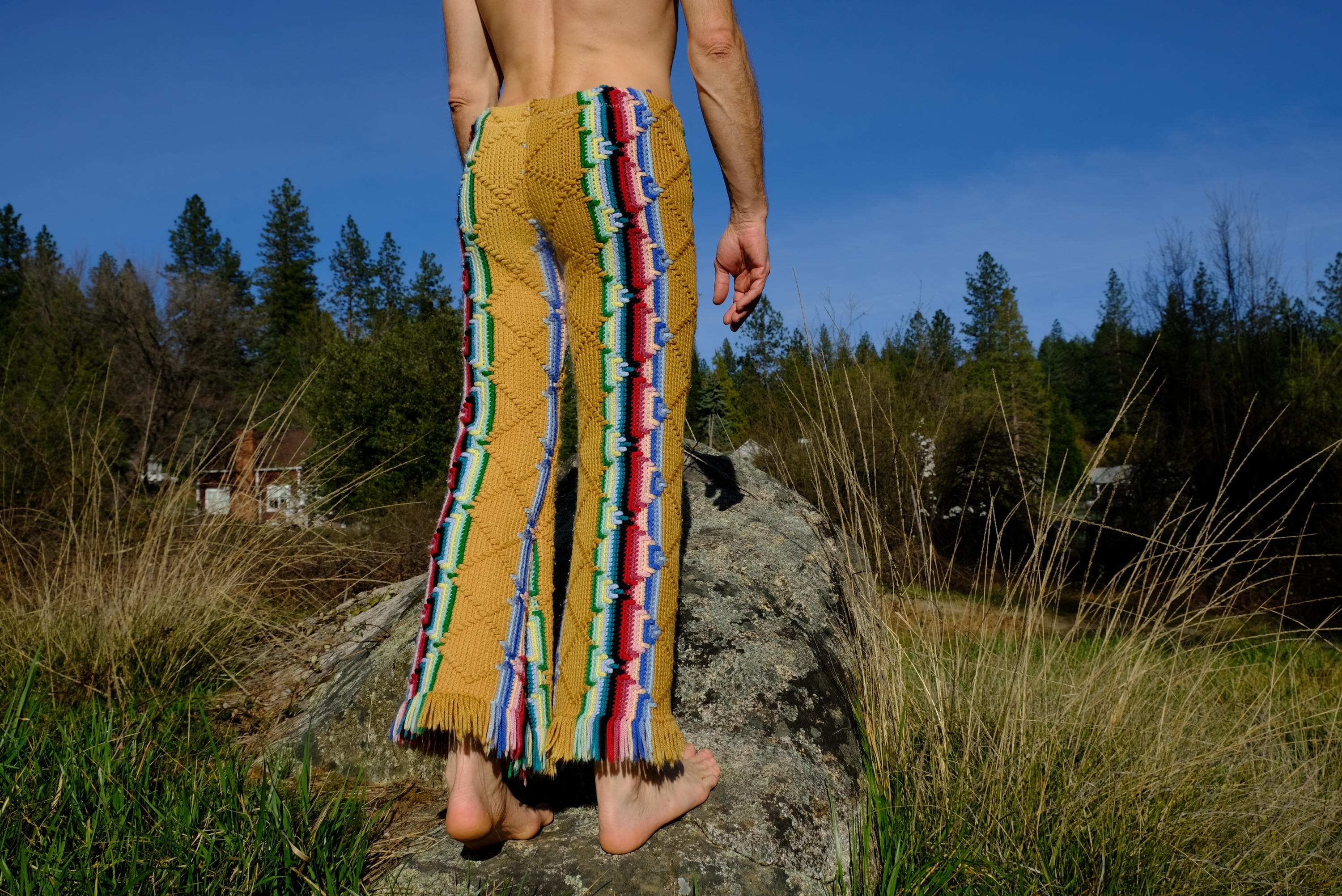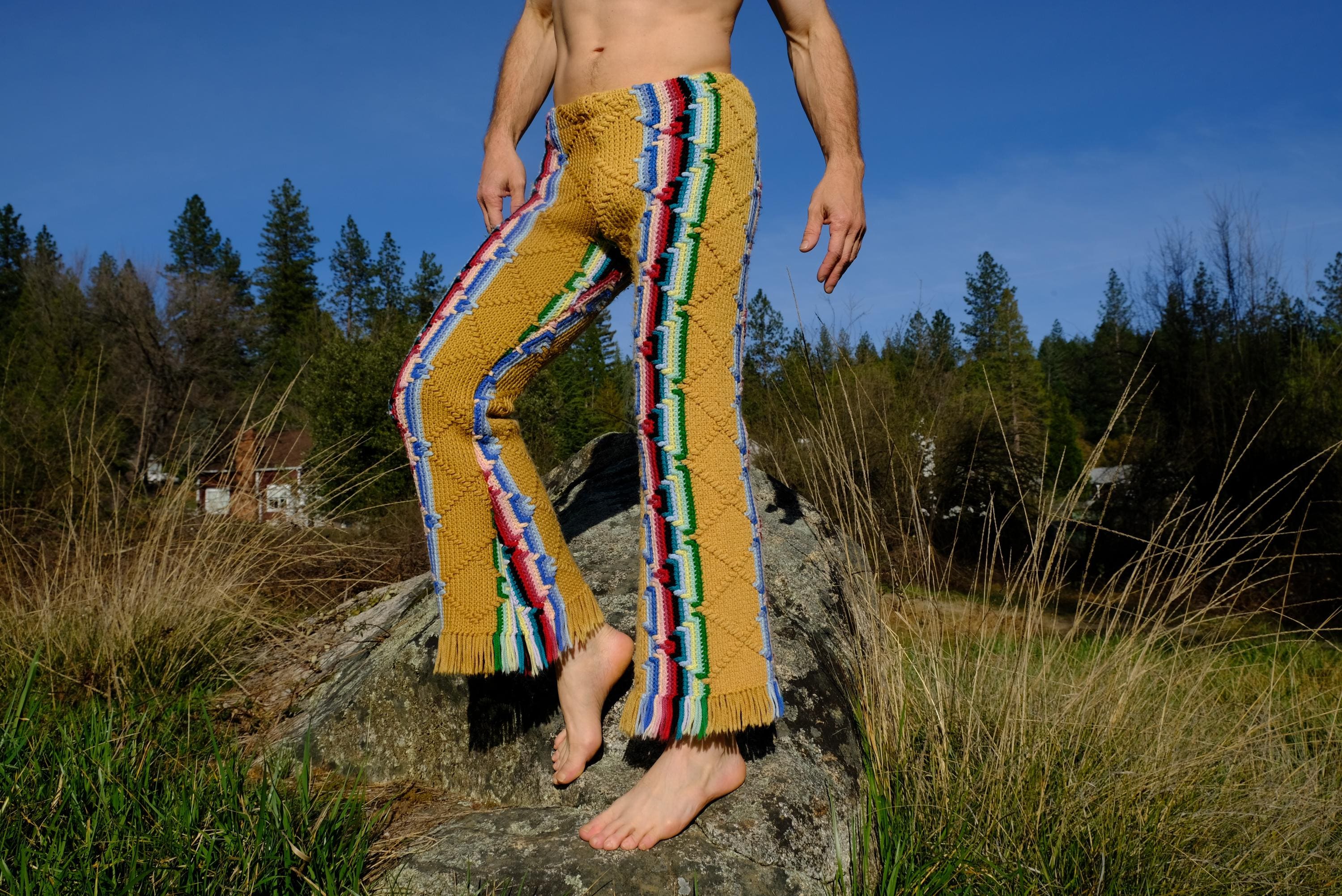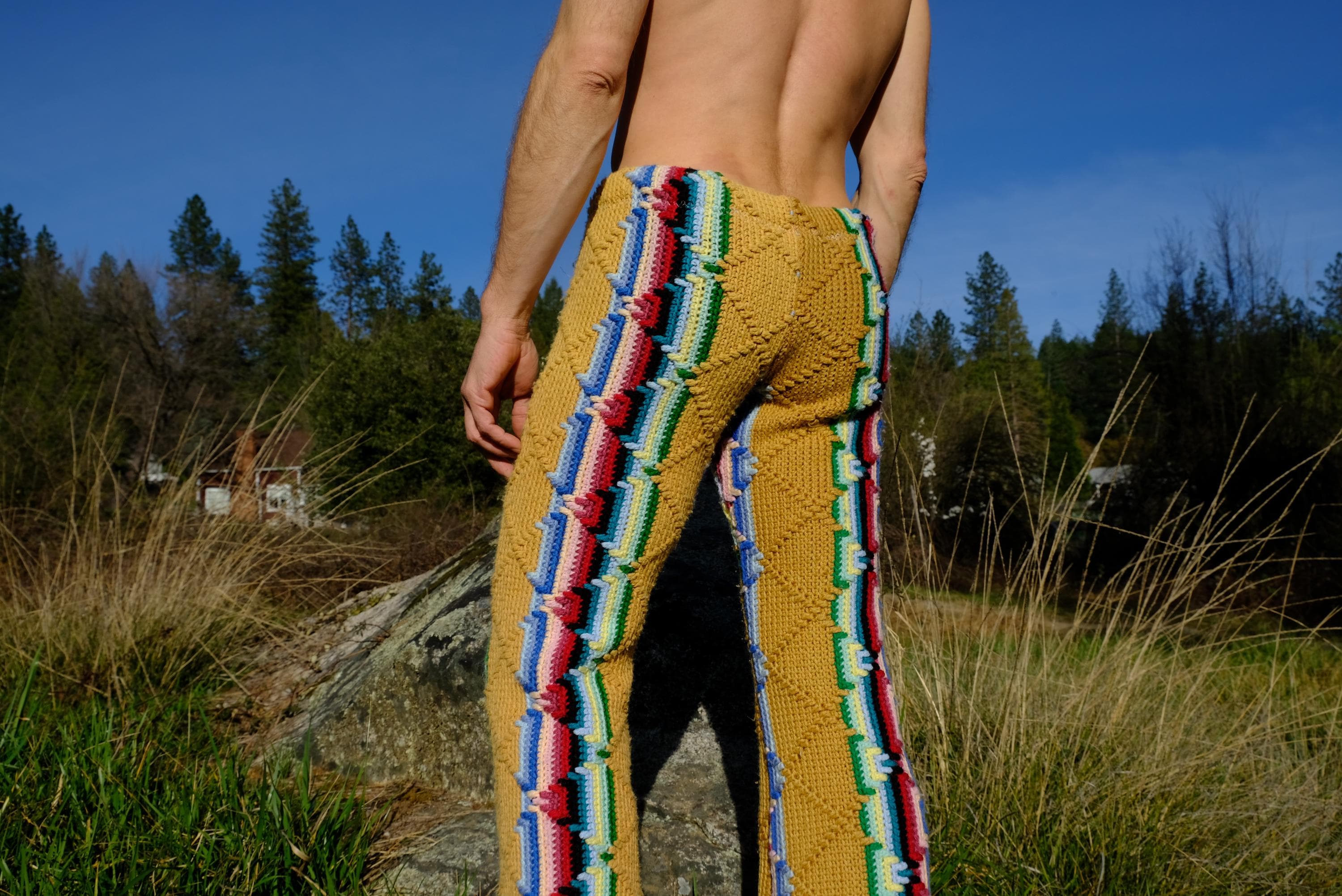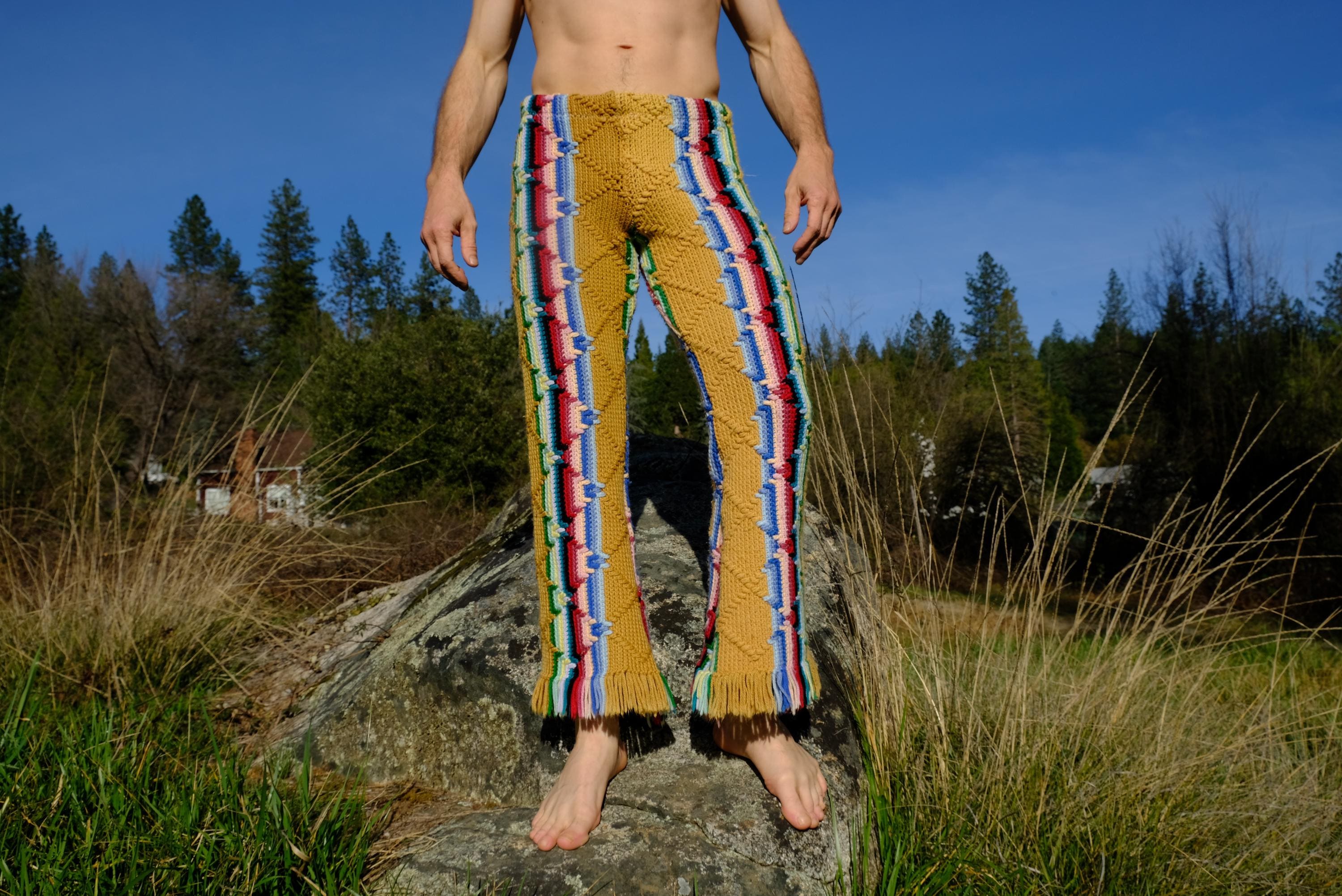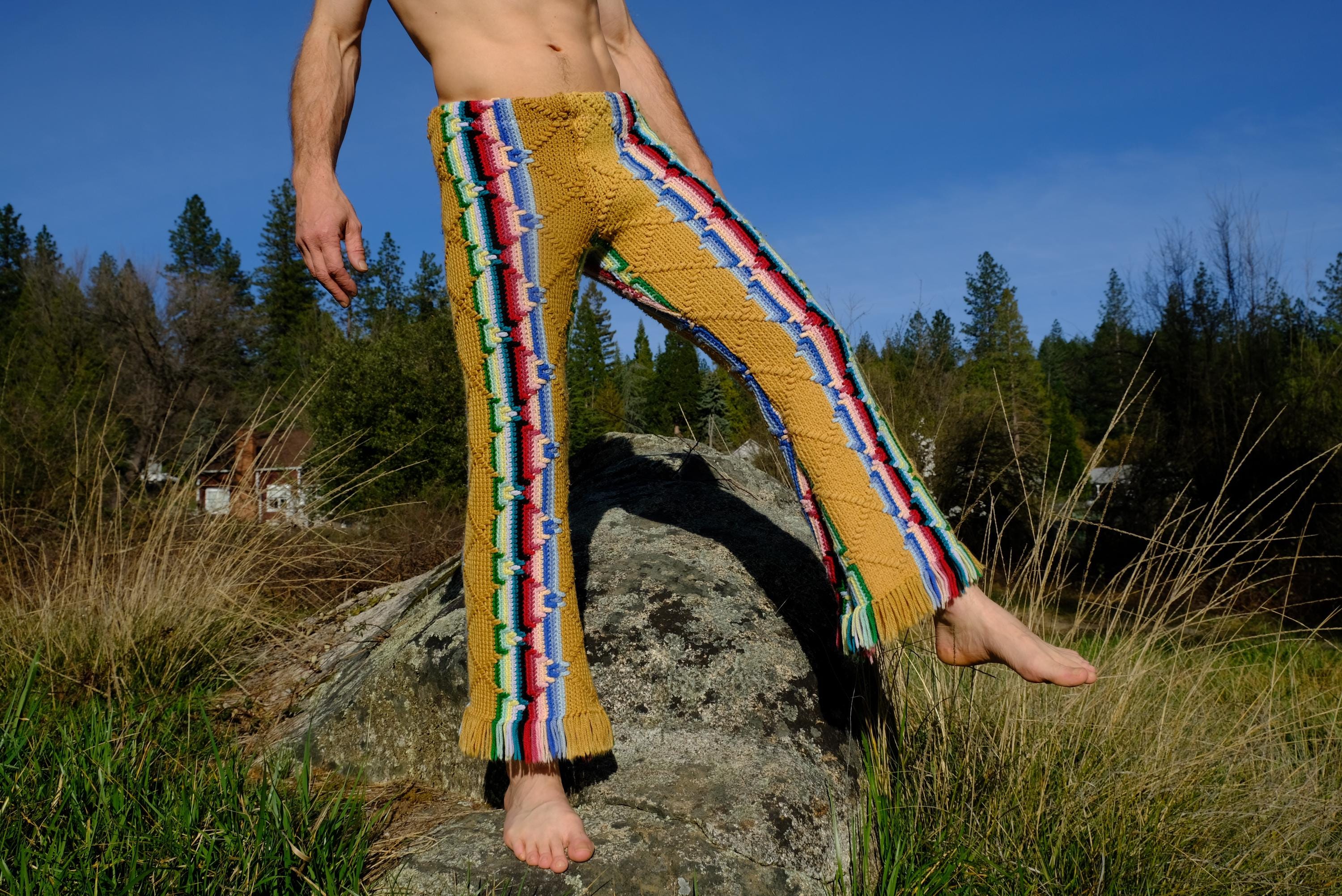 These are crochet pant in multicolor acid stripes. Fashioned from a vintage afghan blanket crocheted in 100% acrylic yarn.