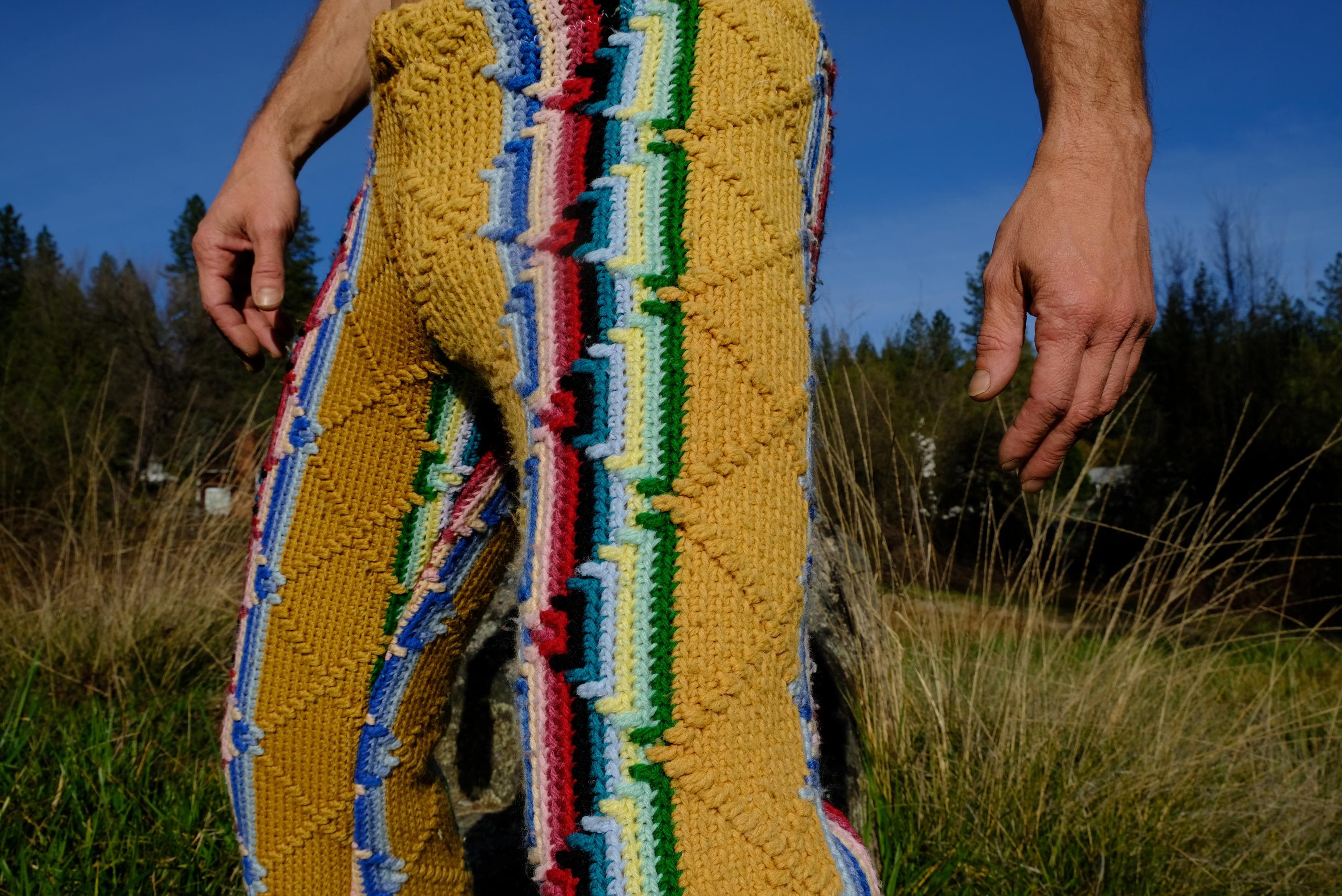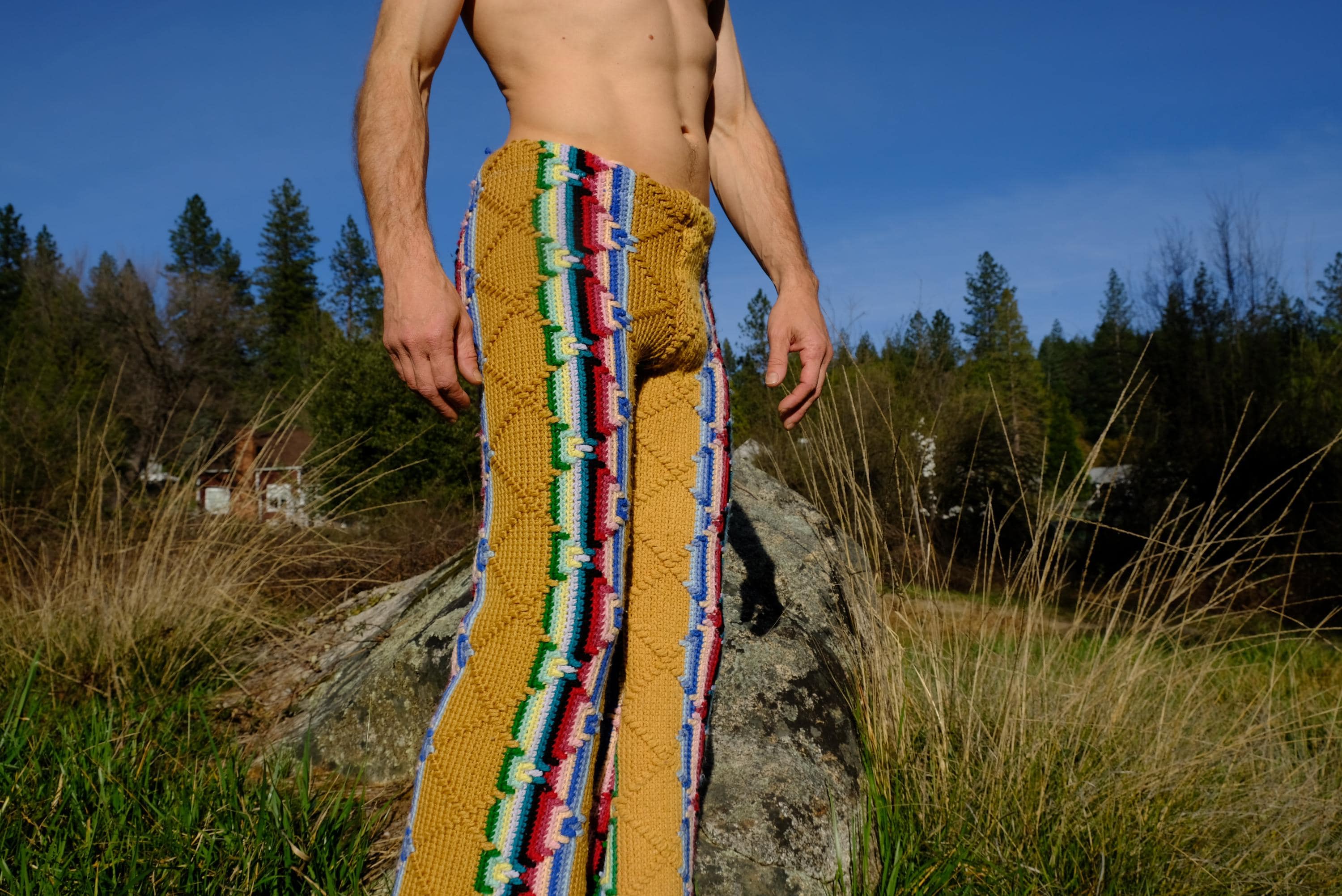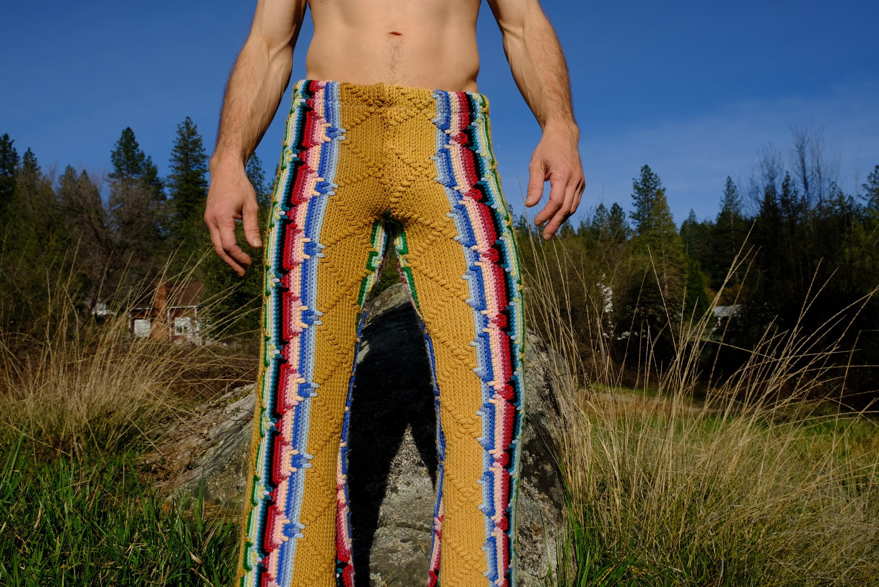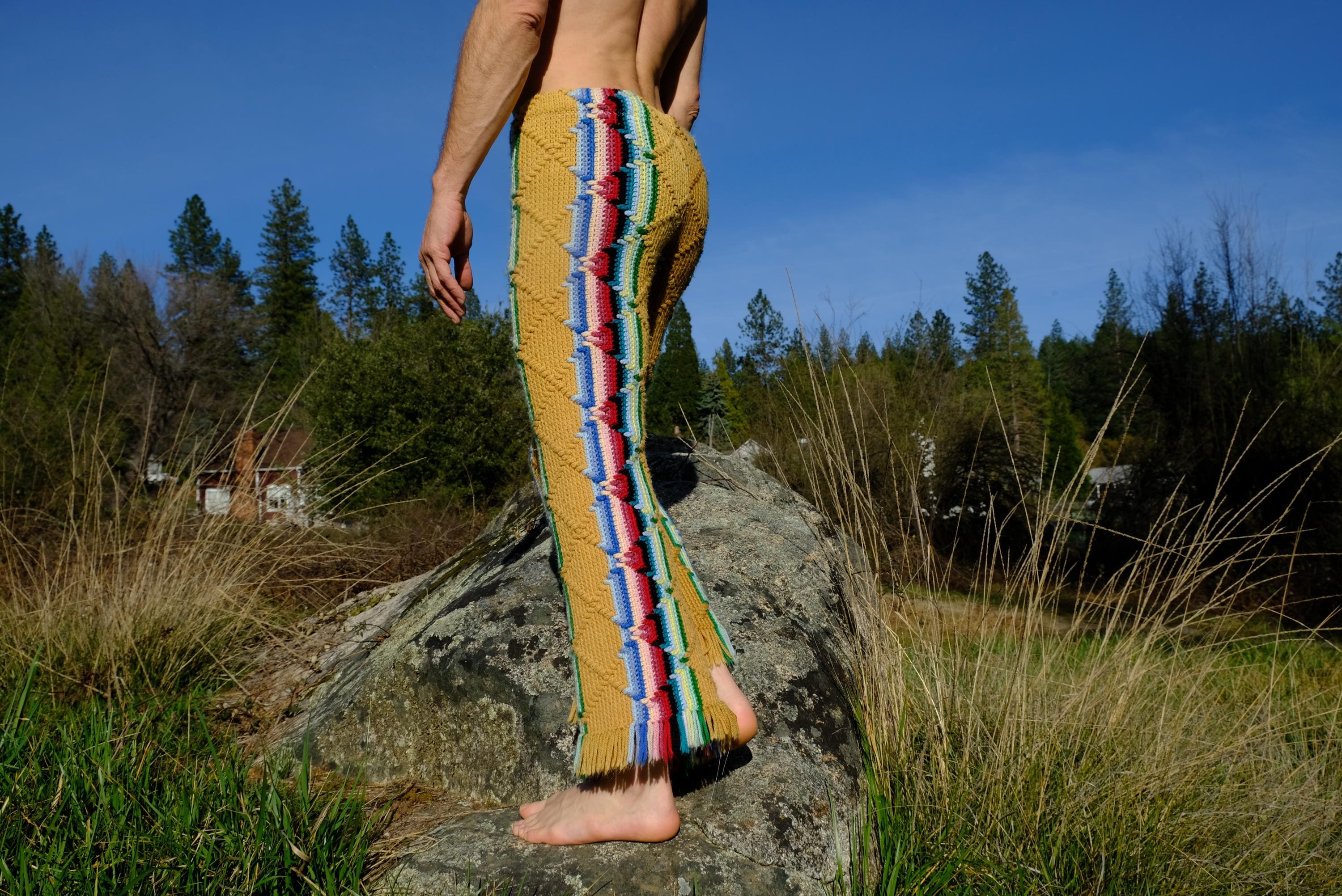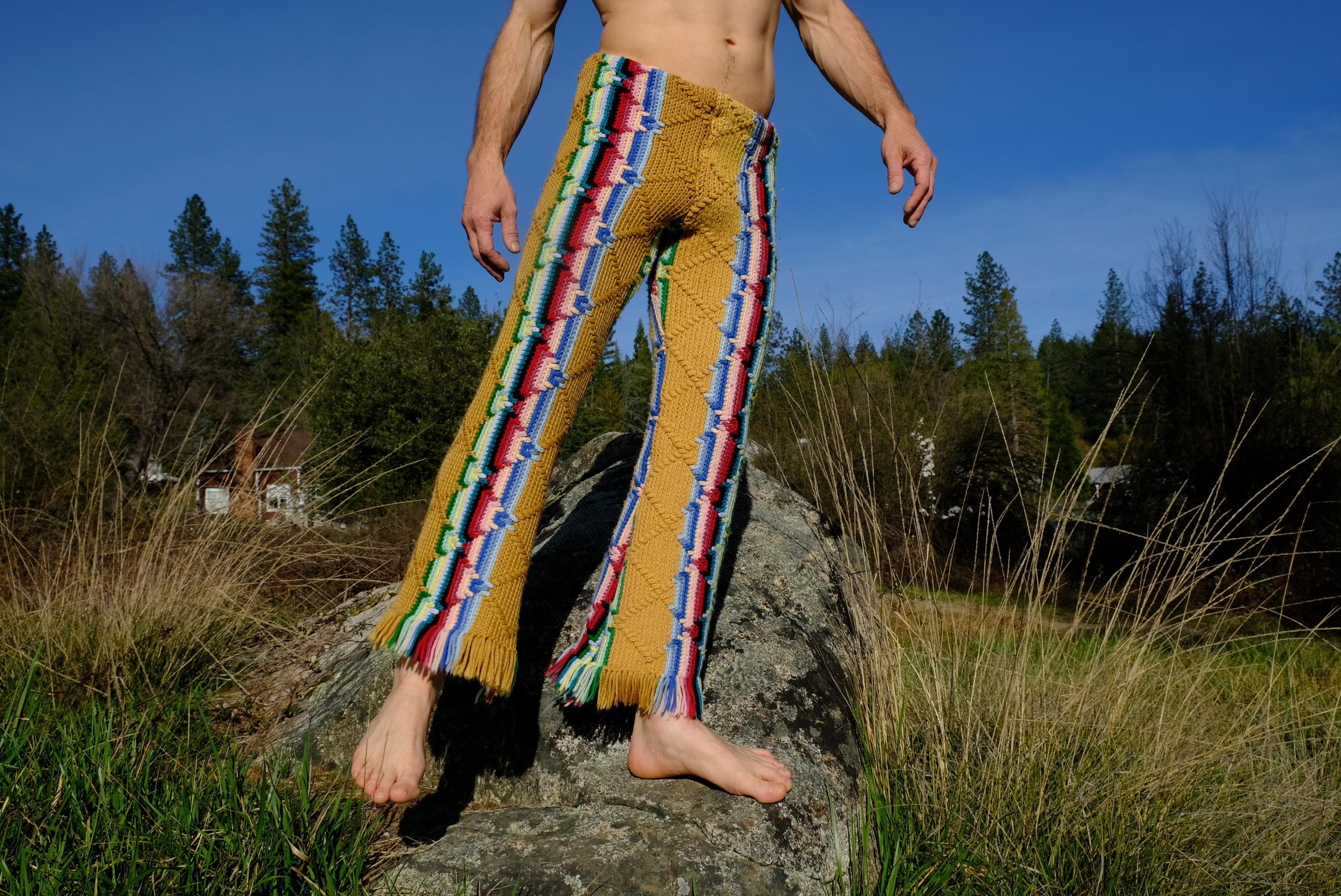 These are crochet pant in multicolor acid stripes. Fashioned from a vintage afghan blanket crocheted in 100% acrylic yarn.