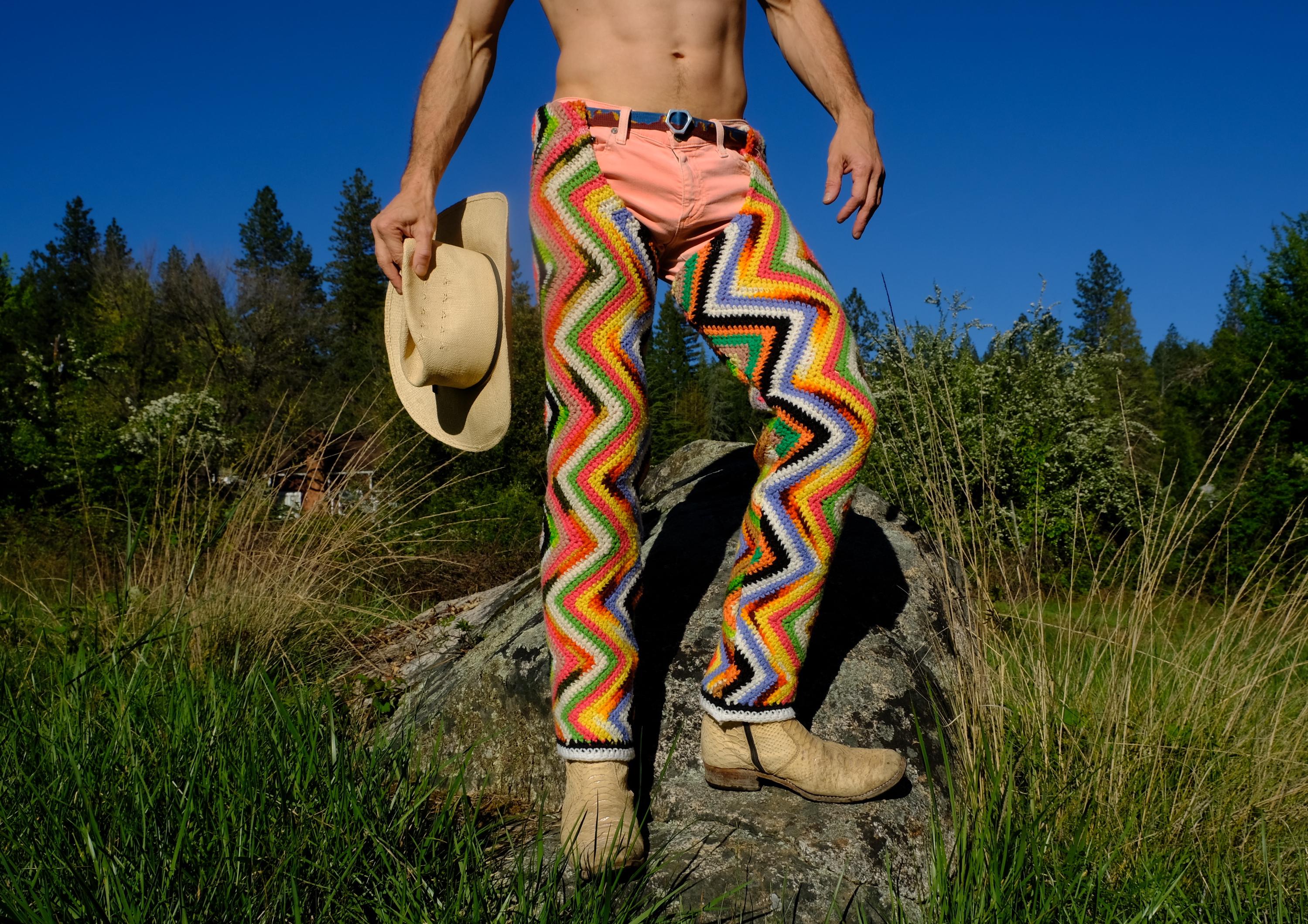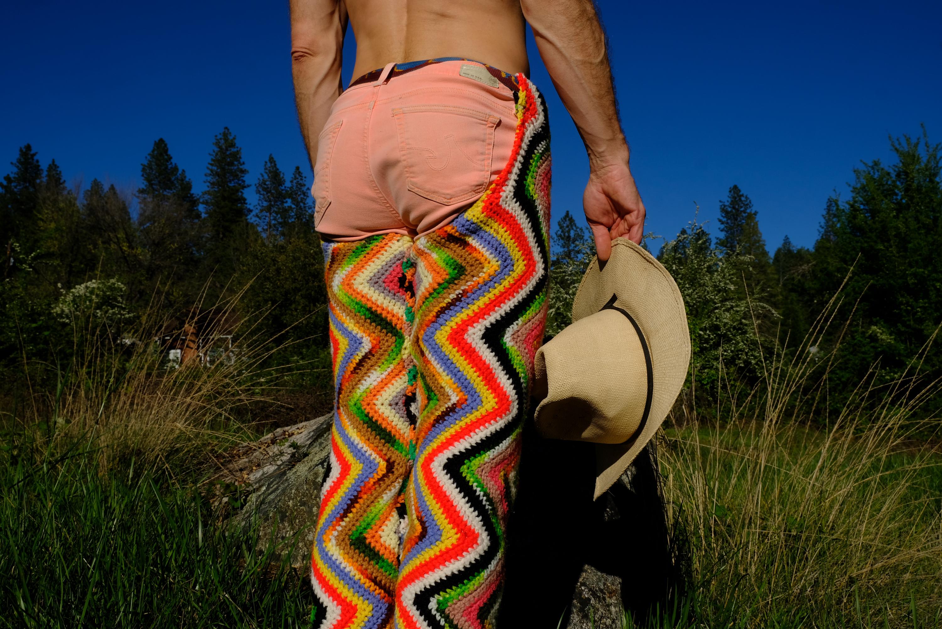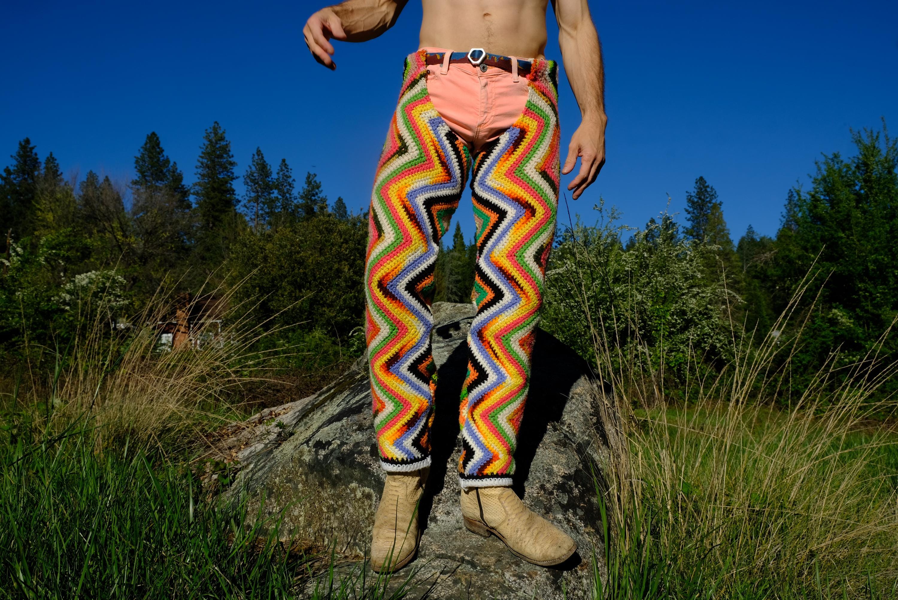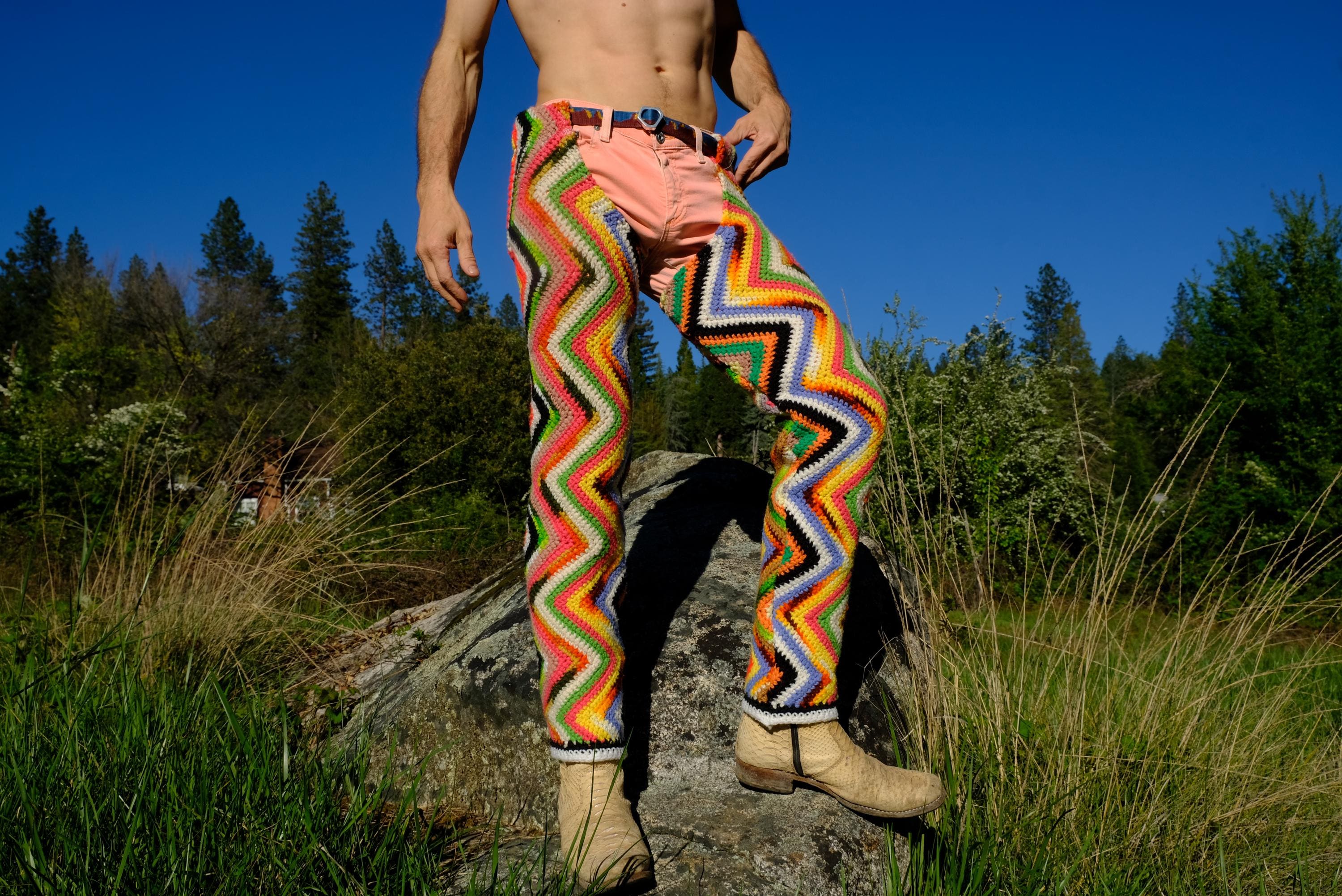 These are crochet chaps with colorful zigzag stripes. Fashioned from a vintage afghan blanket knitted in 100% acrylic yarn.