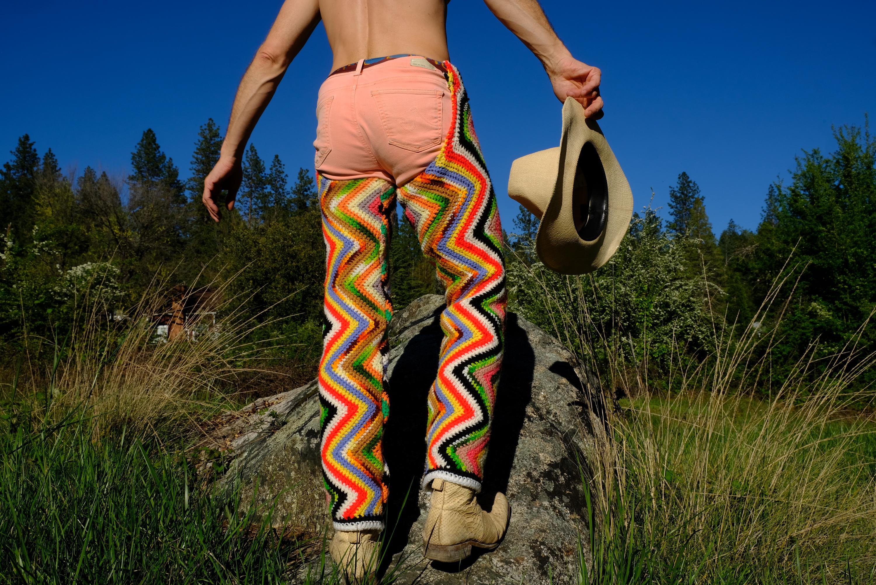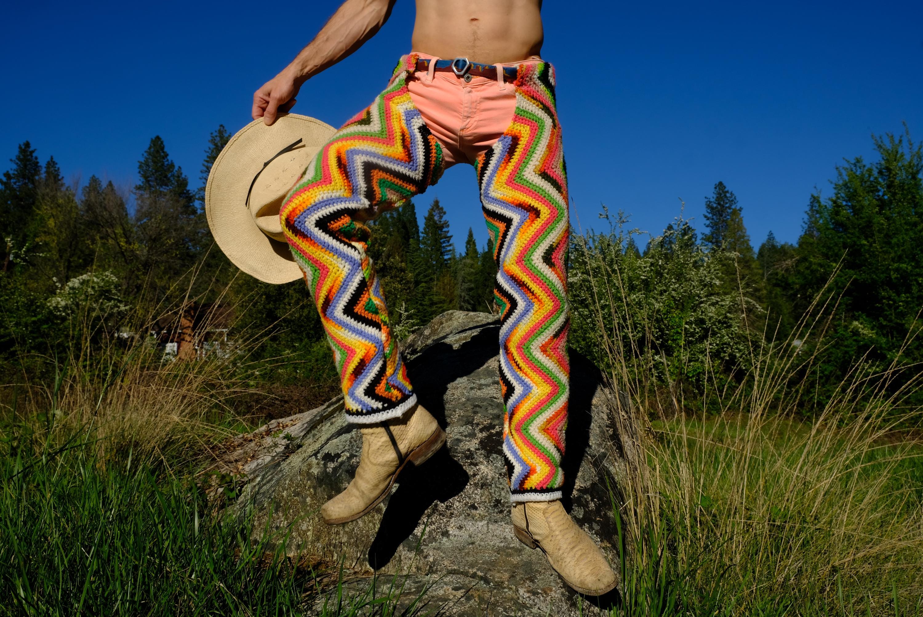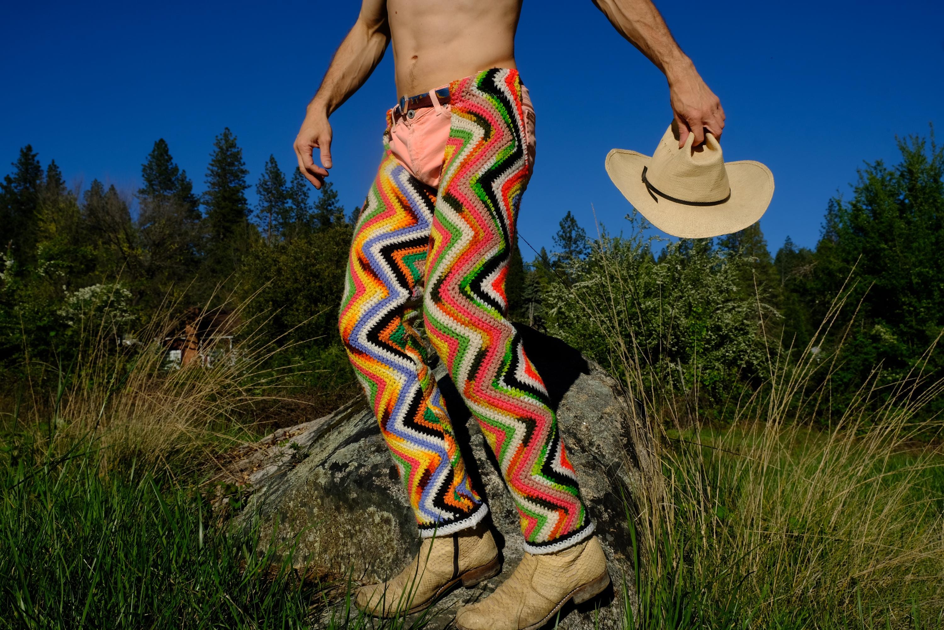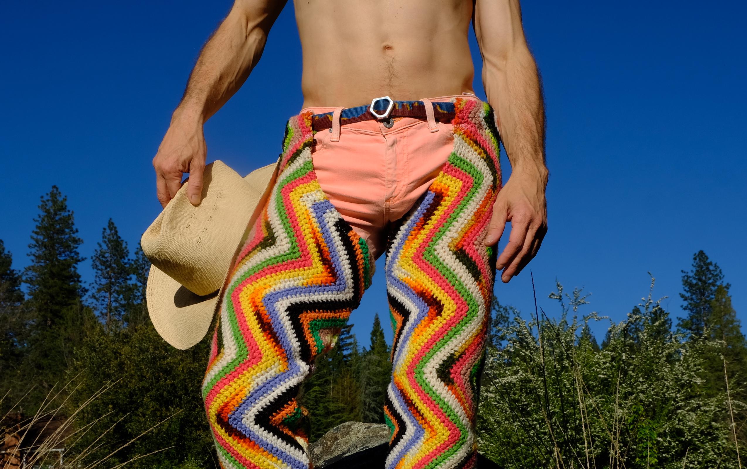 These are crochet chaps with colorful zigzag stripes. Fashioned from a vintage afghan blanket knitted in 100% acrylic yarn.