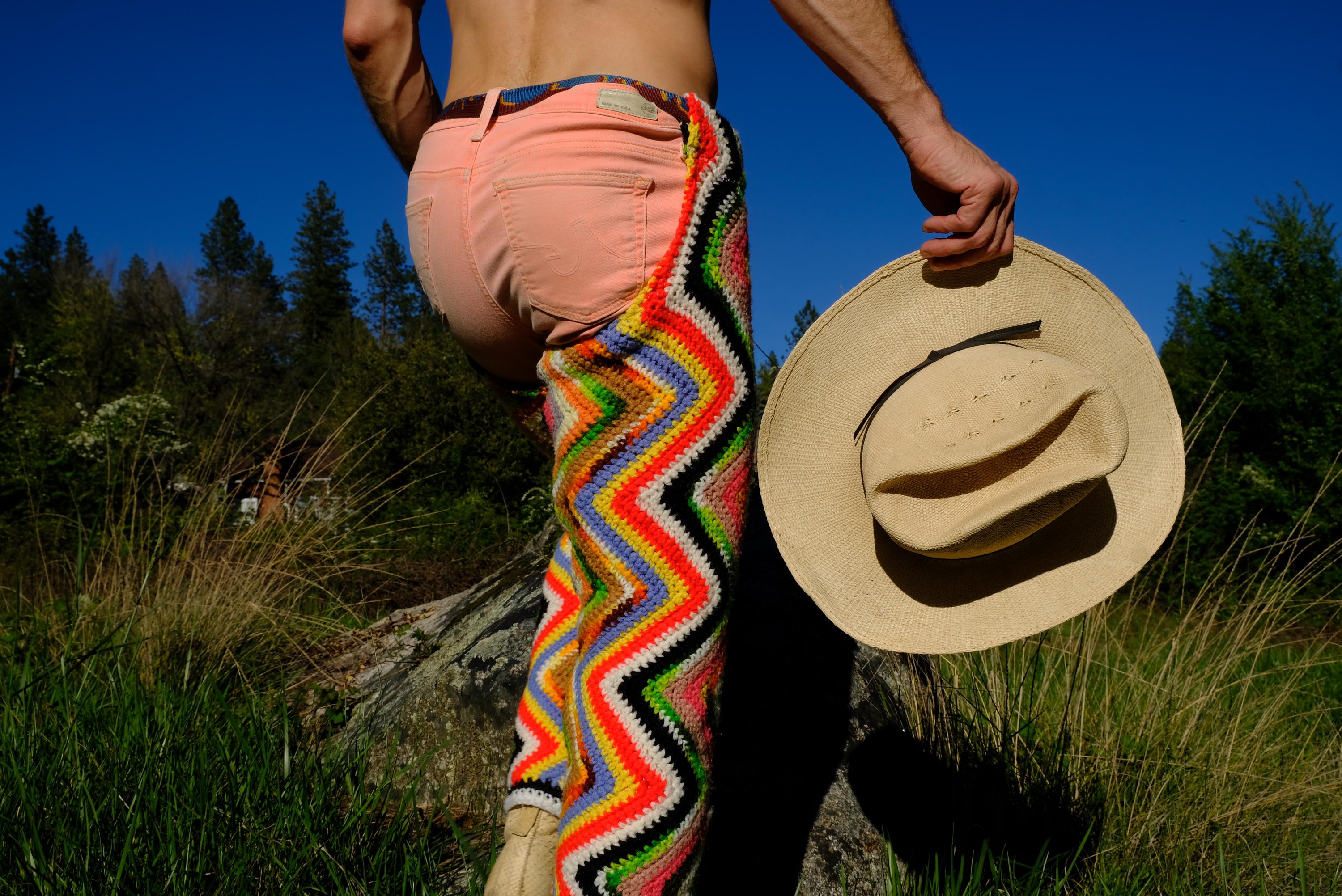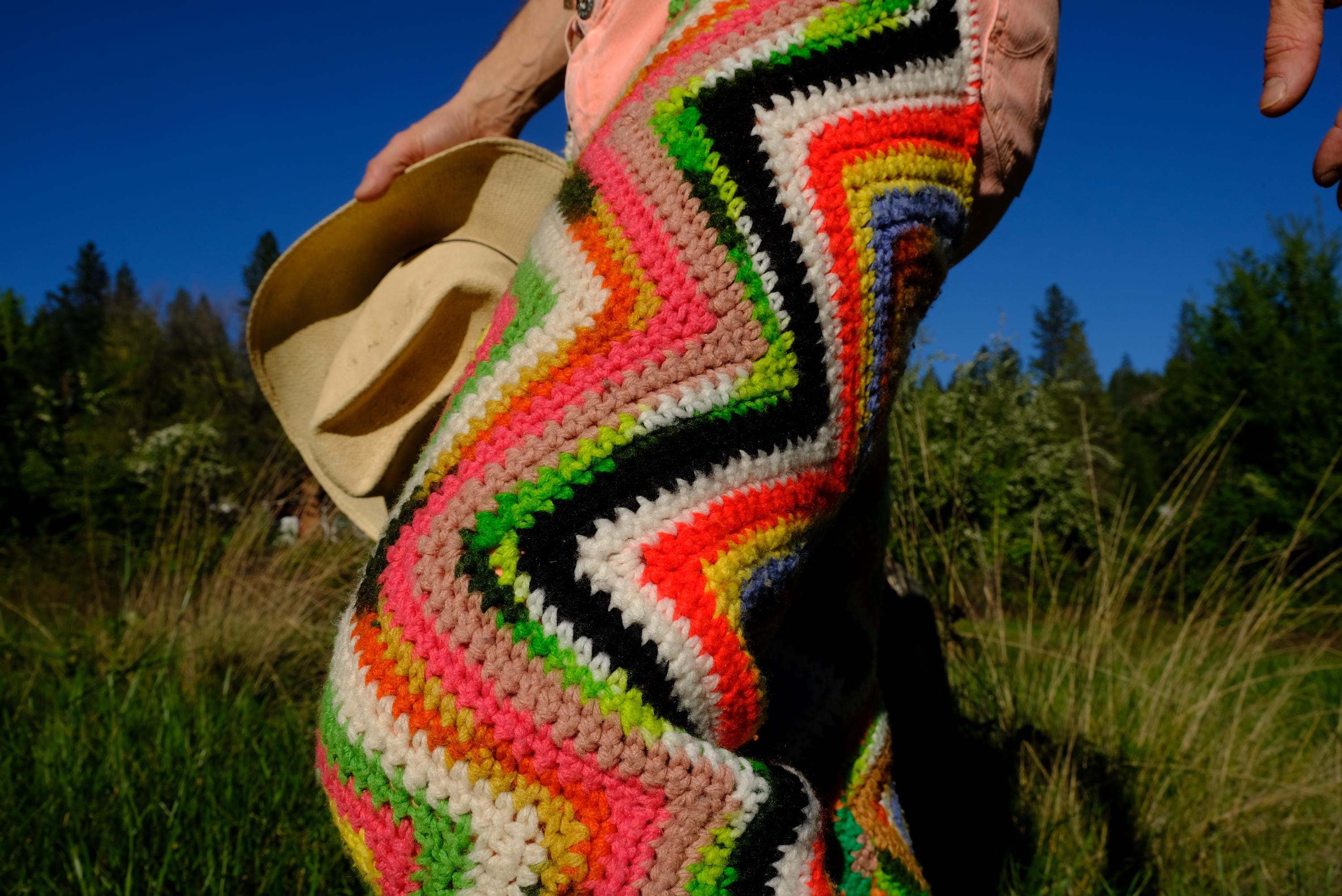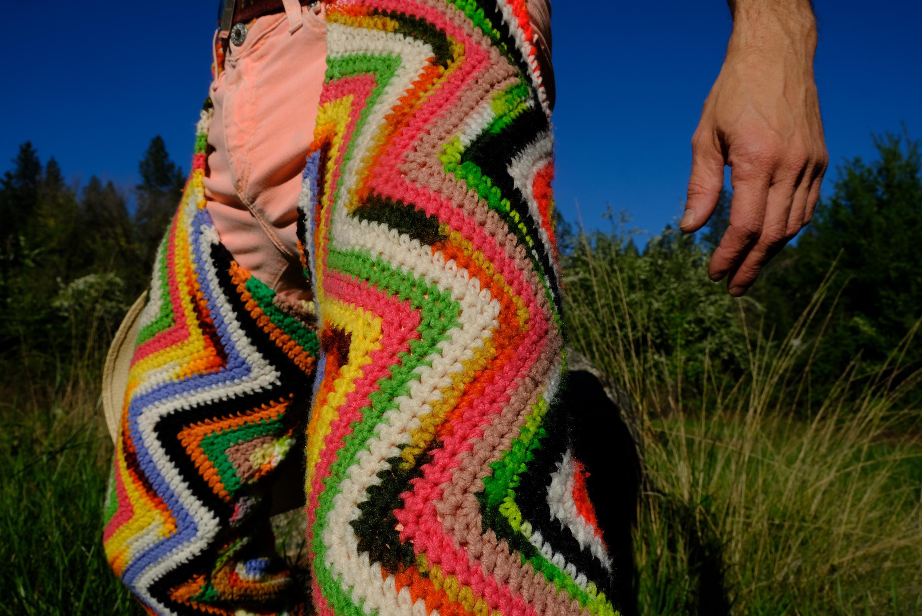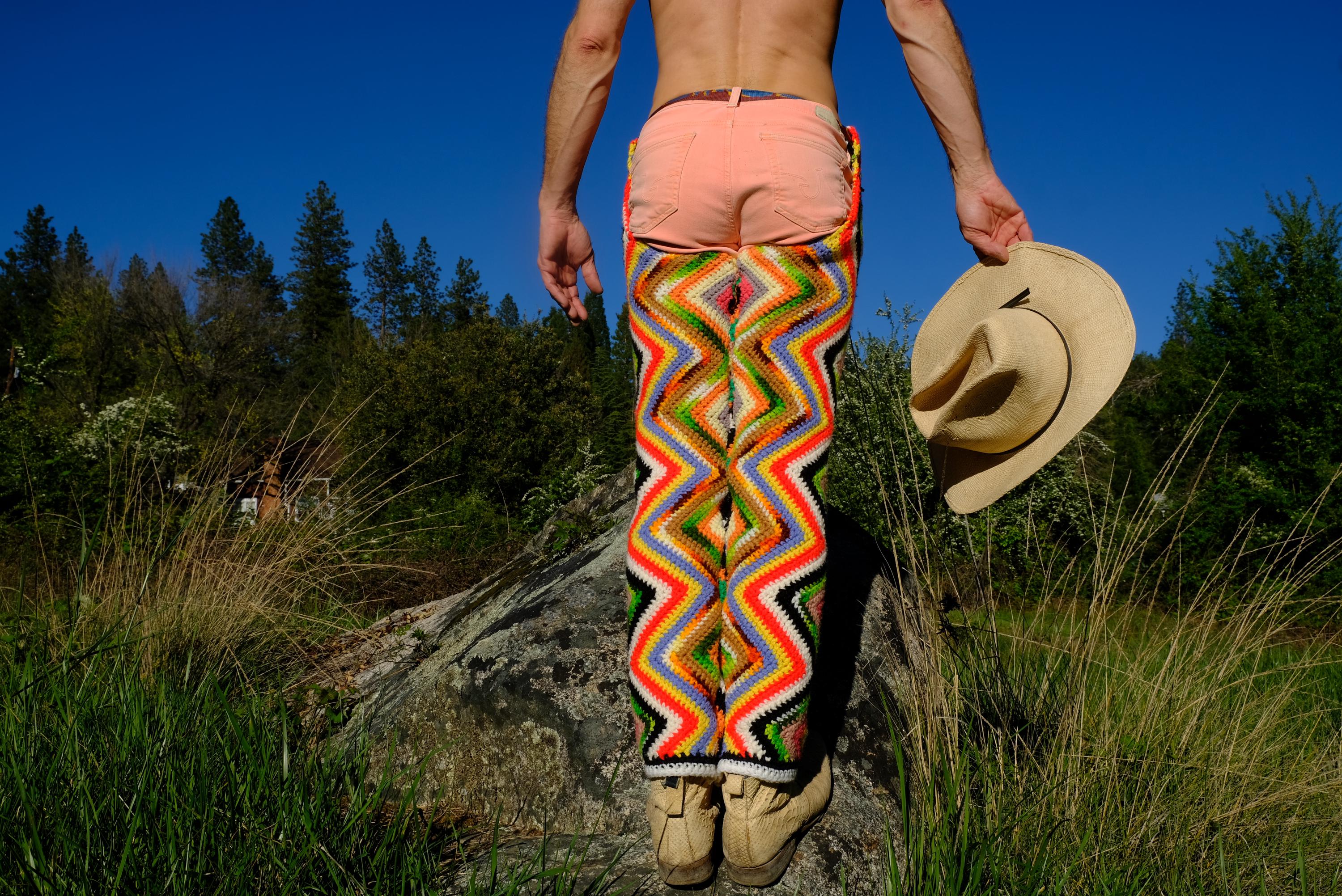 These are crochet chaps with colorful zigzag stripes. Fashioned from a vintage afghan blanket knitted in 100% acrylic yarn.