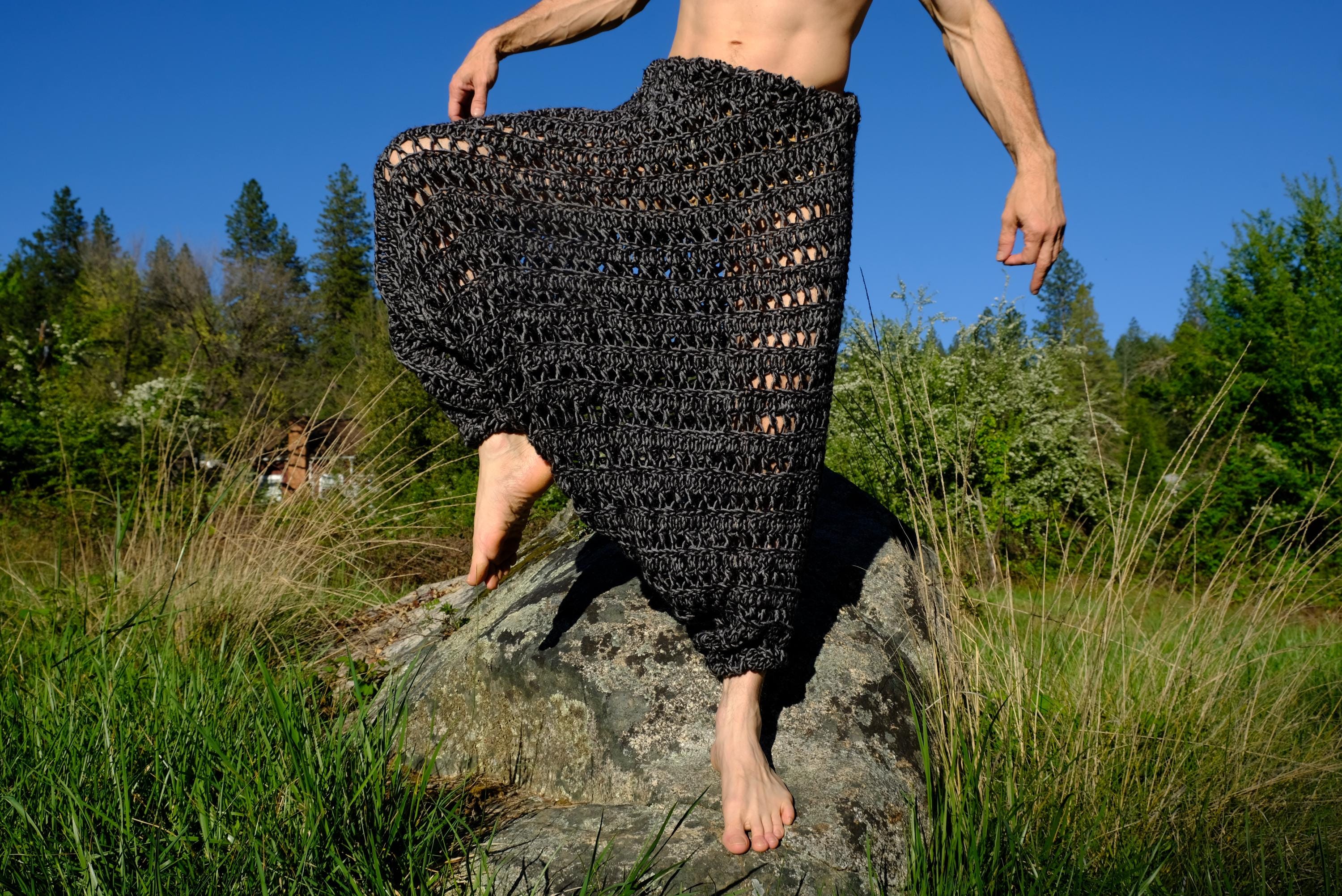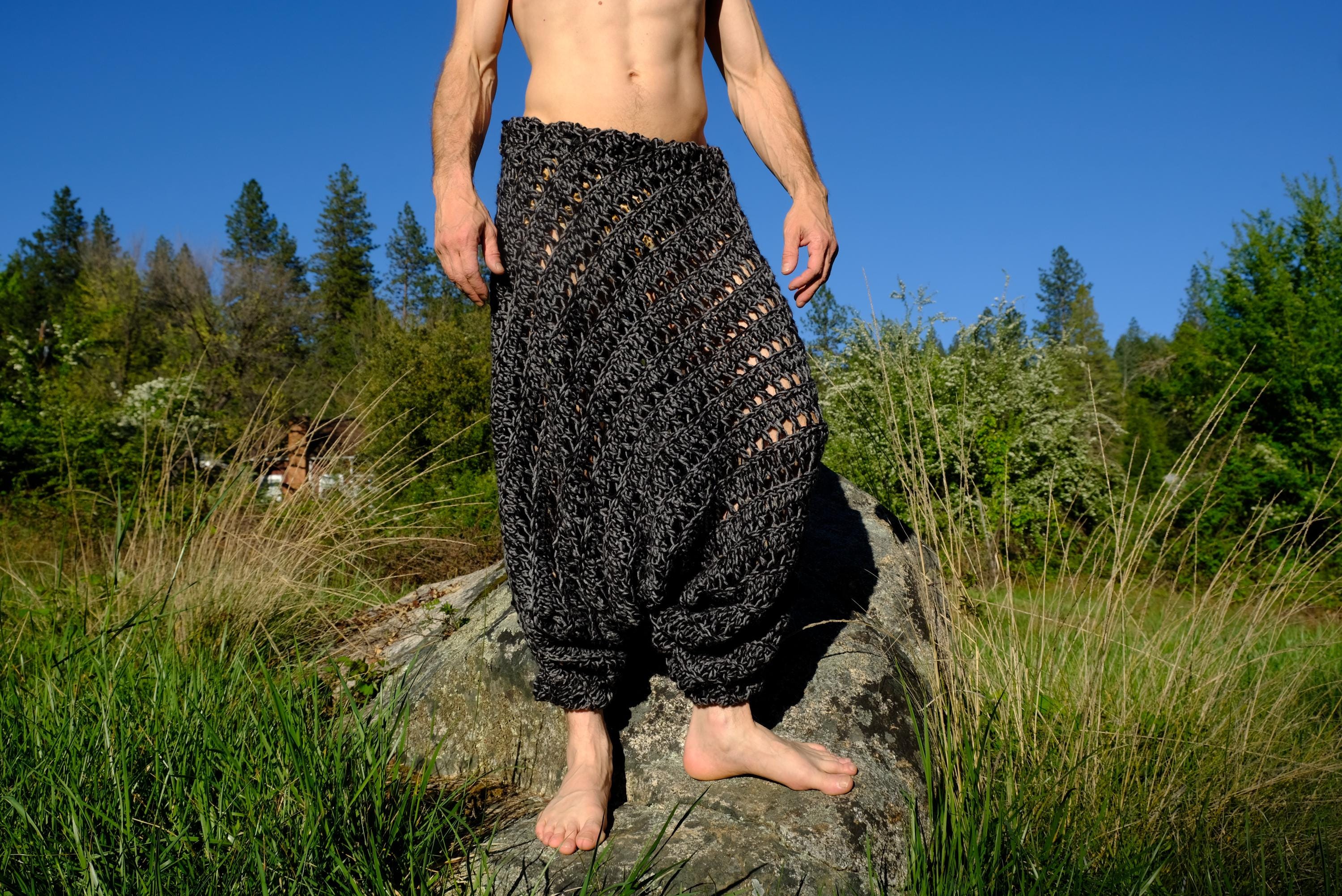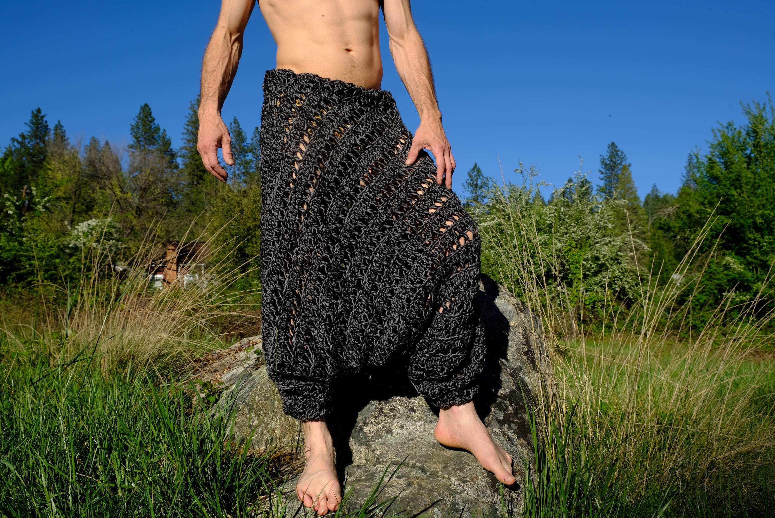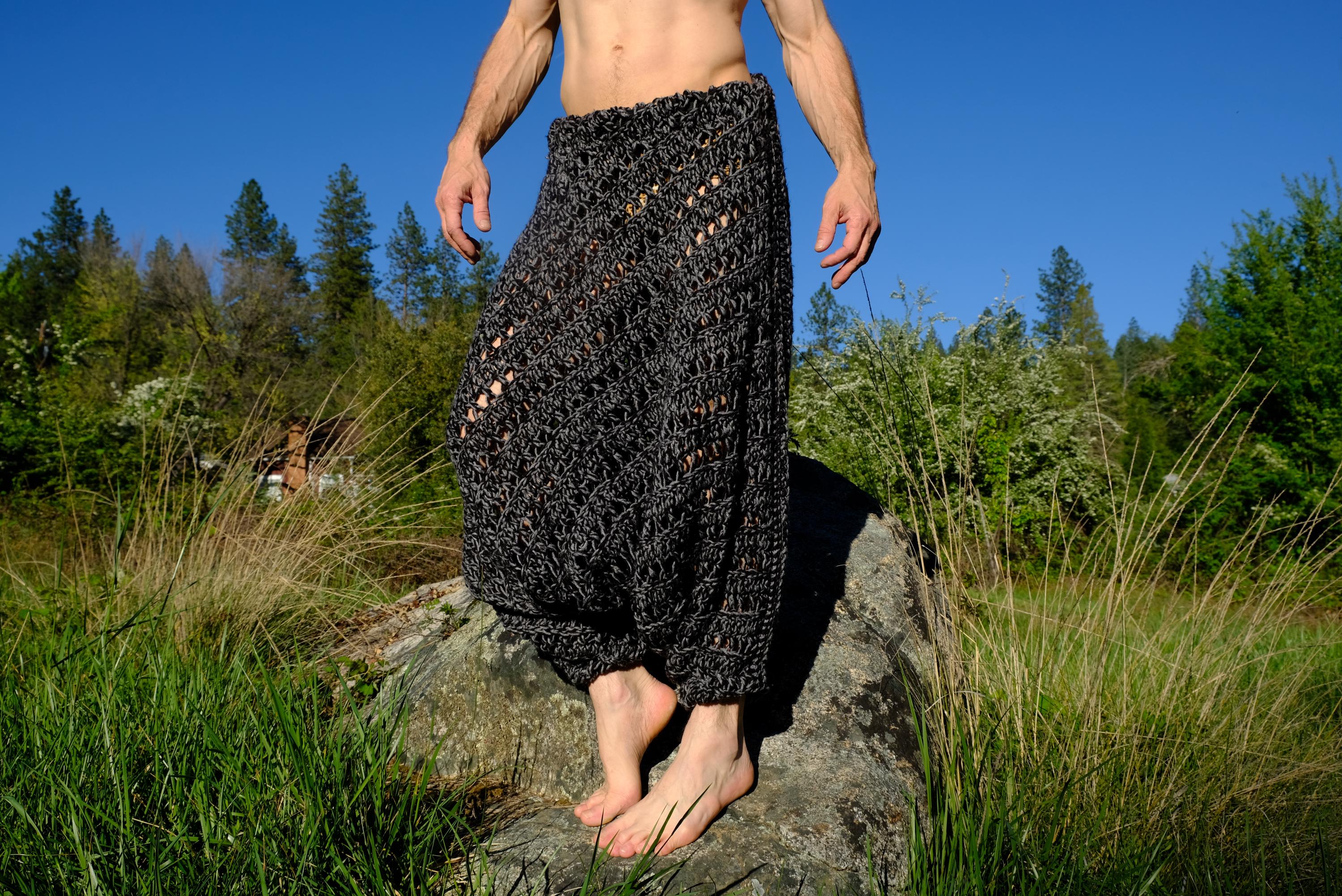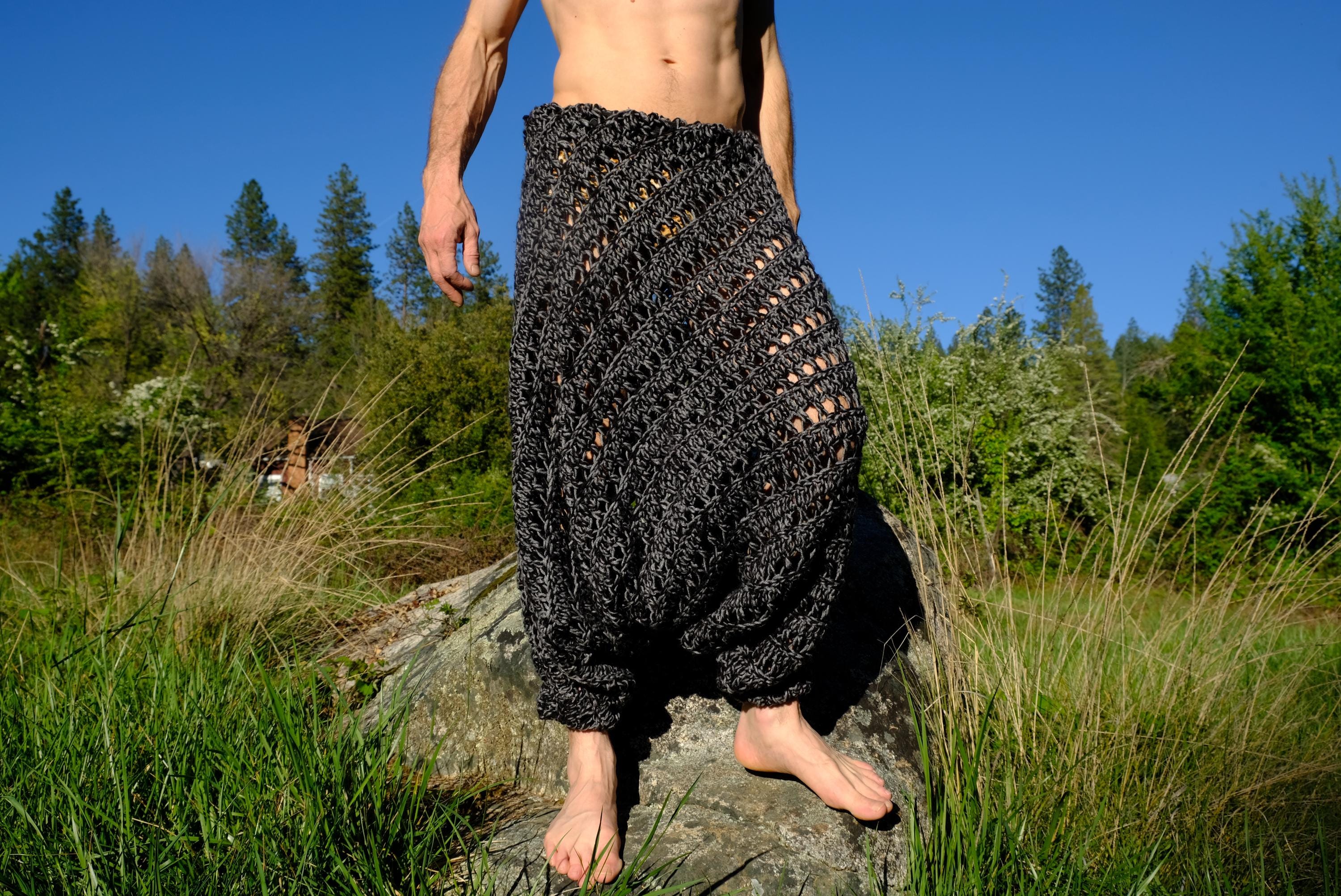 These are crochet harem pants in a 2 tone black and gray open weave net pattern. Fashioned from a vintage afghan blanket crocheted in 100% acrylic yarn.
