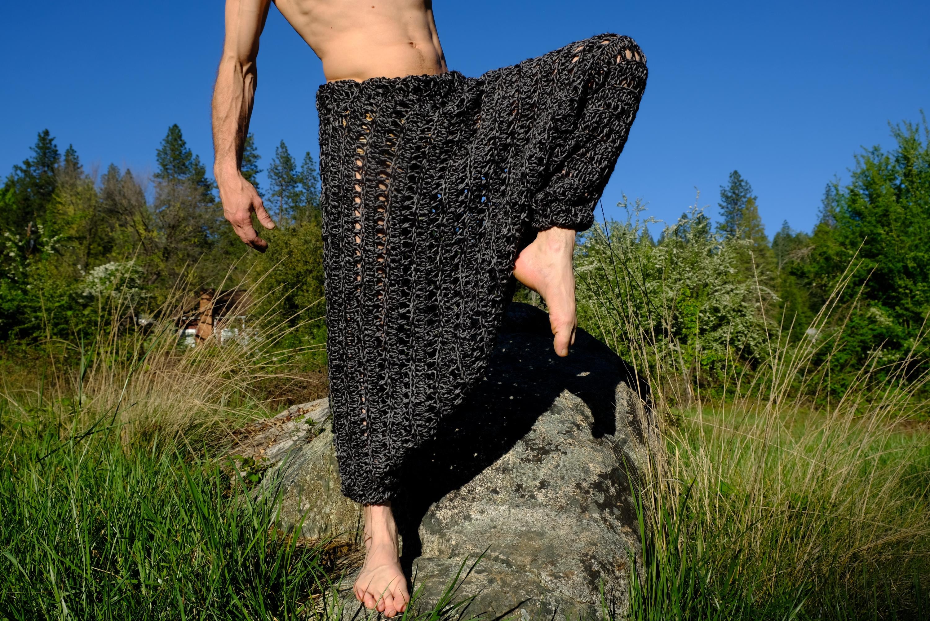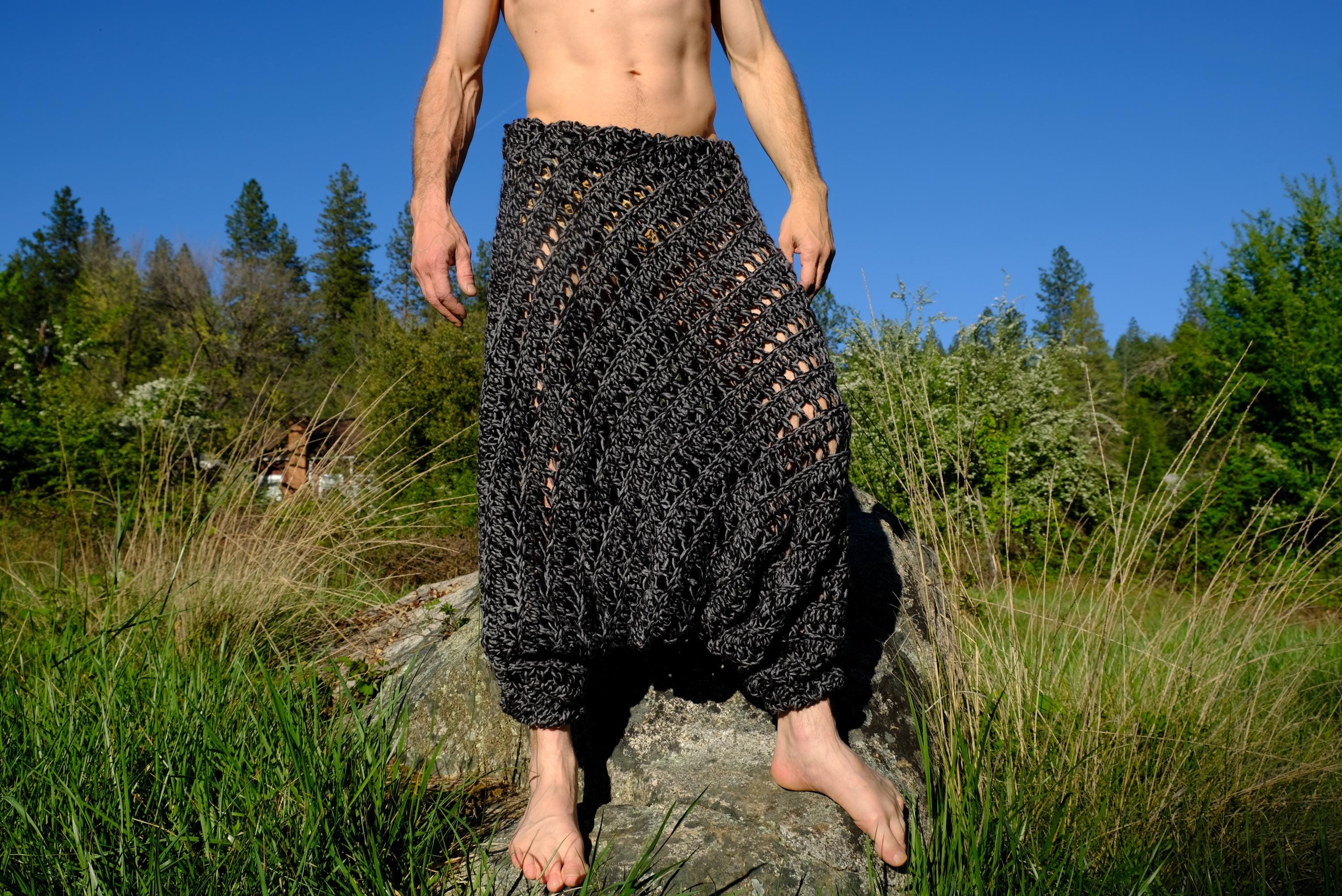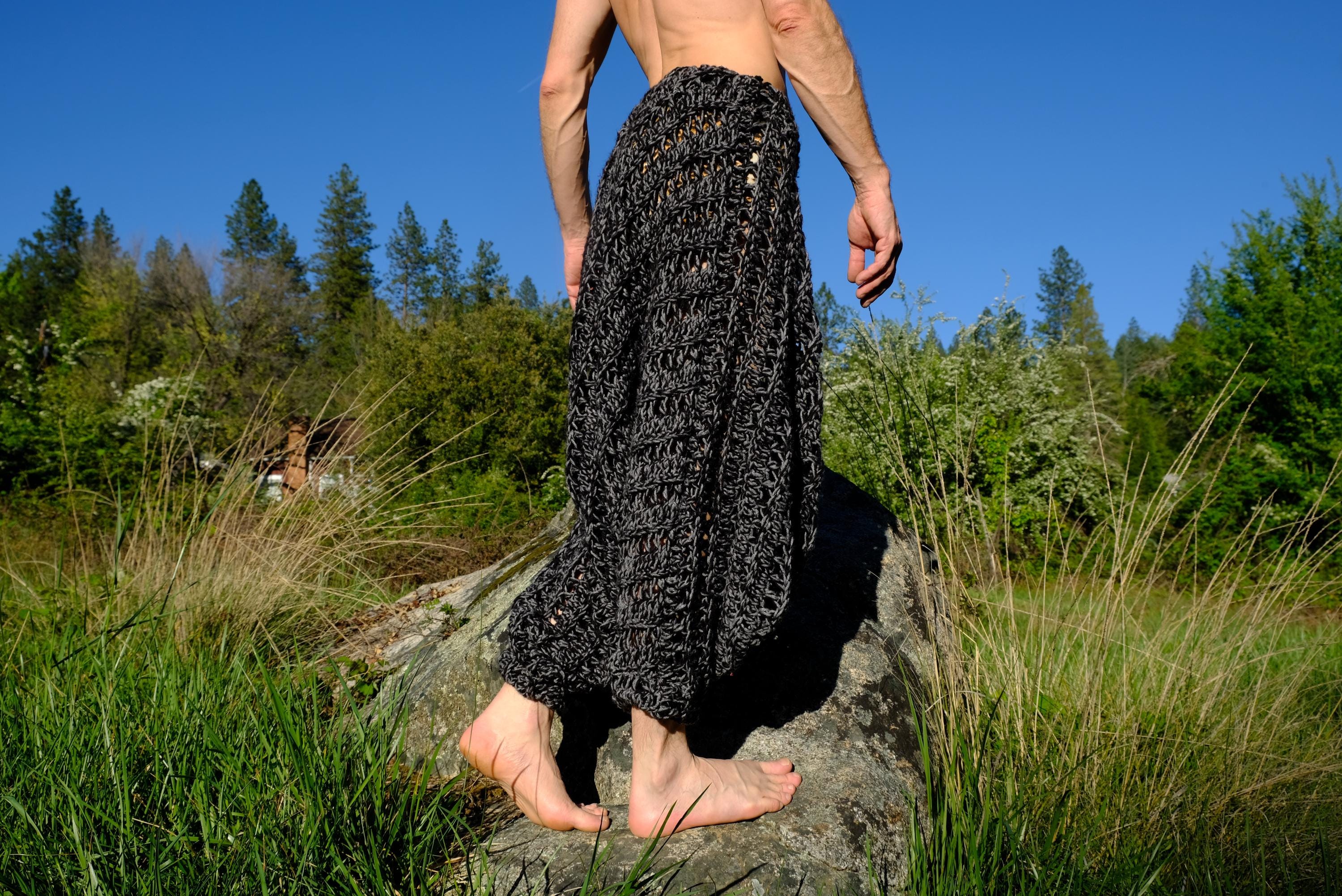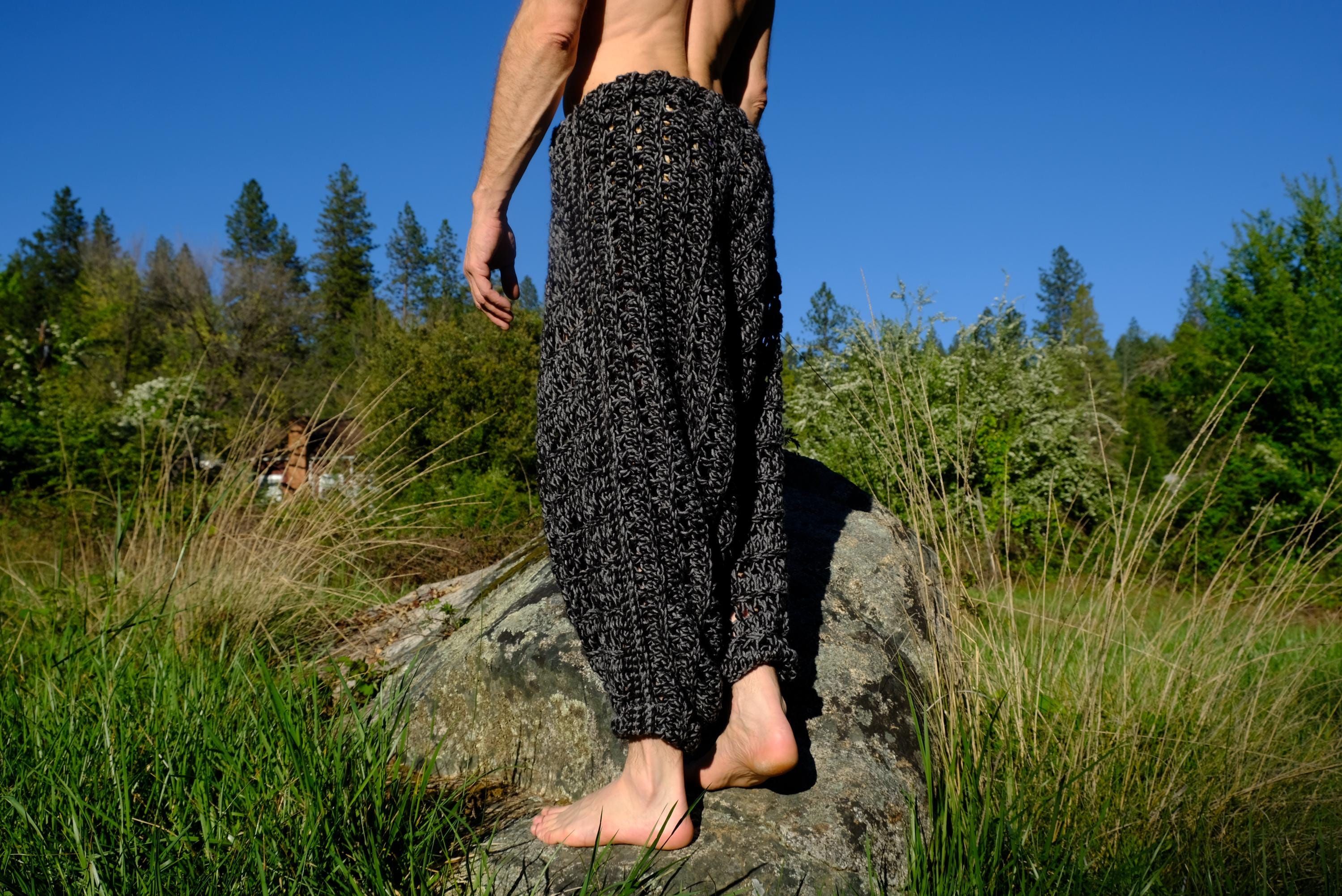 These are crochet harem pants in a 2 tone black and gray open weave net pattern. Fashioned from a vintage afghan blanket crocheted in 100% acrylic yarn.