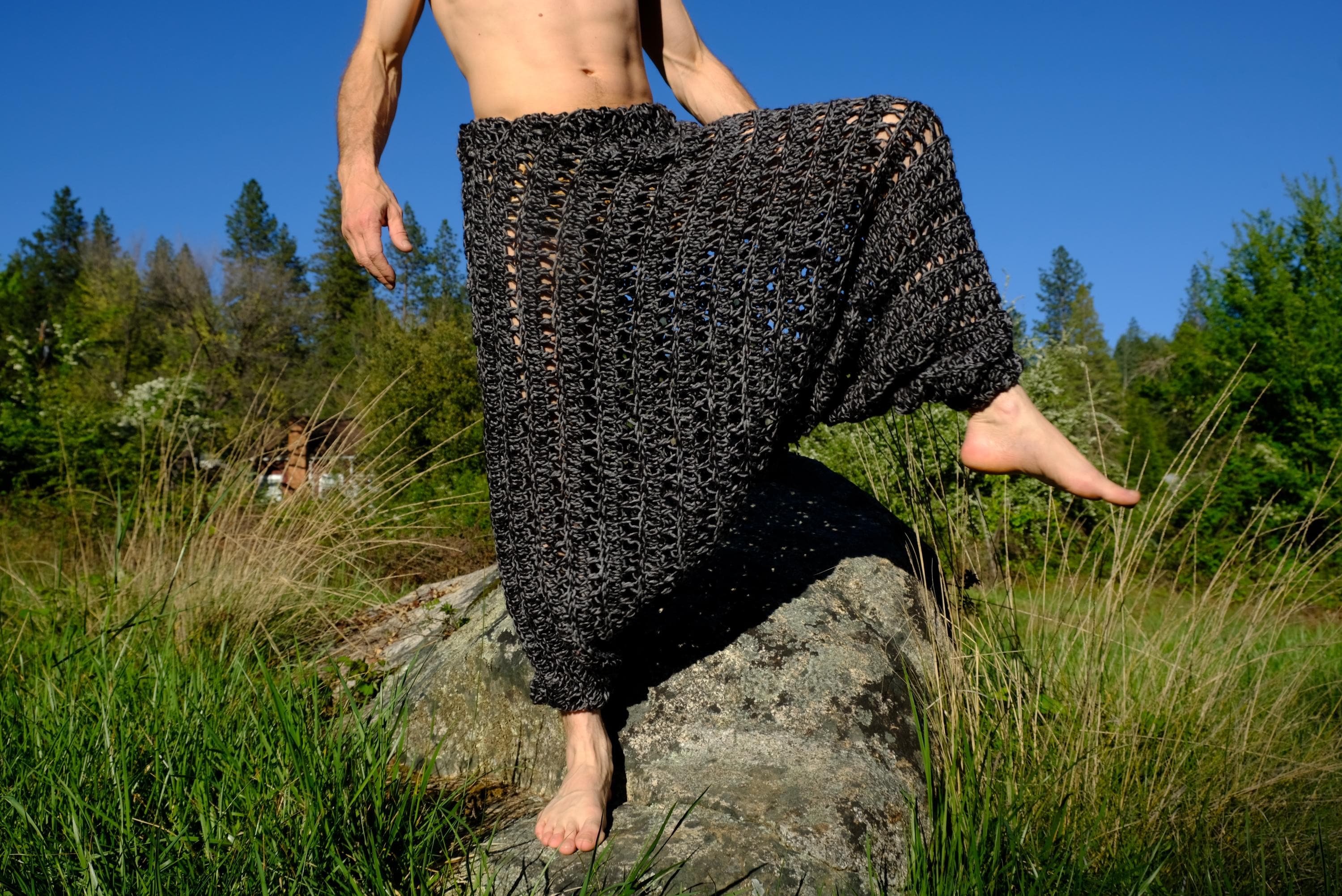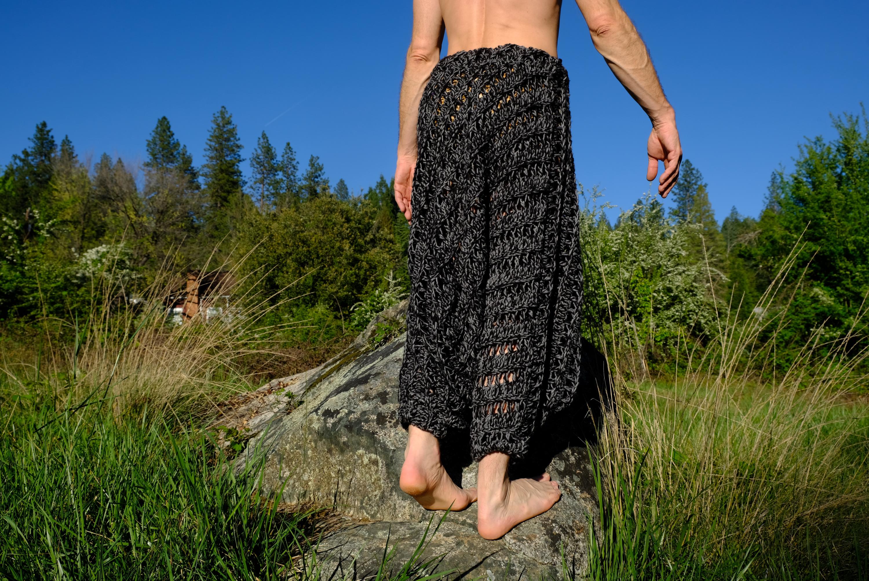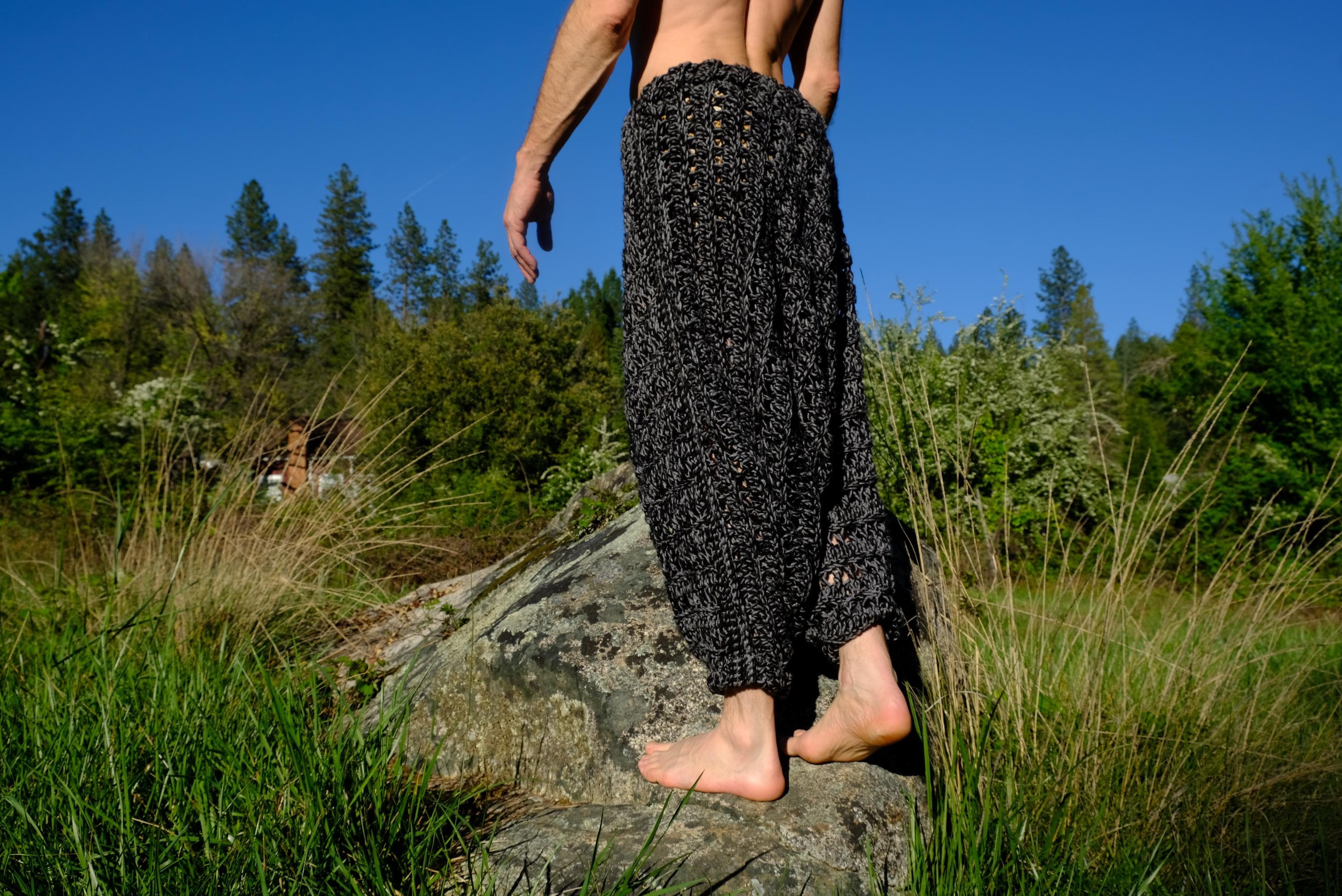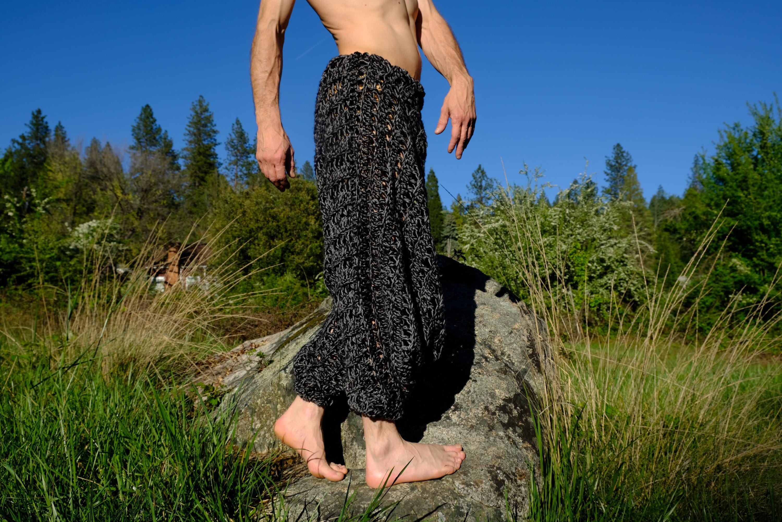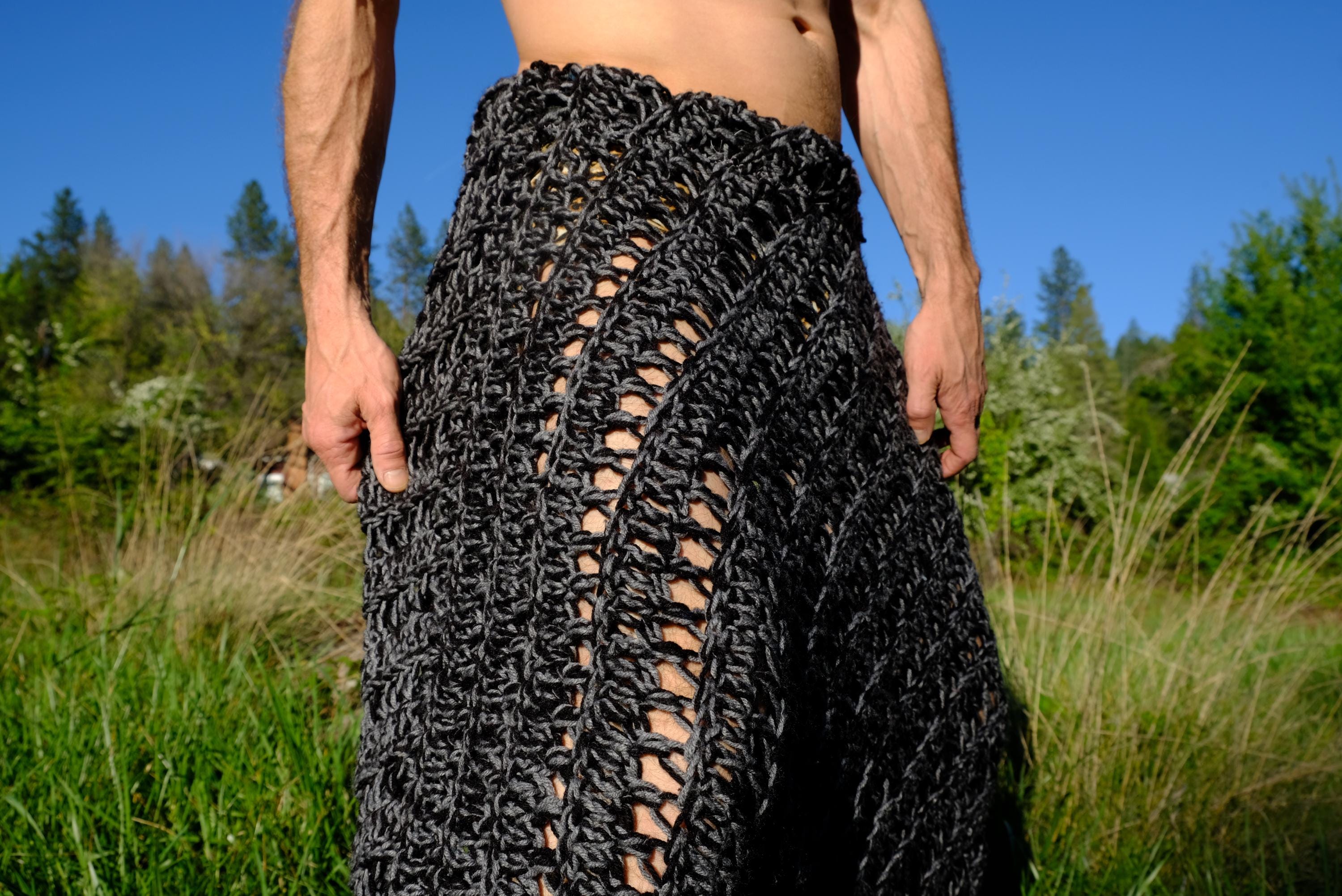 These are crochet harem pants in a 2 tone black and gray open weave net pattern. Fashioned from a vintage afghan blanket crocheted in 100% acrylic yarn.
