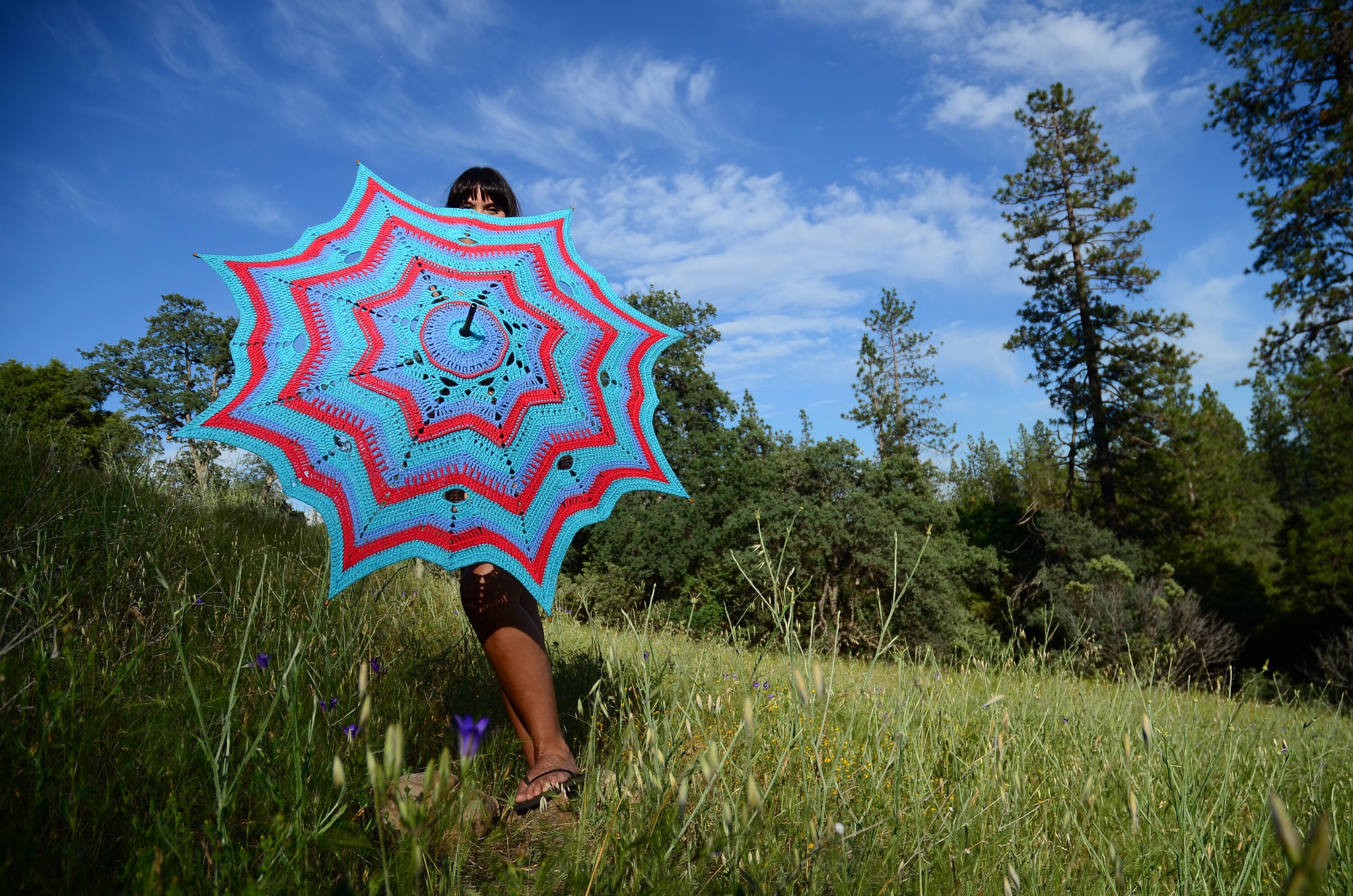 This is a crochet parasol in vibrant shades of watermelon and turquoise. Shade yourself in high fashion--its vibrant and electric style is always a hit!!!