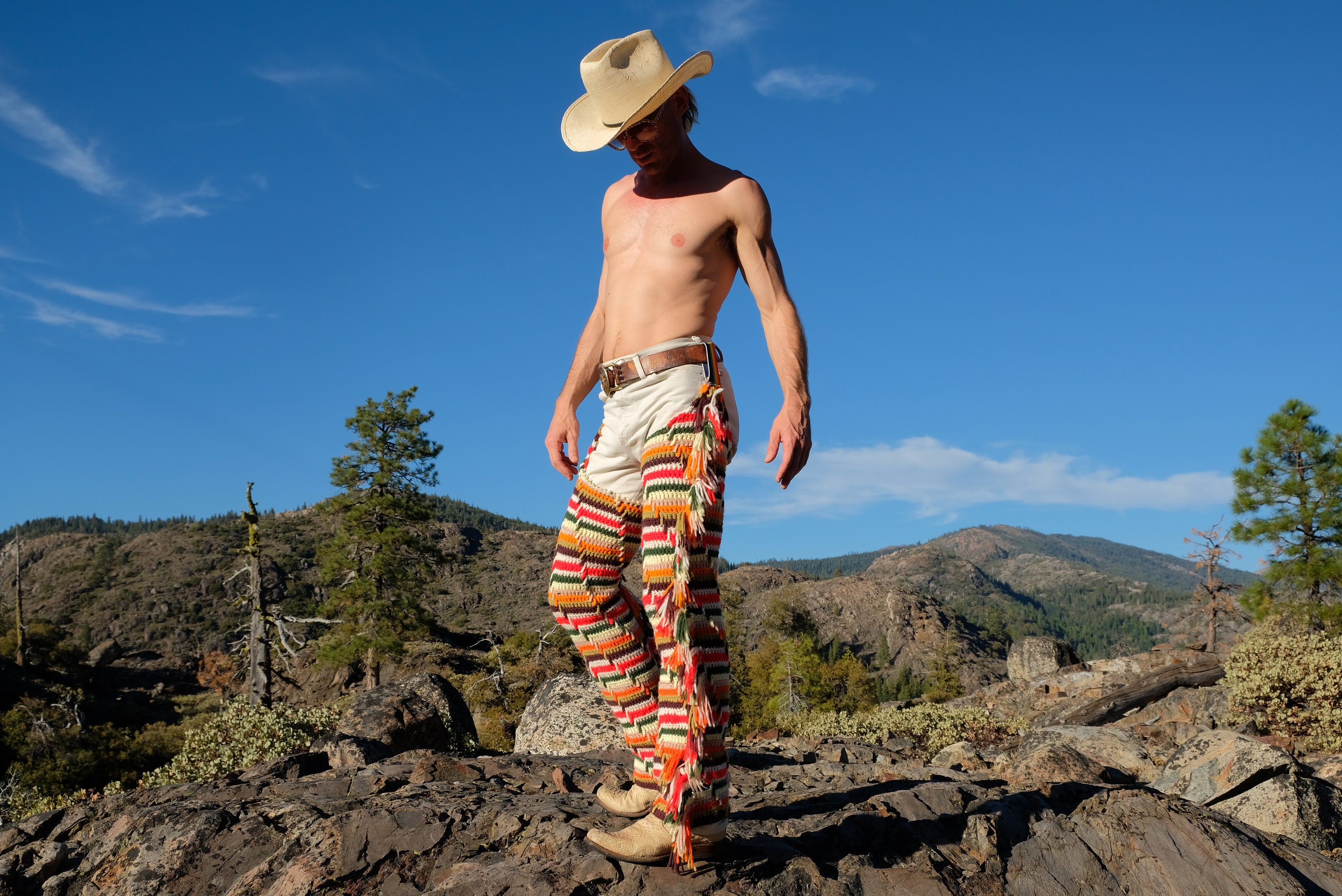 These are crochet chaps with alternating black and white legs. Fashioned from a vintage afghan blanket crocheted in acrylic yarn.